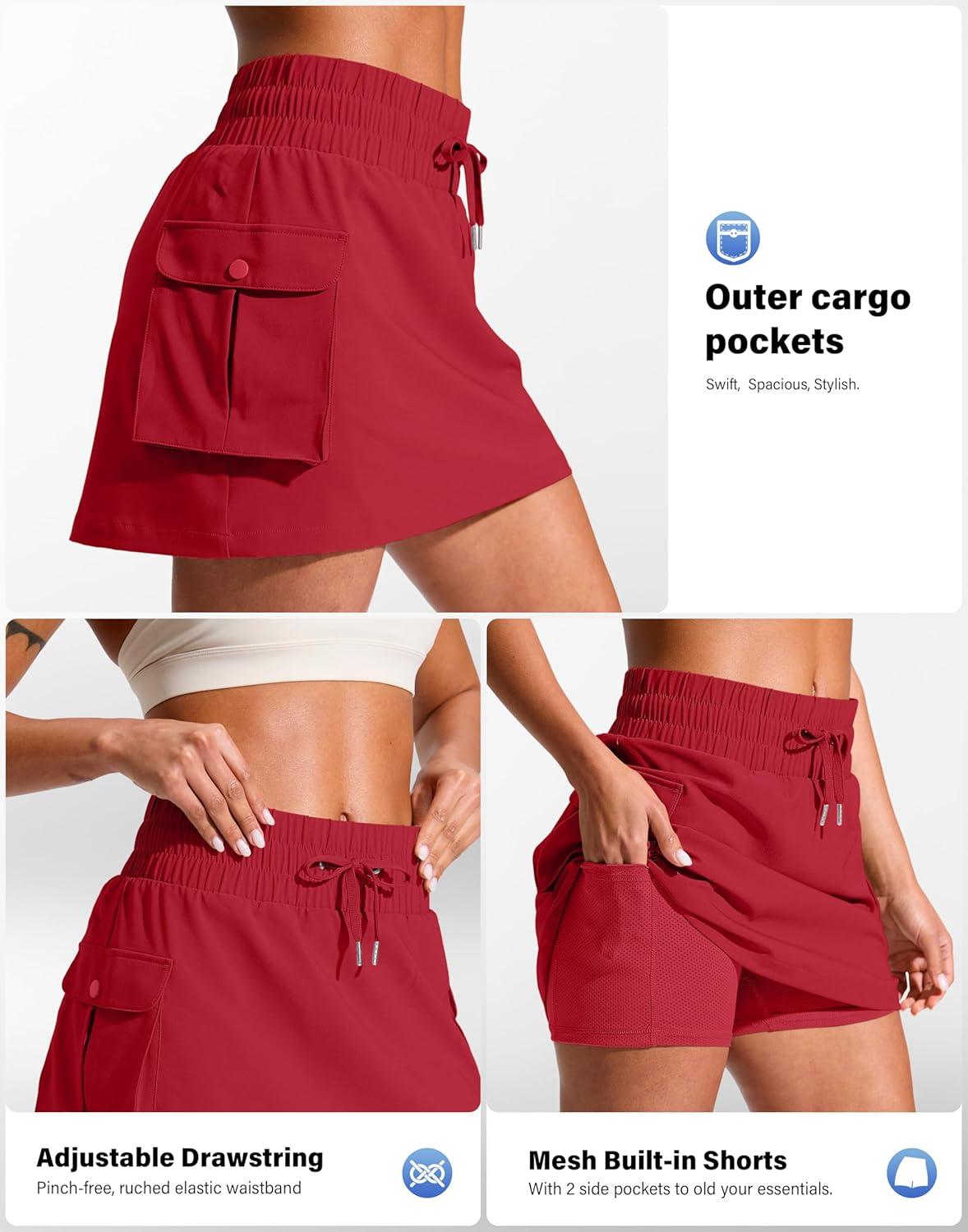 SANTINY 14″ Cargo Skorts for Women with 4 Pockets Drawstring High Waisted Golf Hiking Skirt for Casual Summer Travel(Red)