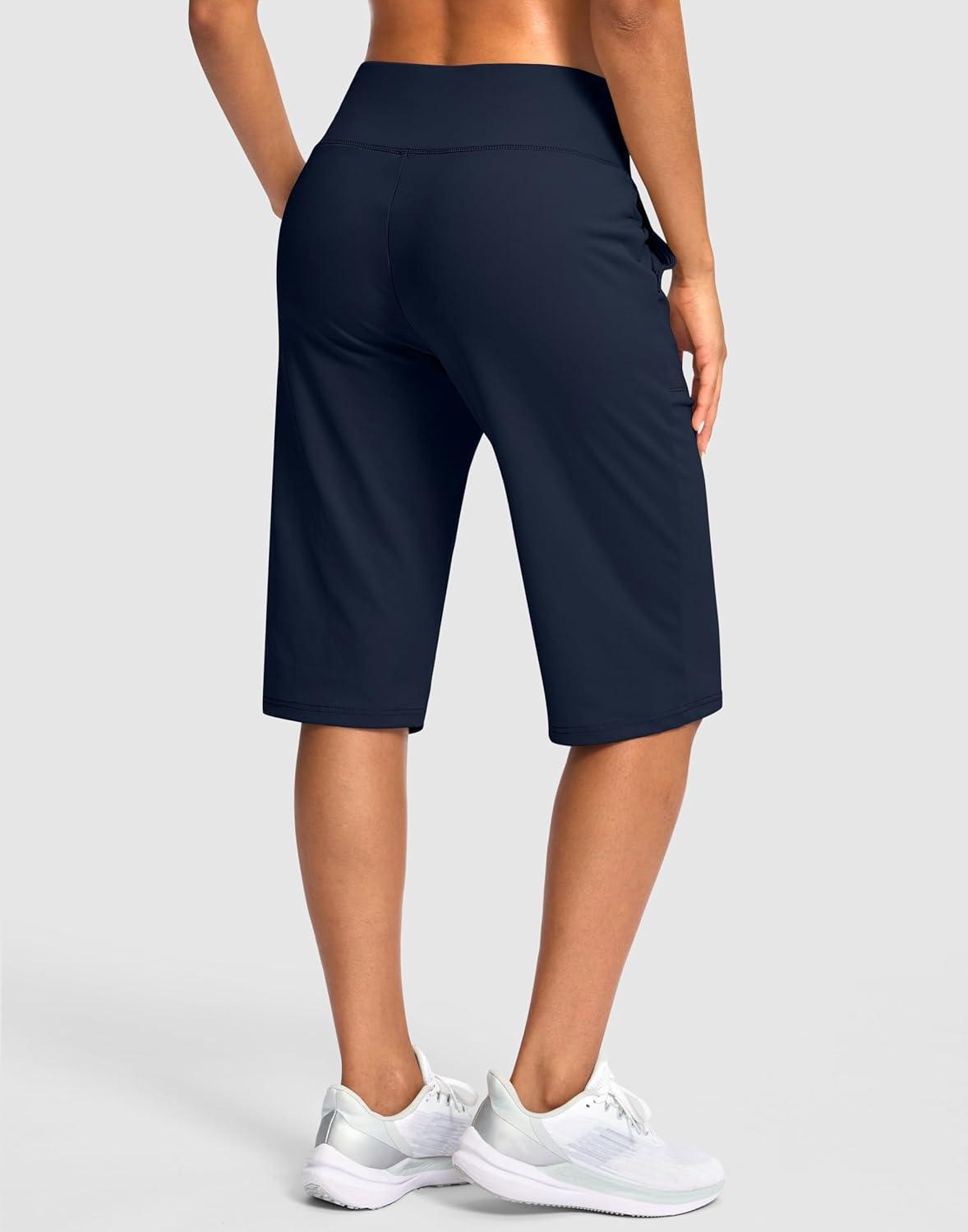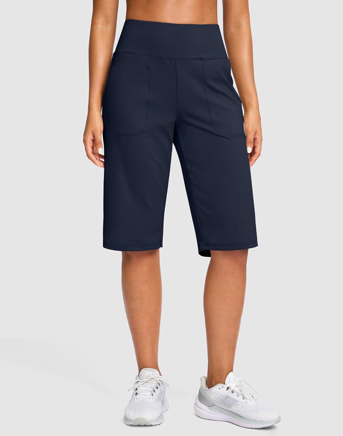 SANTINY 14″ Shorts for Women Knee Length with Pockets High Waisted Stretch Long Bermuda Shorts for Summer Dressy Casual(Navy)