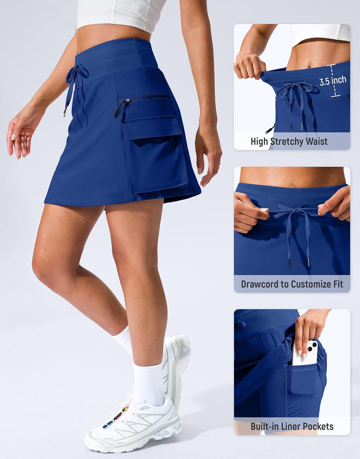 SANTINY 16″ Cargo Skort with 6 Pockets Drawstring High Waisted Golf Travel Hiking Skorts for Women Dressy Casual Summer(Deep Blue)
