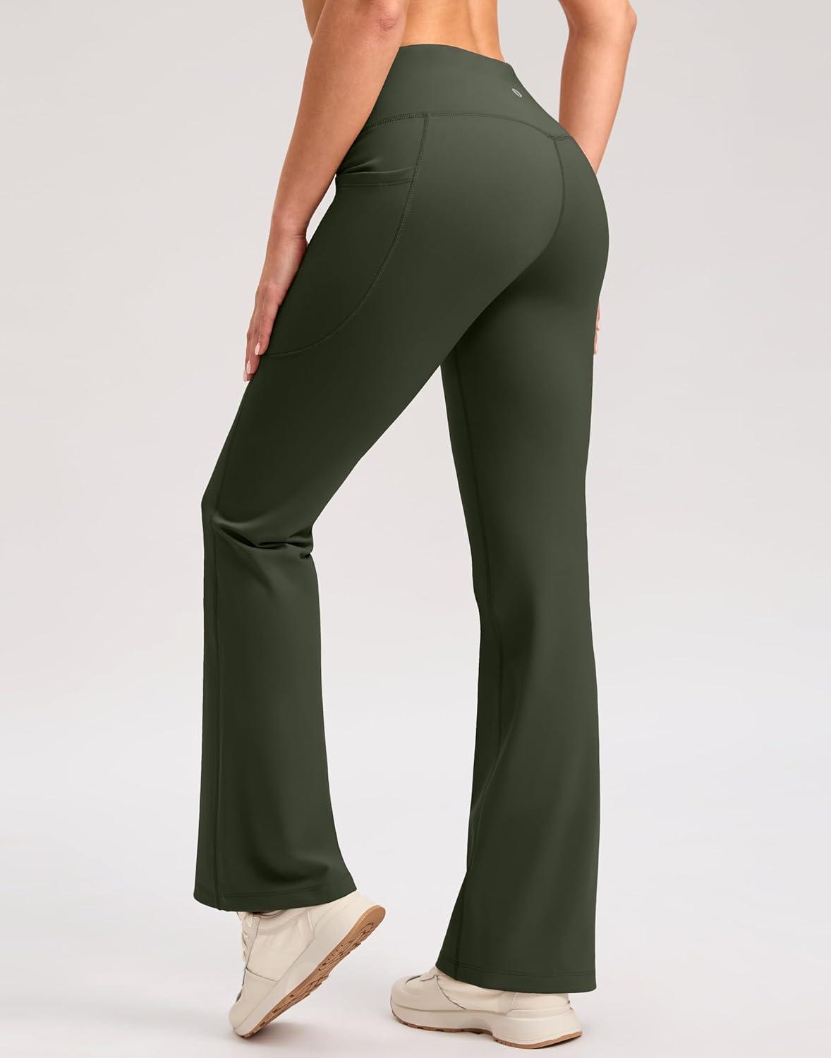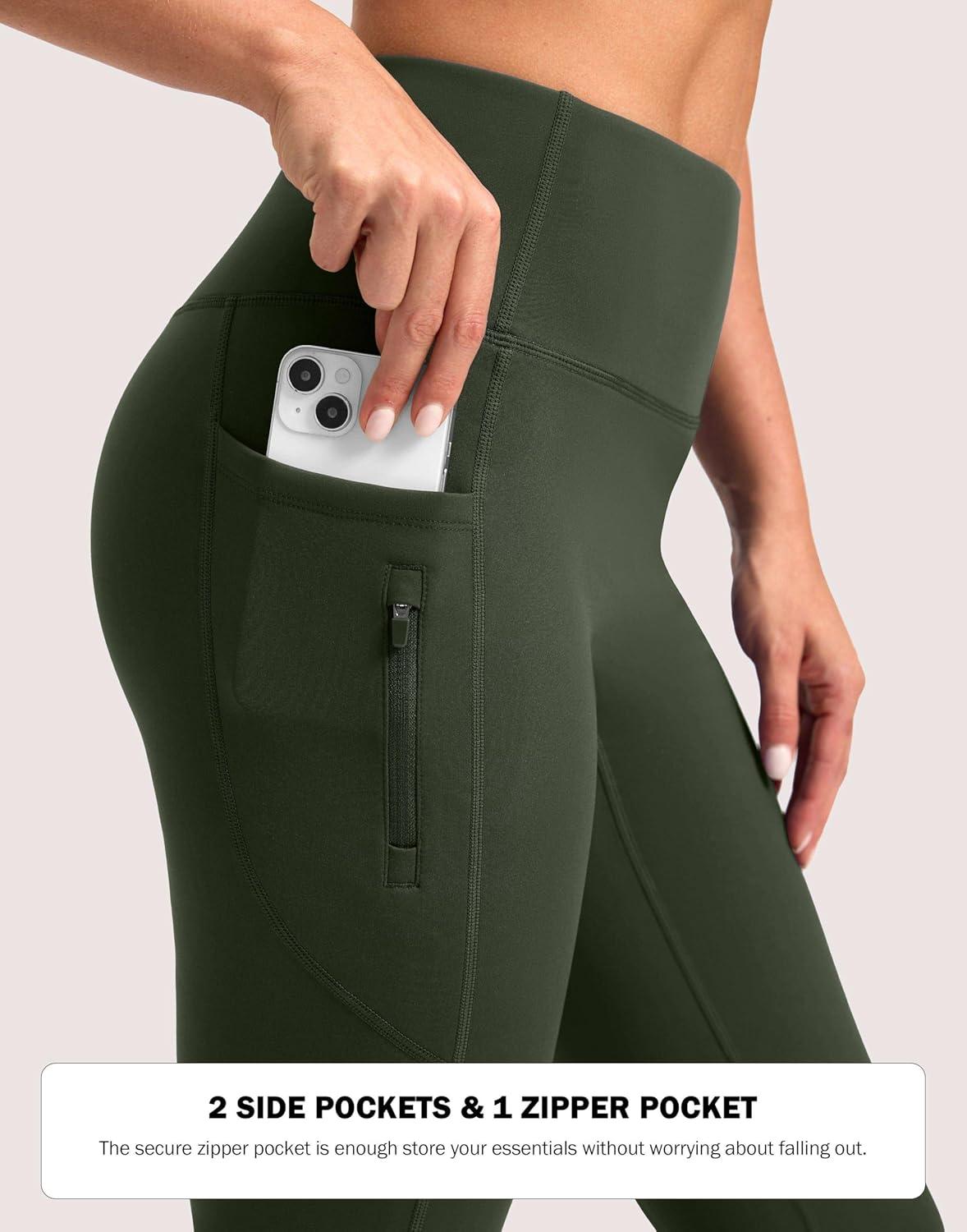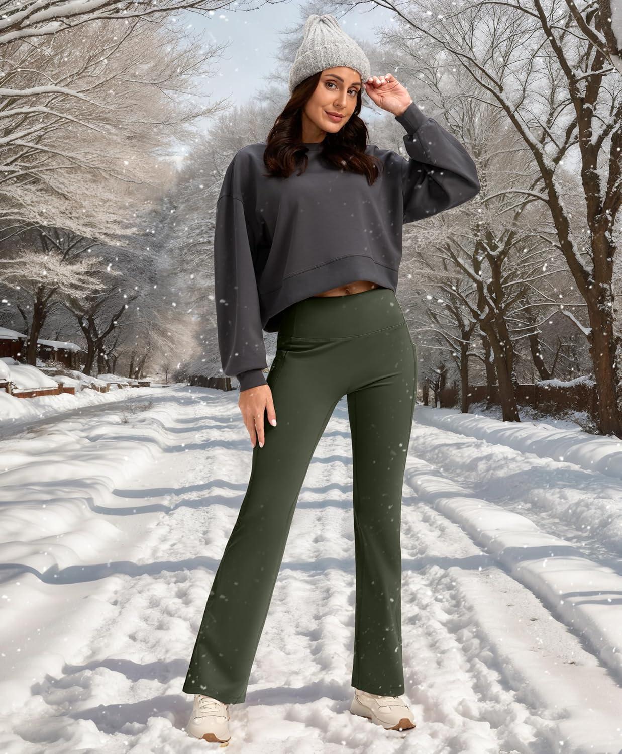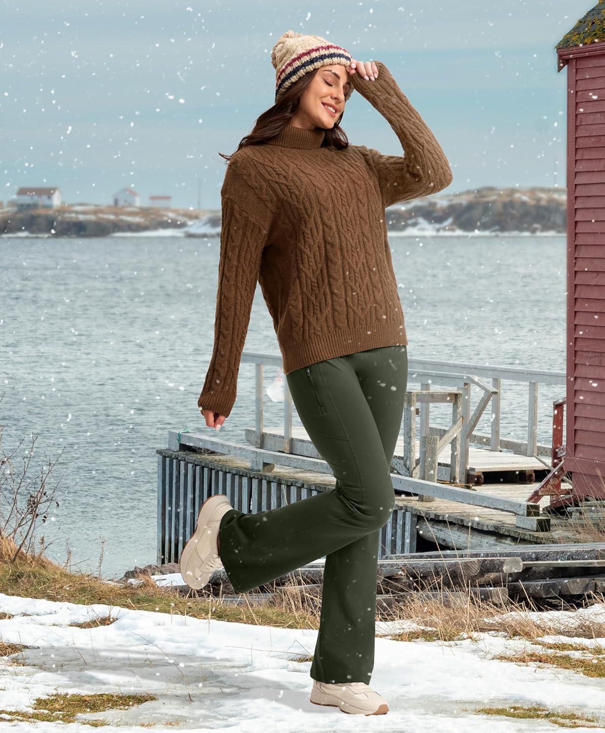 SANTINY Fleece Lined Flare Leggings Women 28.5/30.5/32 Water Resistant Winter Bell Bottom Hiking Yoga Pants with Pockets(Olive)