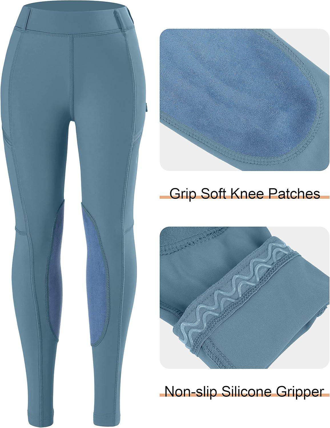 SANTINY Girls Horse Riding Pants with Zipper Pockets Kids Stretchy Equestrian Breeches Knee-Patch Youth Schooling Tights(Dusty Blue)