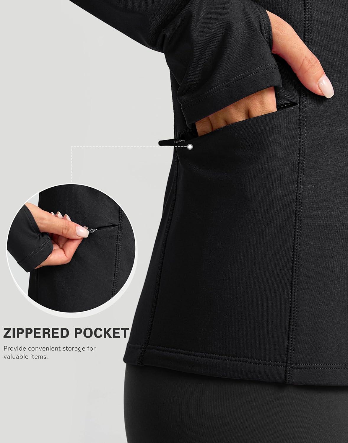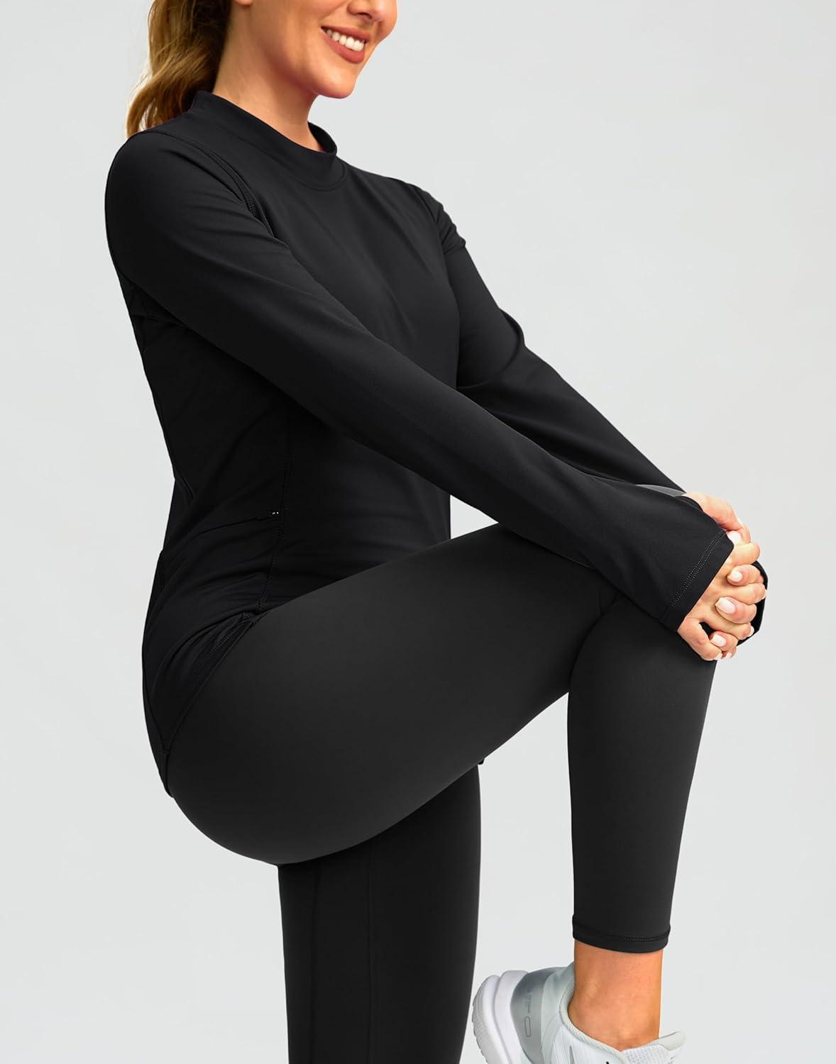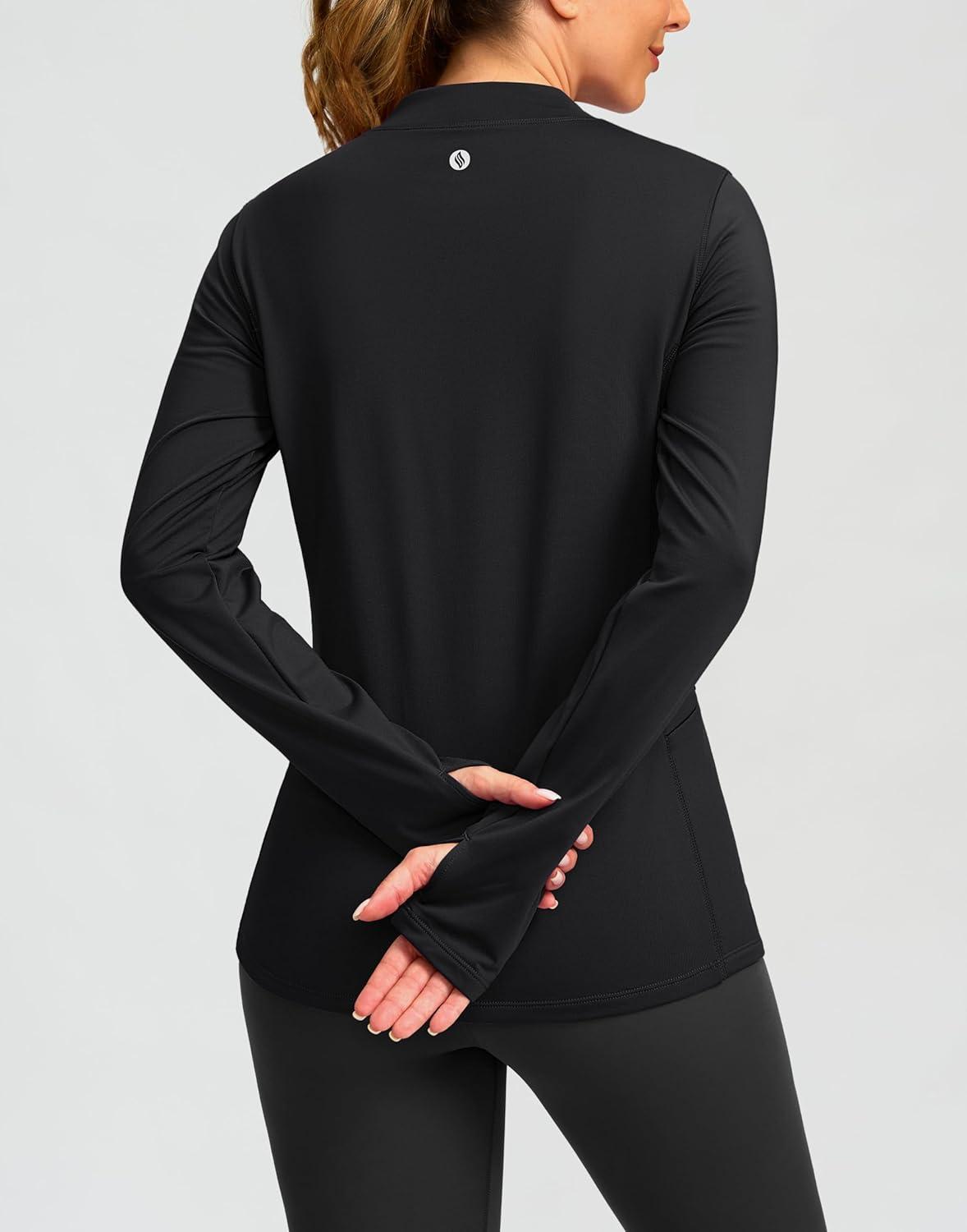 SANTINY Long Sleeve Thermal Shirts for Women Fleece Mock Neck Tops Winter Workout Running Gear with Zipper Pockets(Black)