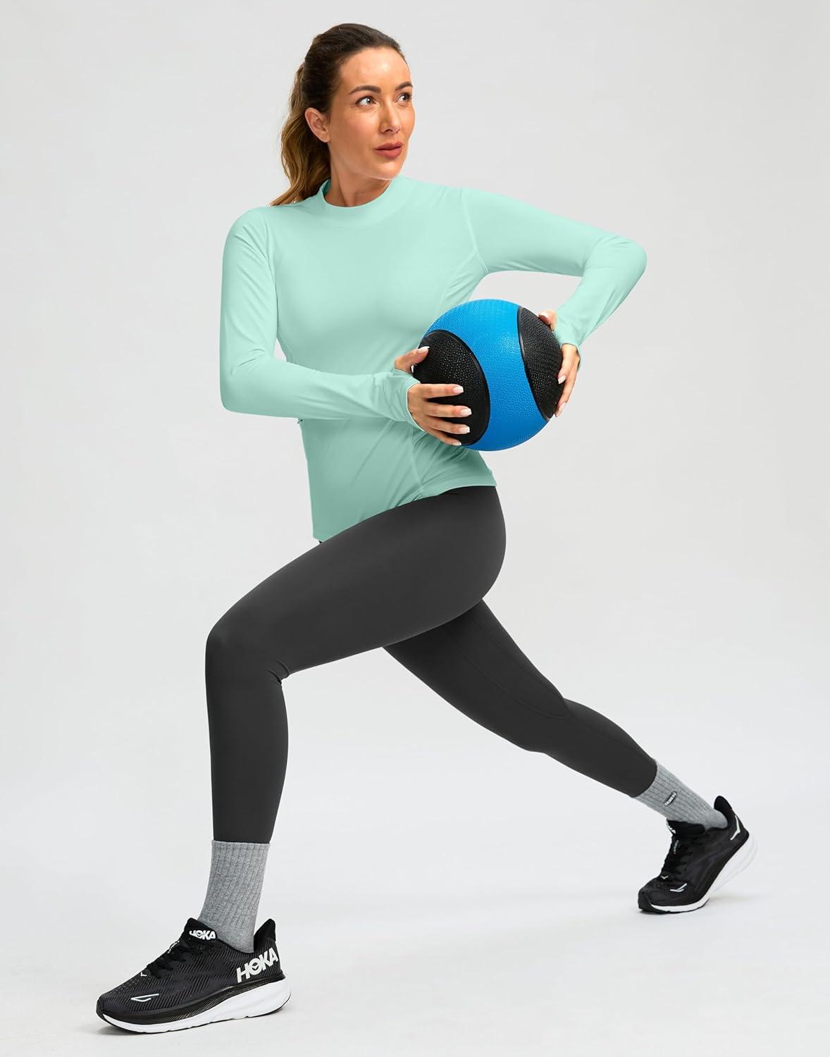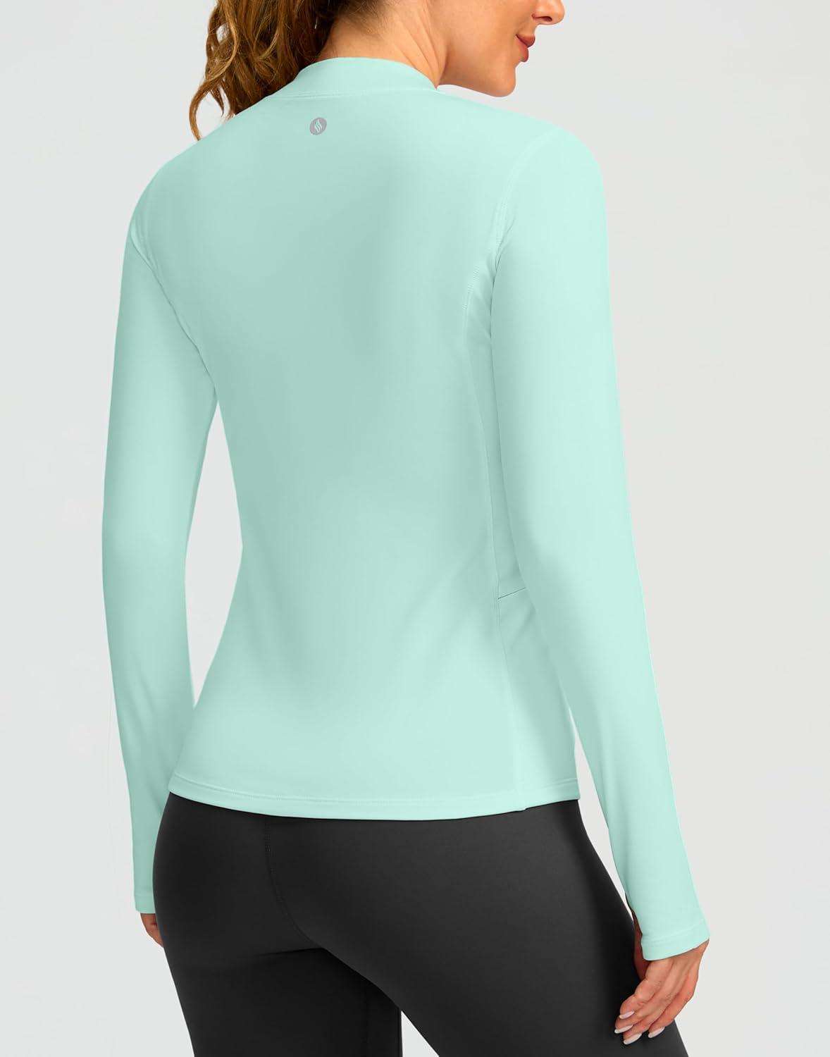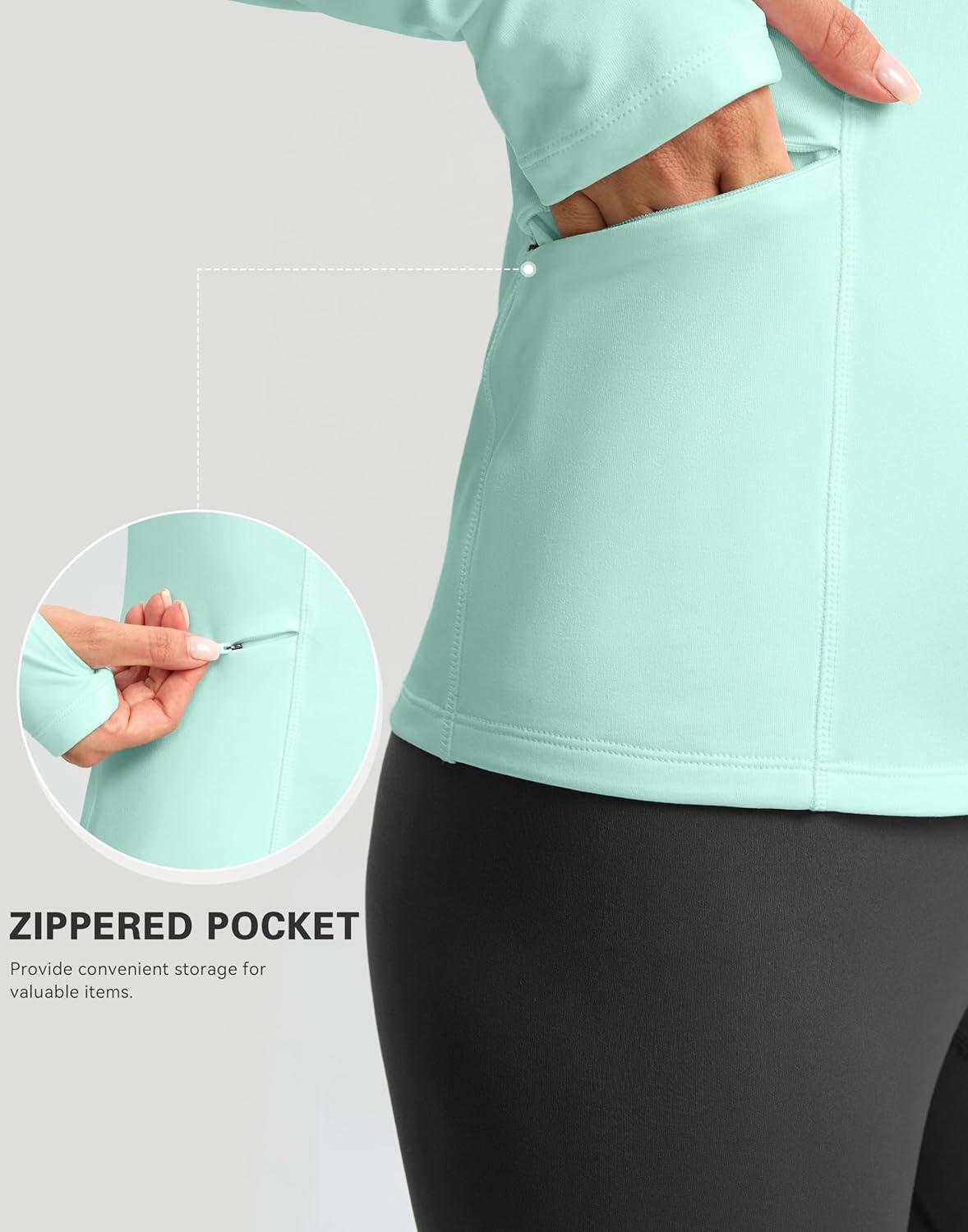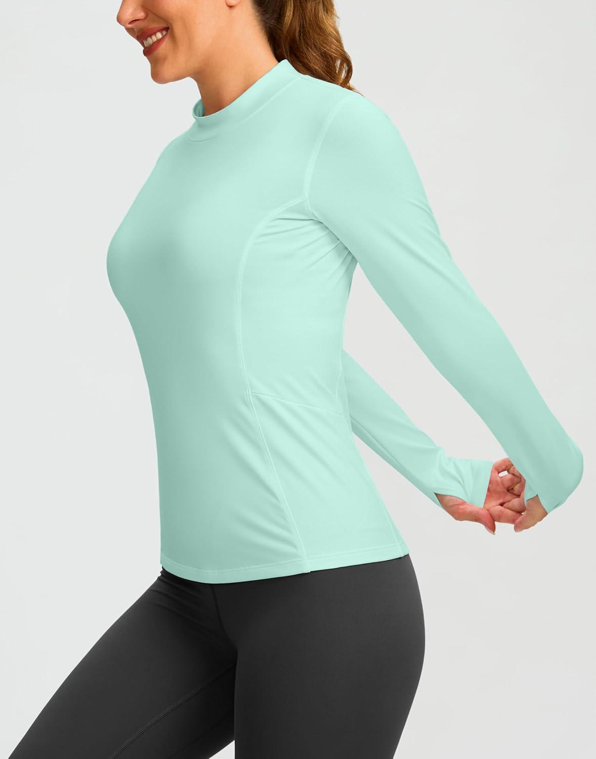 SANTINY Long Sleeve Thermal Shirts for Women Fleece Mock Neck Tops Winter Workout Running Gear with Zipper Pockets(Light Green)