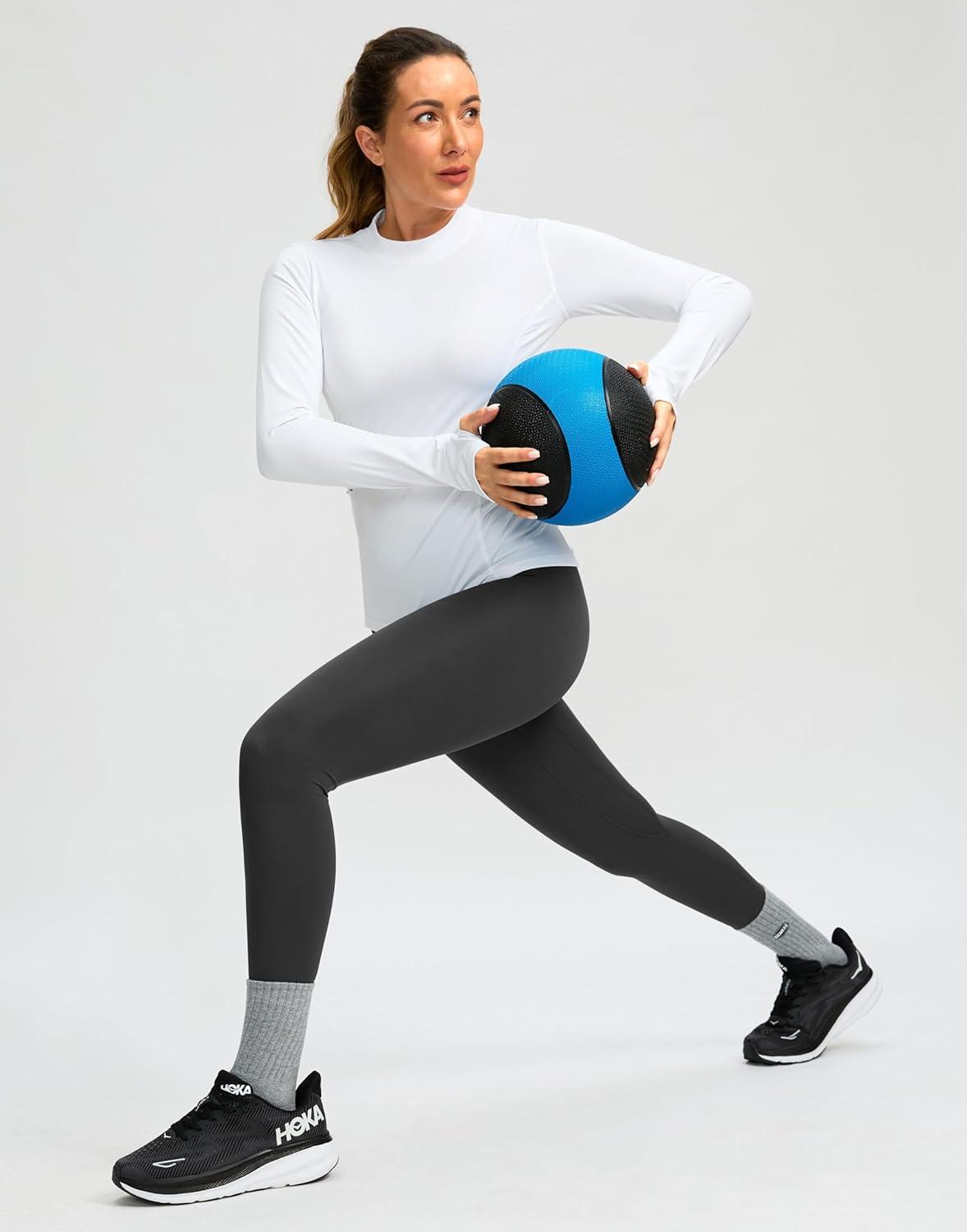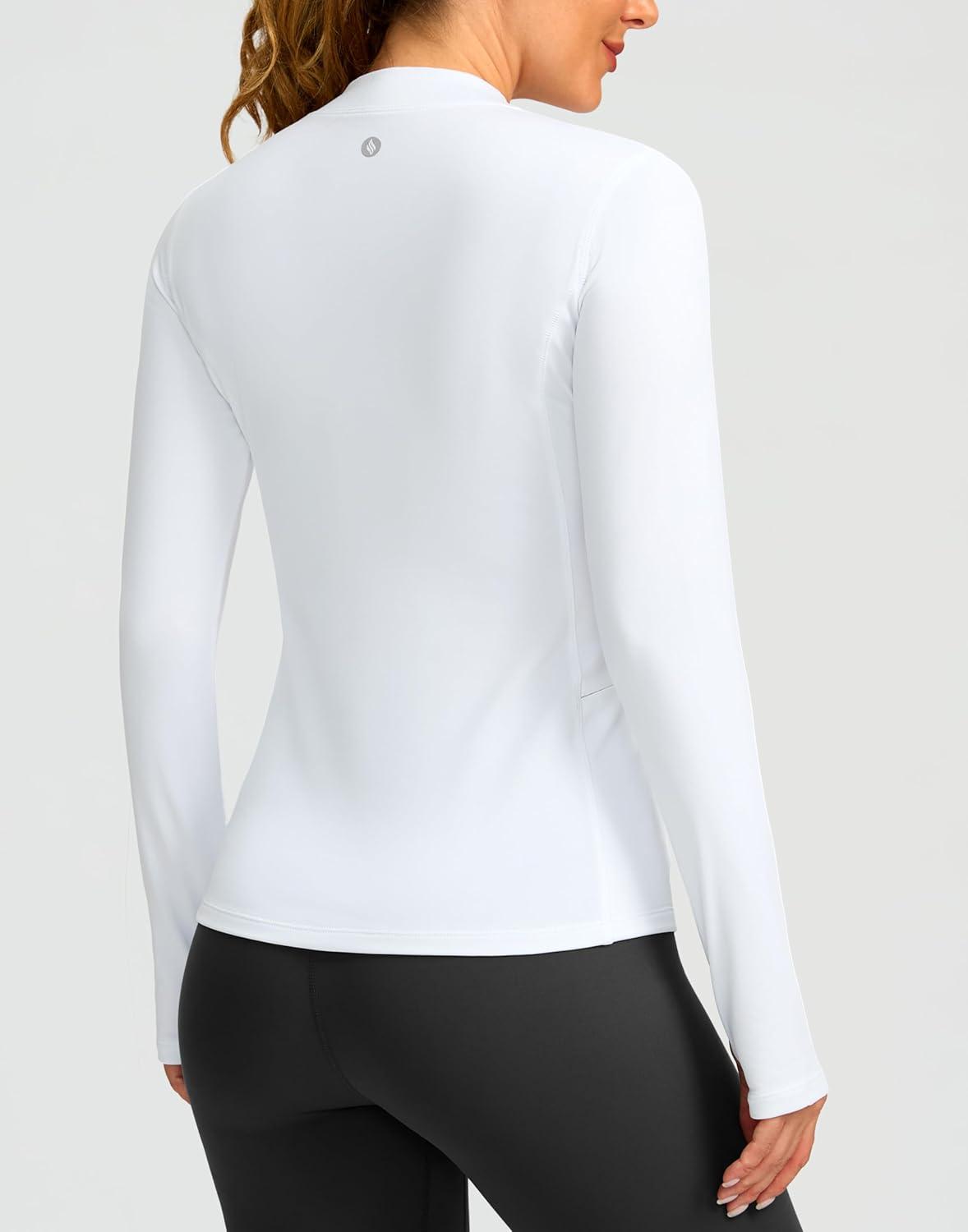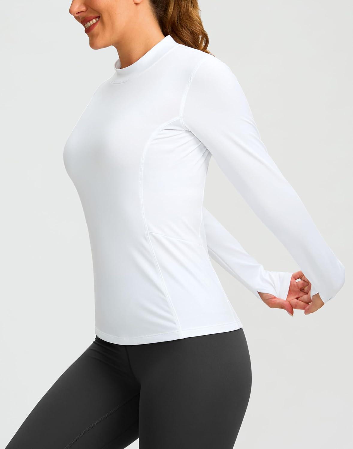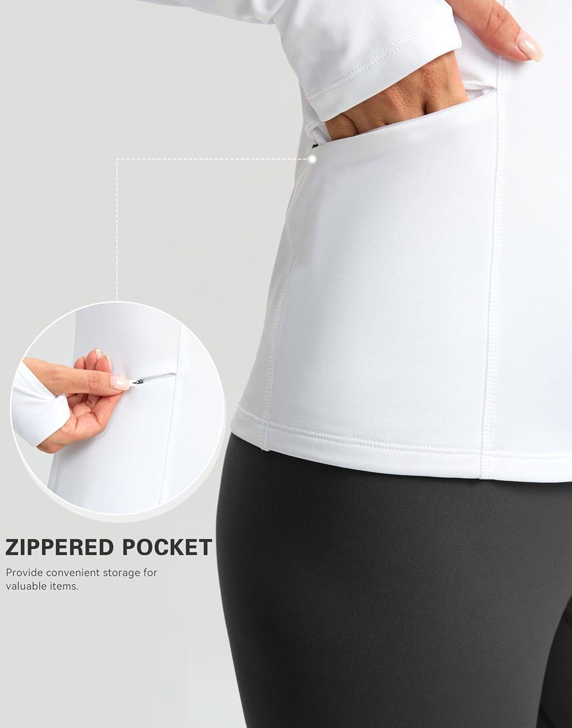 SANTINY Long Sleeve Thermal Shirts for Women Fleece Mock Neck Tops Winter Workout Running Gear with Zipper Pockets(White)