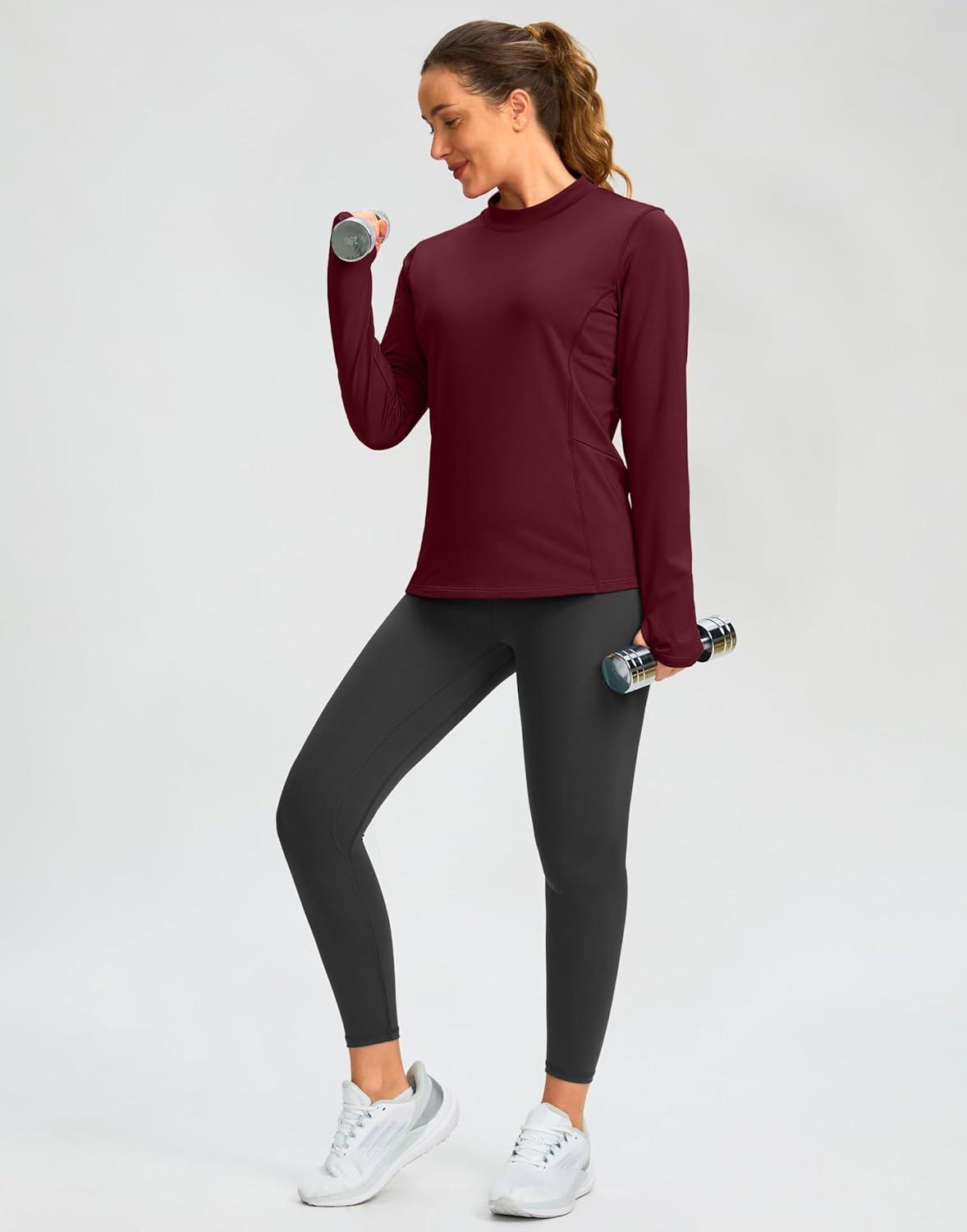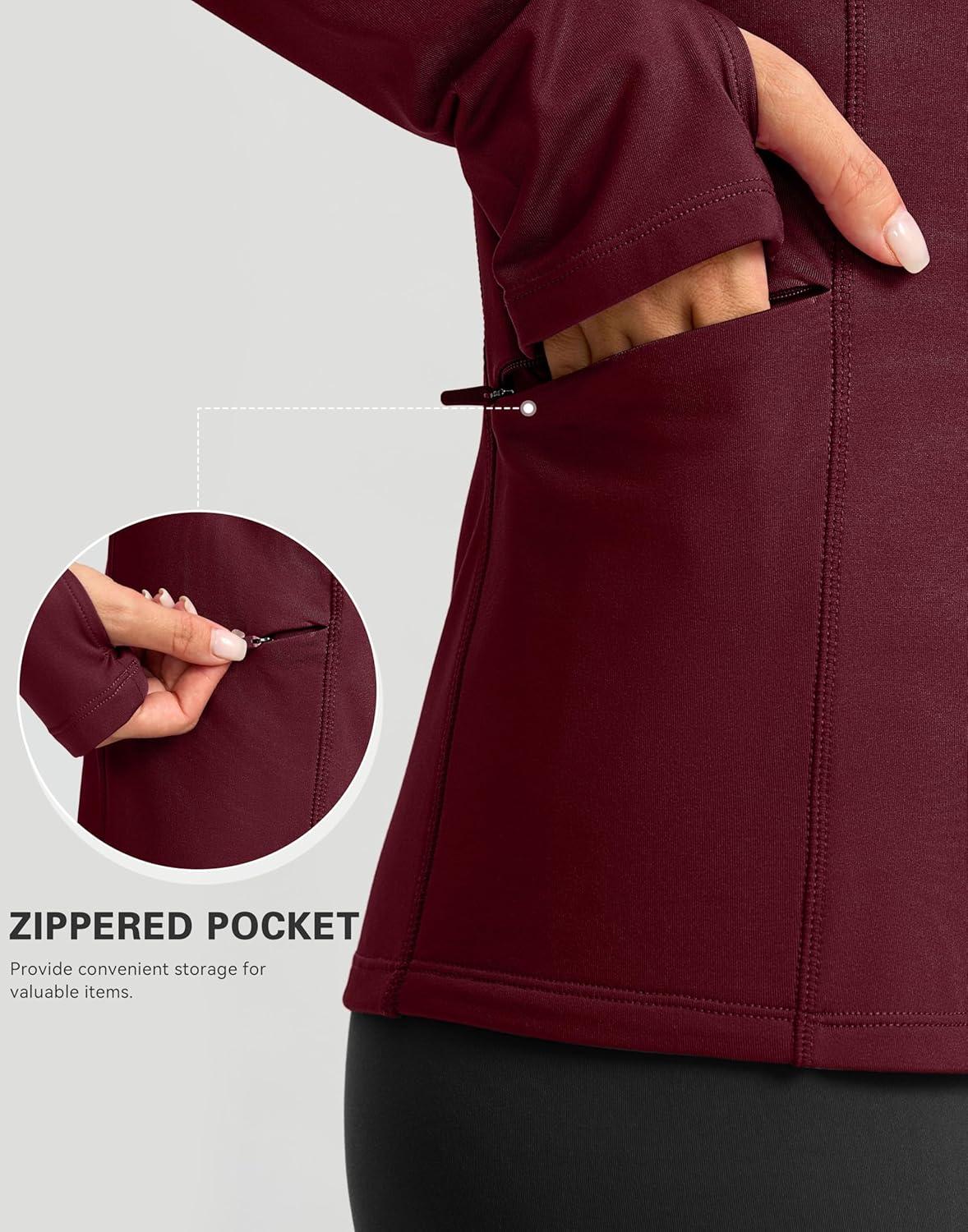 SANTINY Long Sleeve Thermal Shirts for Women Fleece Mock Neck Tops Winter Workout Running Gear with Zipper Pockets(Wine)