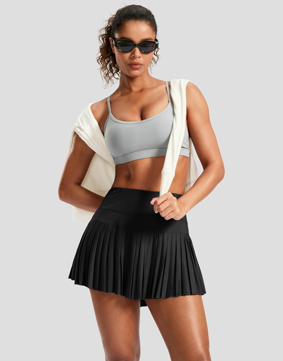 SANTINY Pleated Tennis Skirt for Women with Pockets High Waisted Athletic Golf Skorts with Shorts for Workout Pickleball(Black)