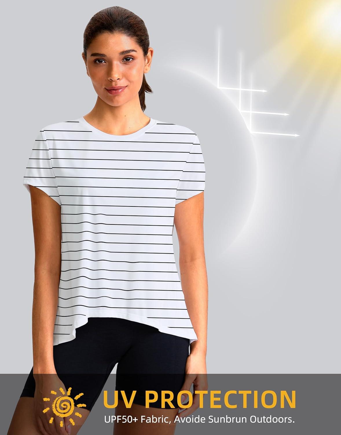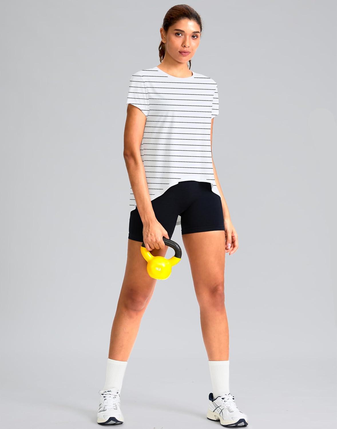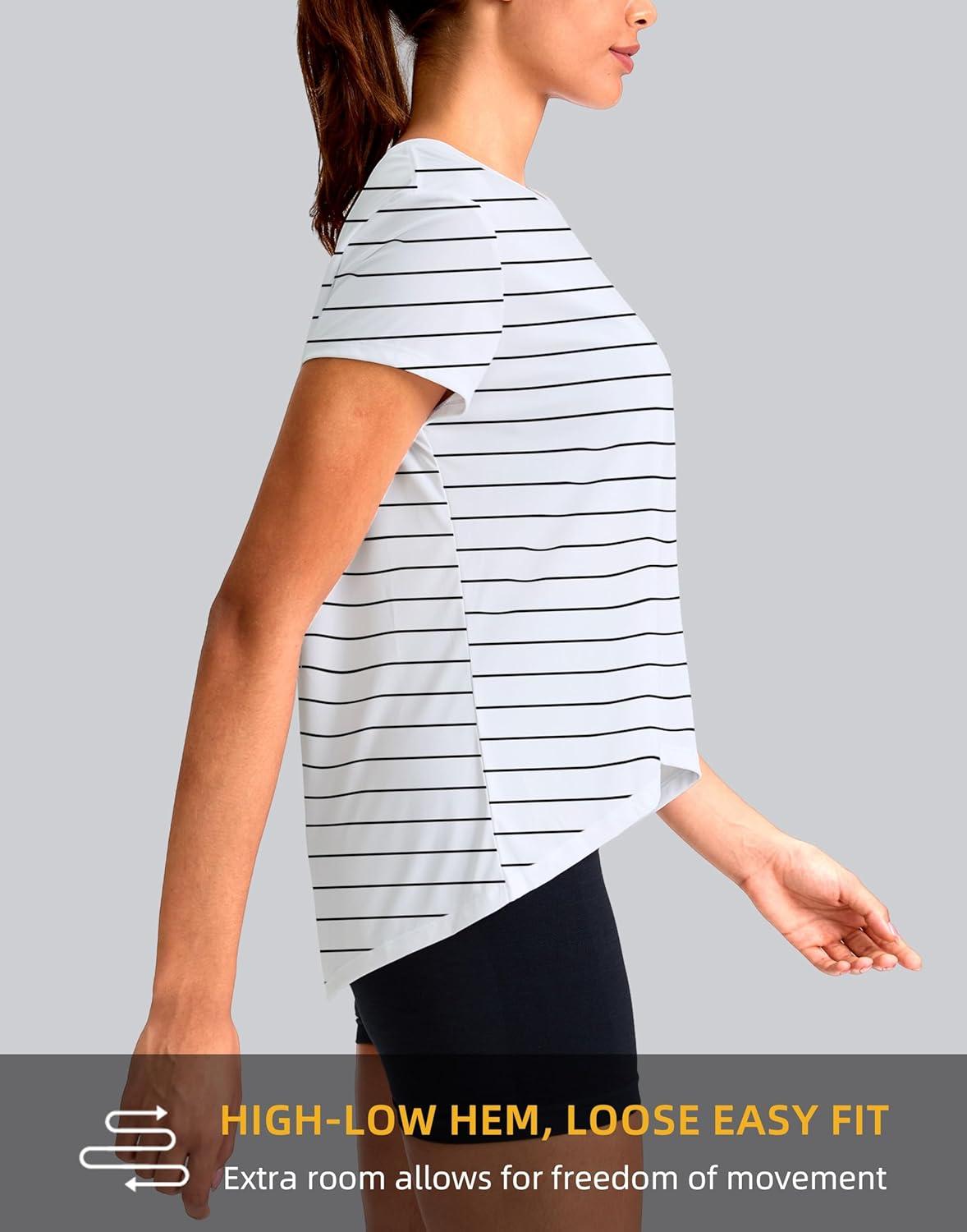 SANTINY Short Sleeve Workout Tops for Women Loose Yoga T-Shirts Sun Protection Breathable Running Athletic Tee Shirts(White Black Stripe)