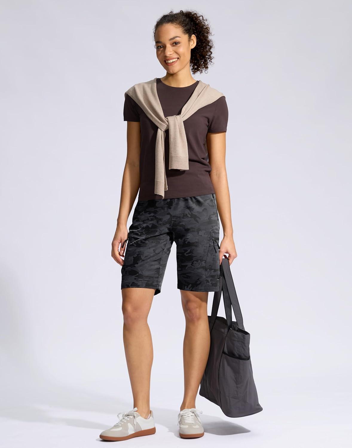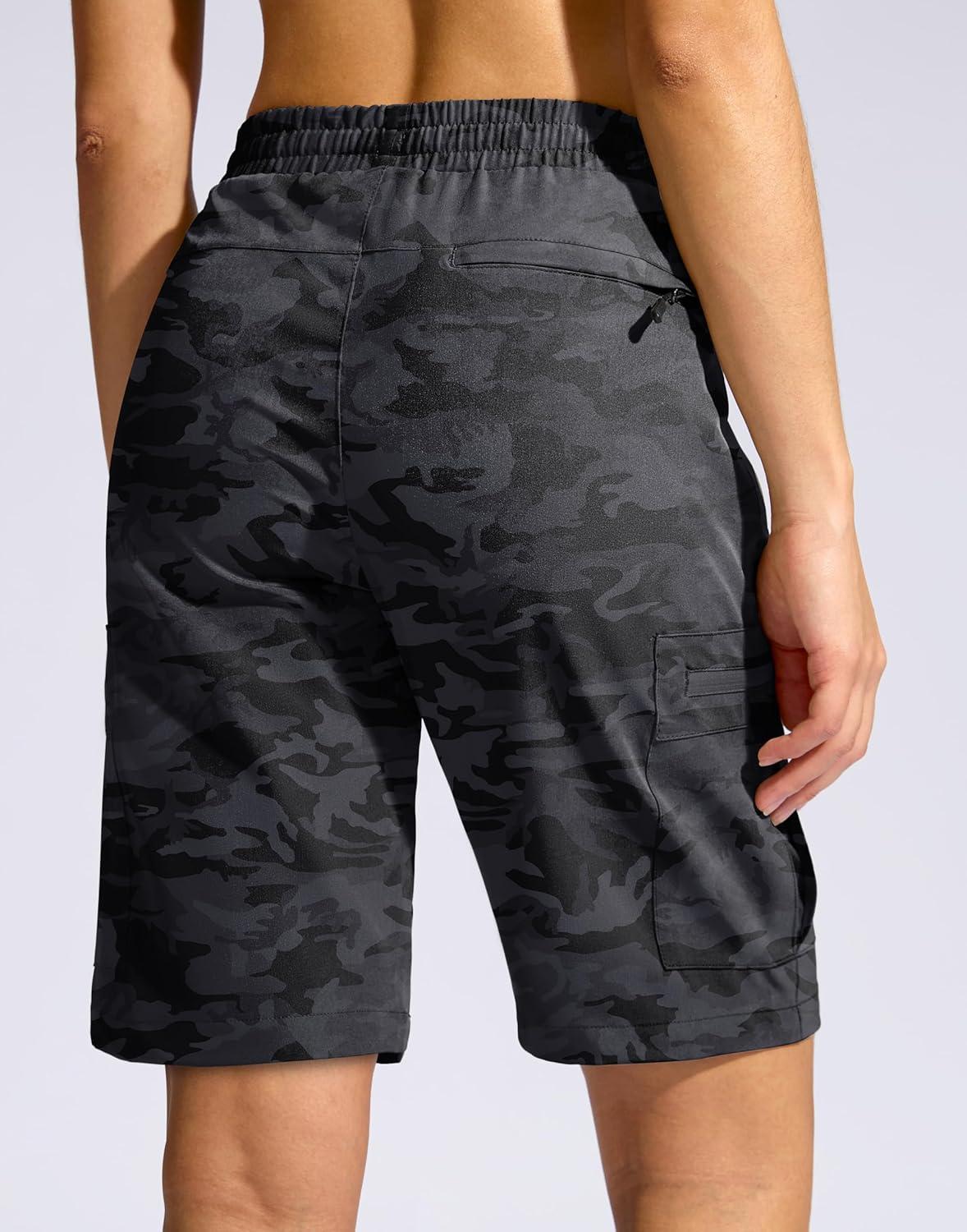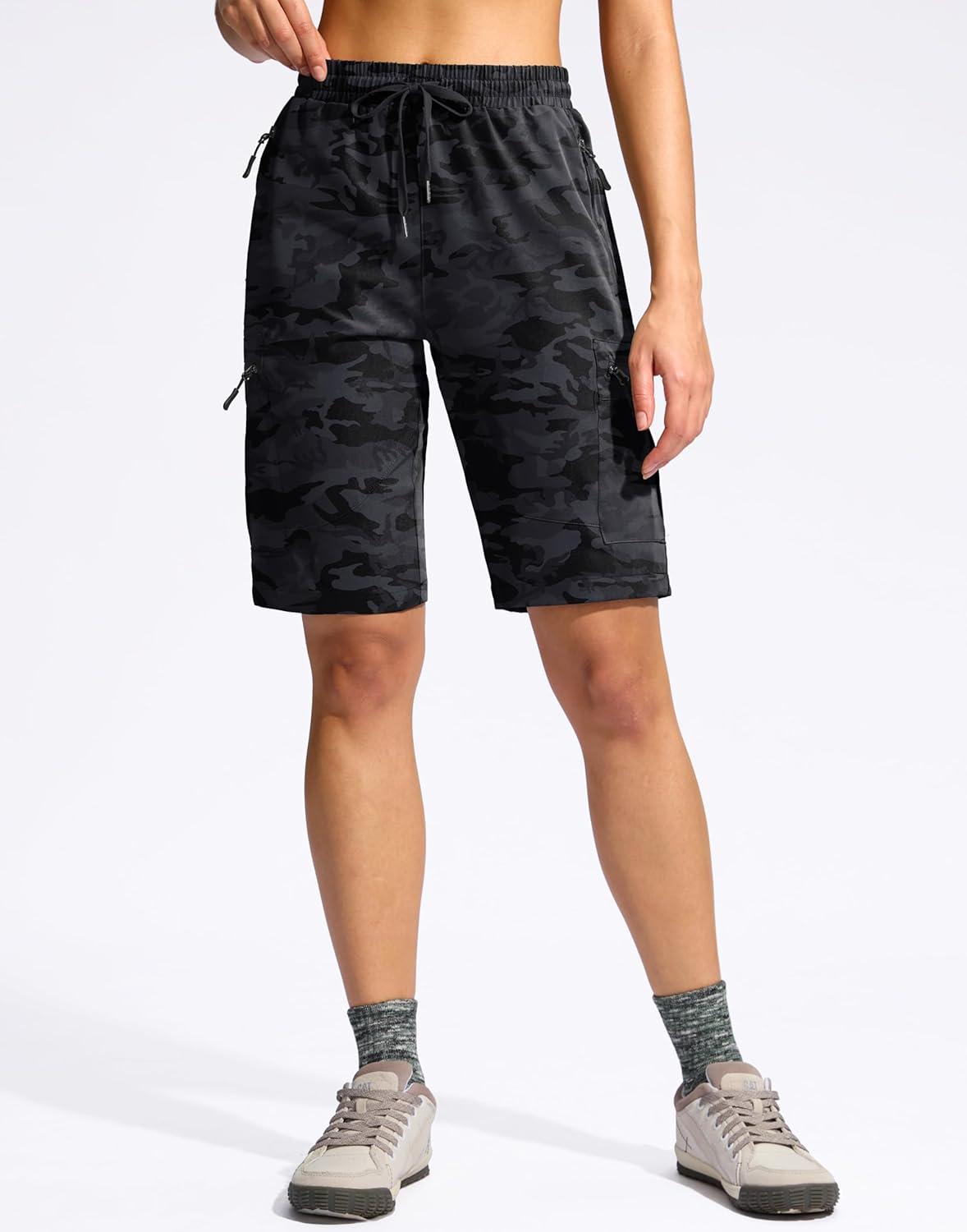 SANTINY Women’s 10” Lightweight Hiking Cargo Shorts with 5 Zipper Pockets Quick Dry Summer Long Travel Golf Shorts for Women(Grey Camo)