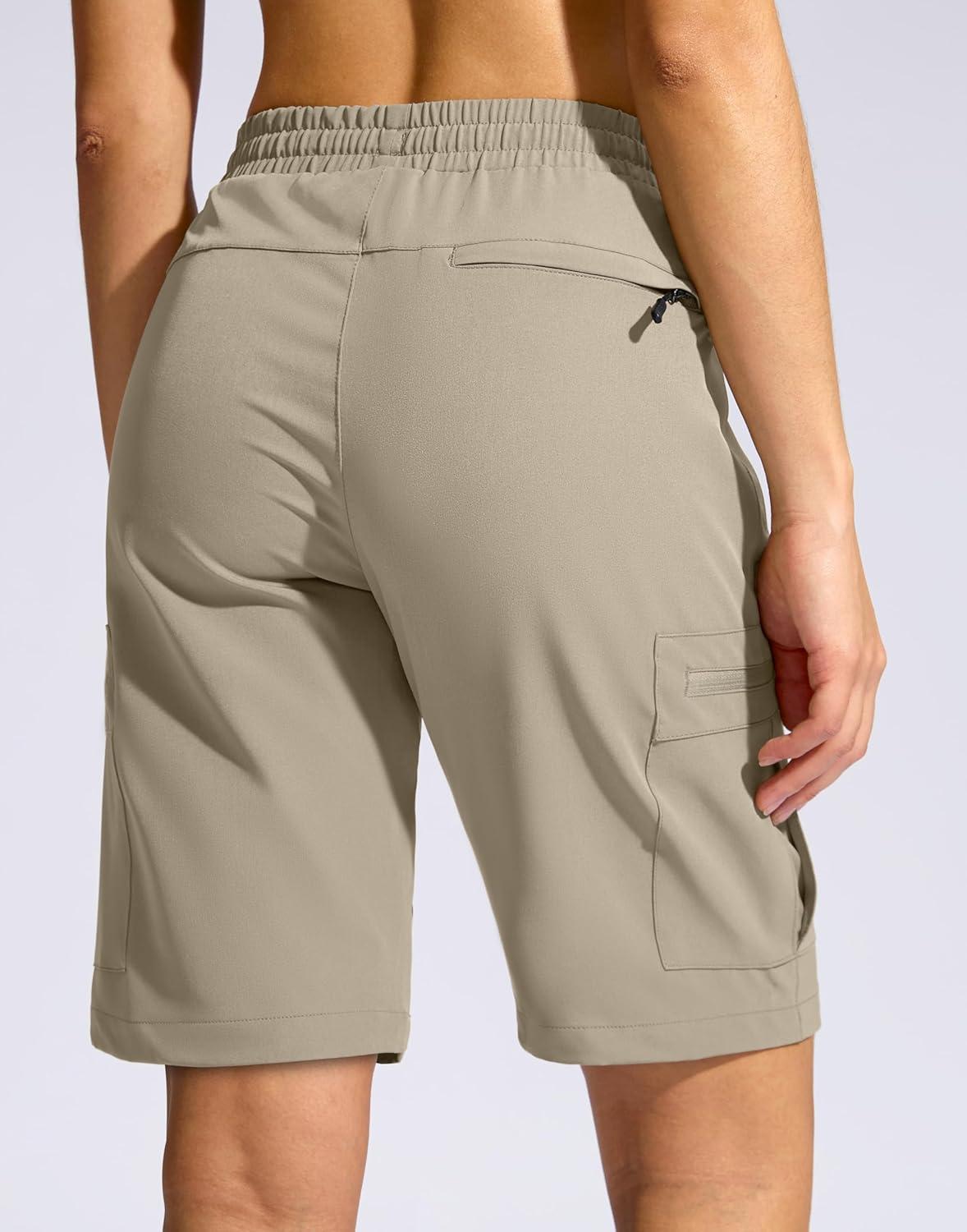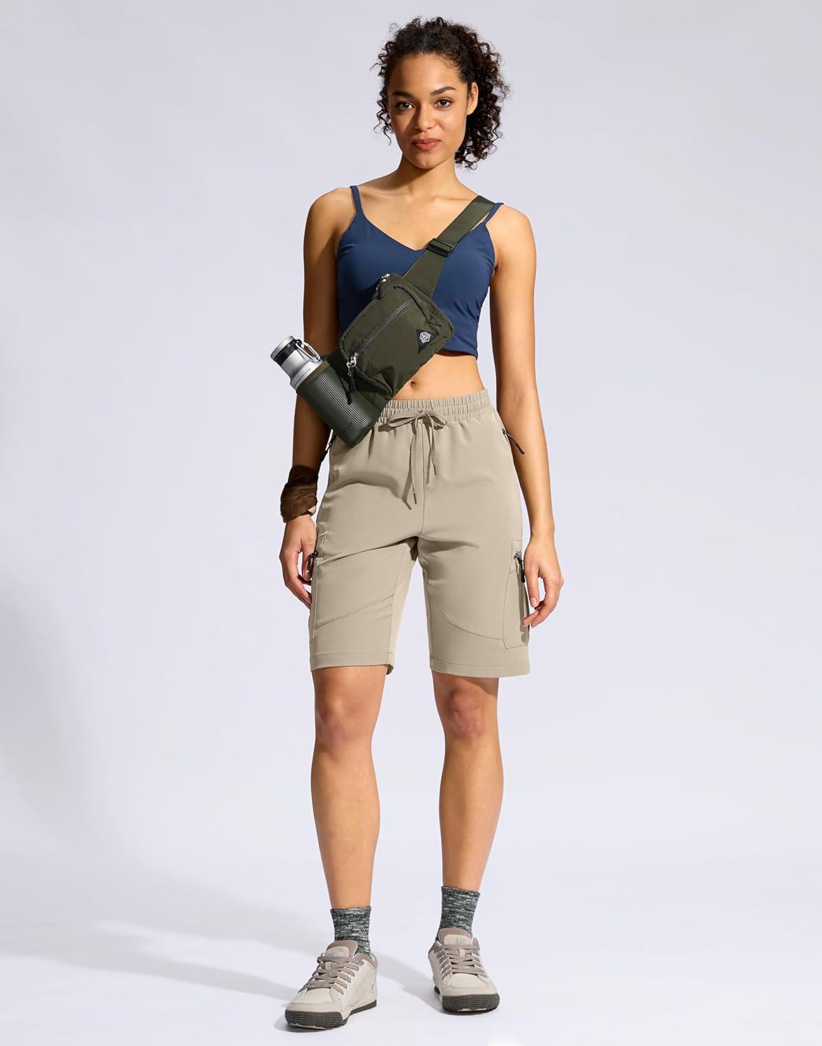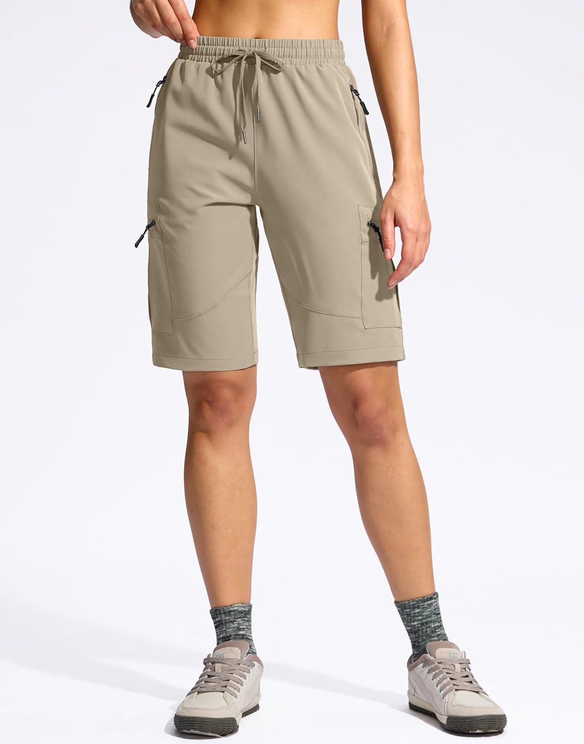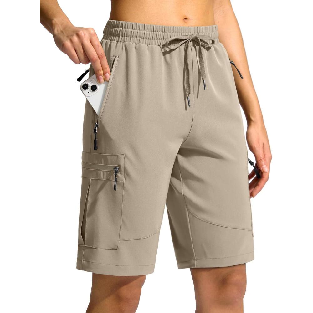 SANTINY Women’s 10” Lightweight Hiking Cargo Shorts with 5 Zipper Pockets Quick Dry Summer Long Travel Golf Shorts for Women(Khaki)