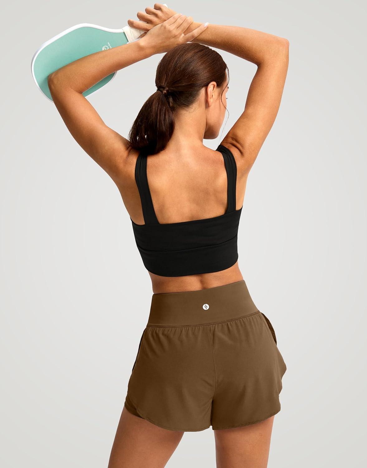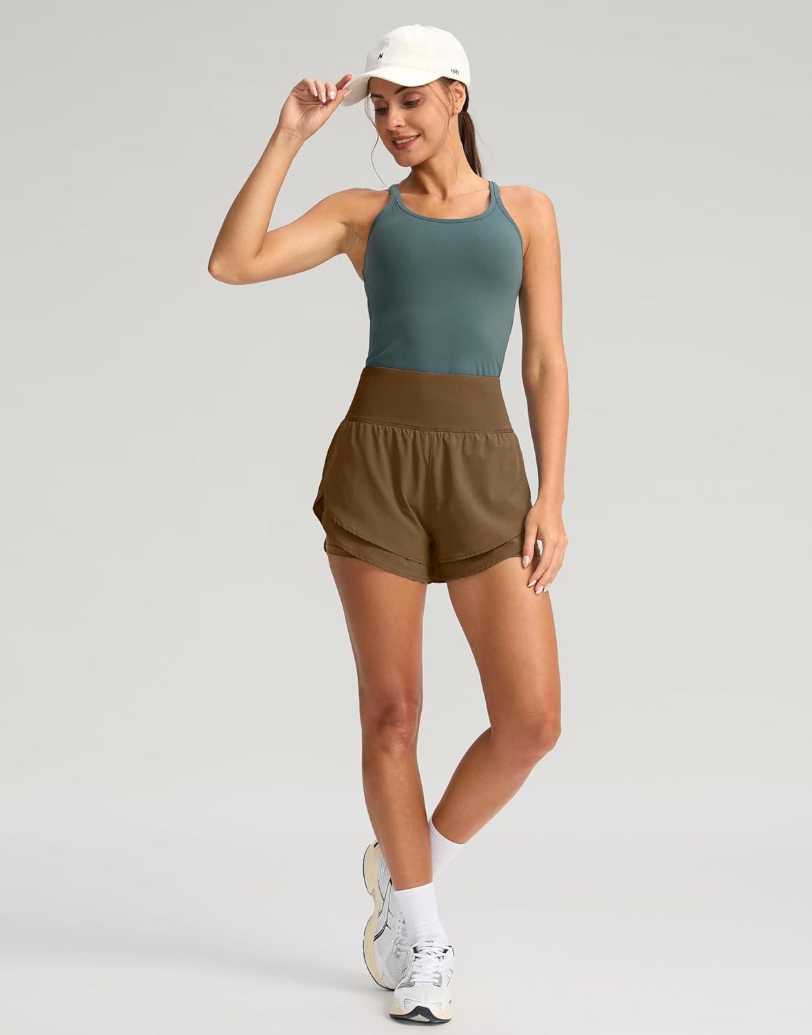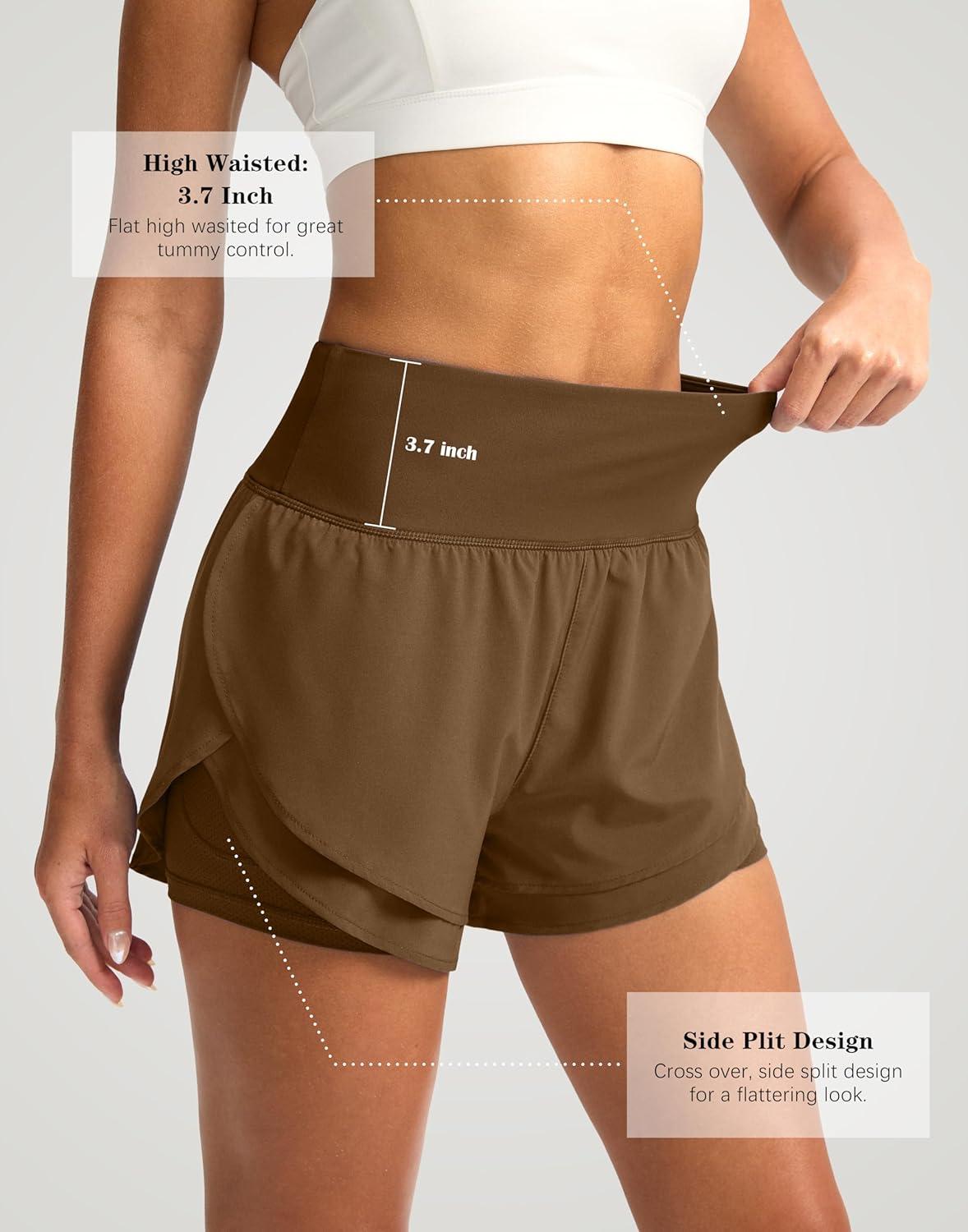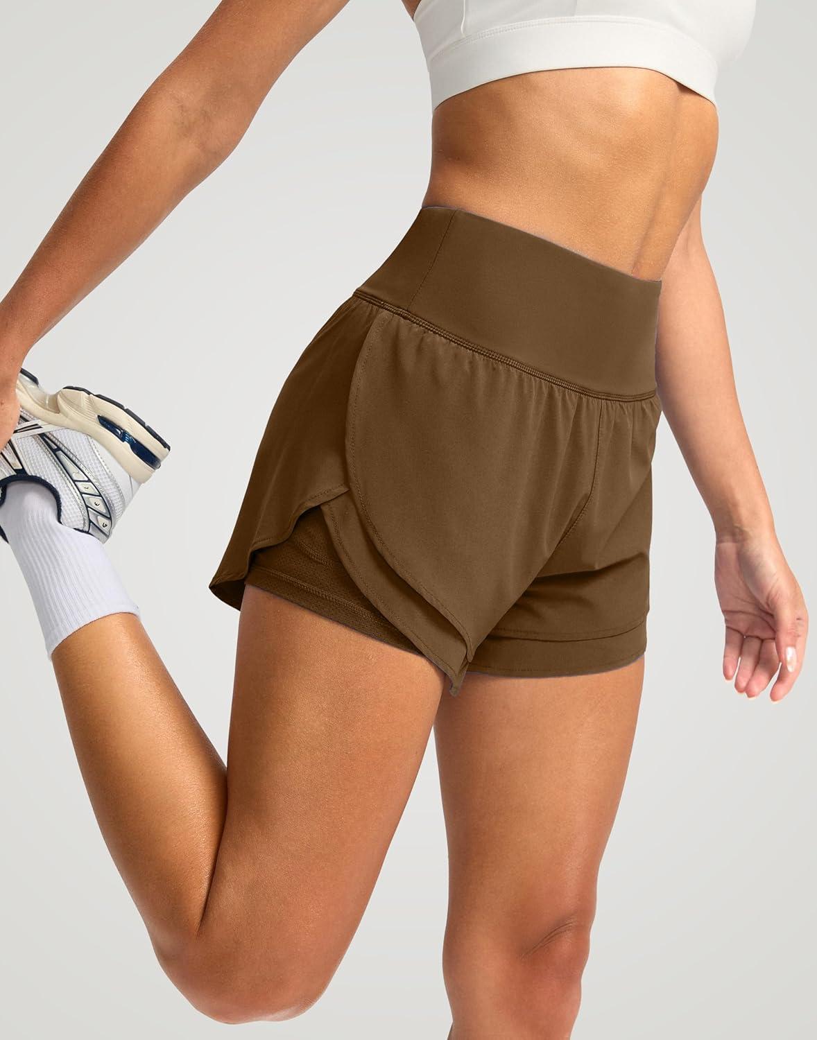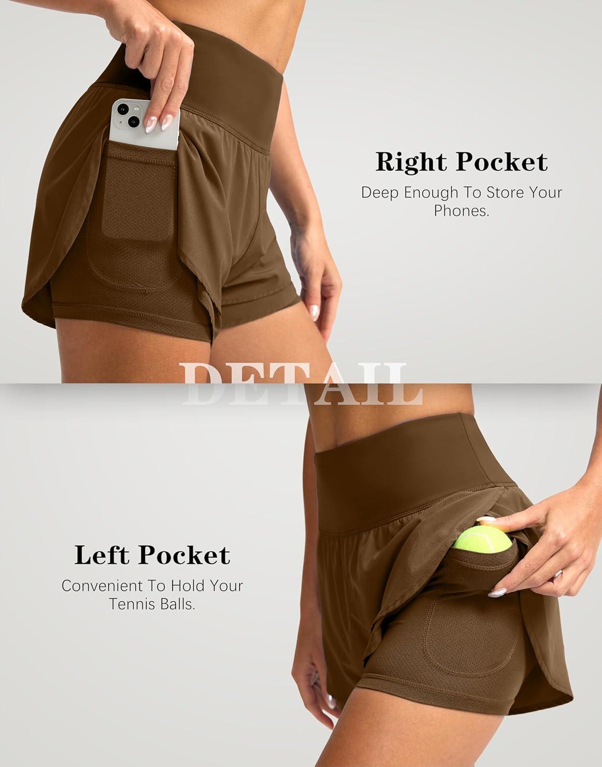 SANTINY Women’s 2 in 1 Running Shorts with Pockets 3″ High Waisted Exercise Workout Athletic Shorts for Women with Liner(Brown)