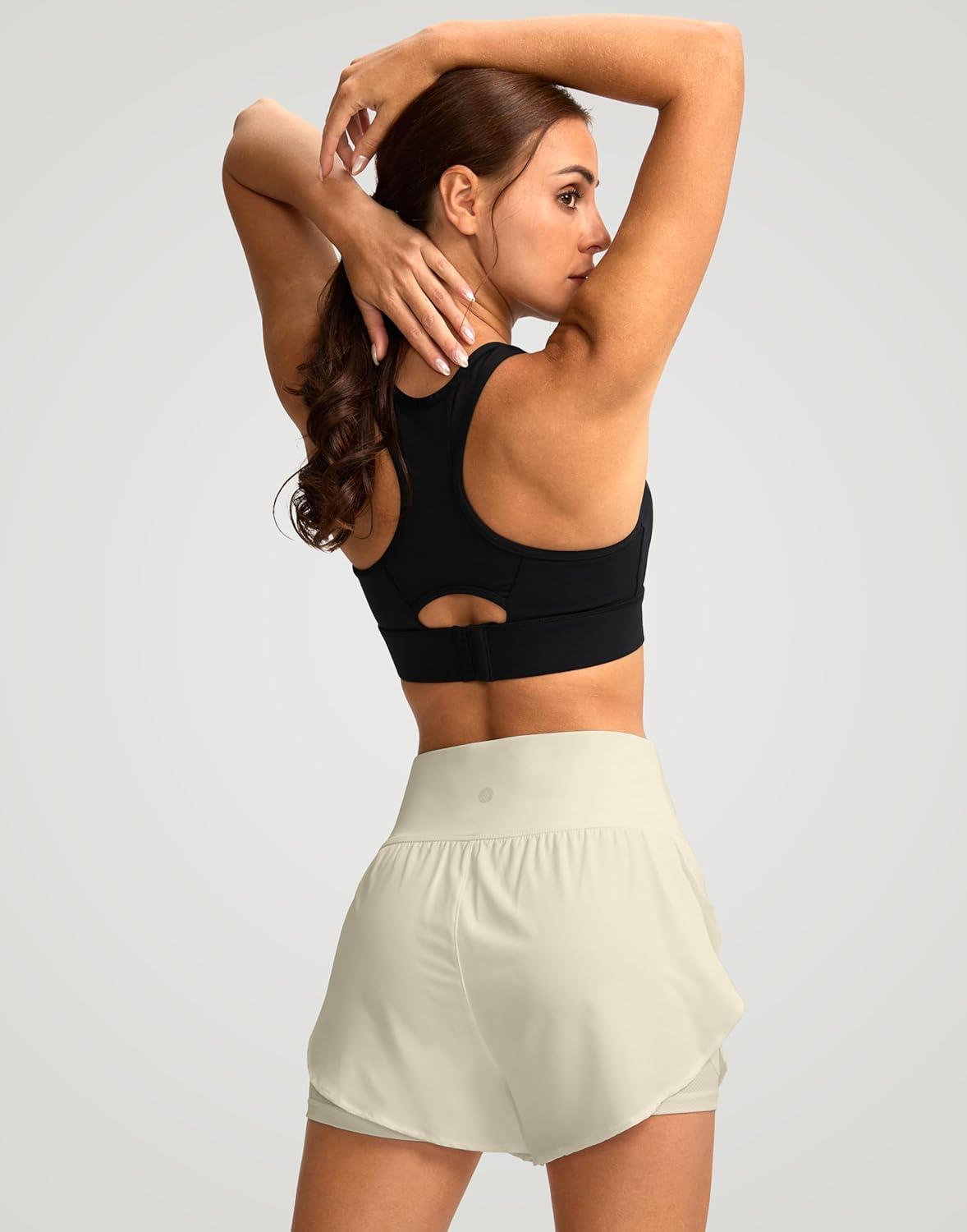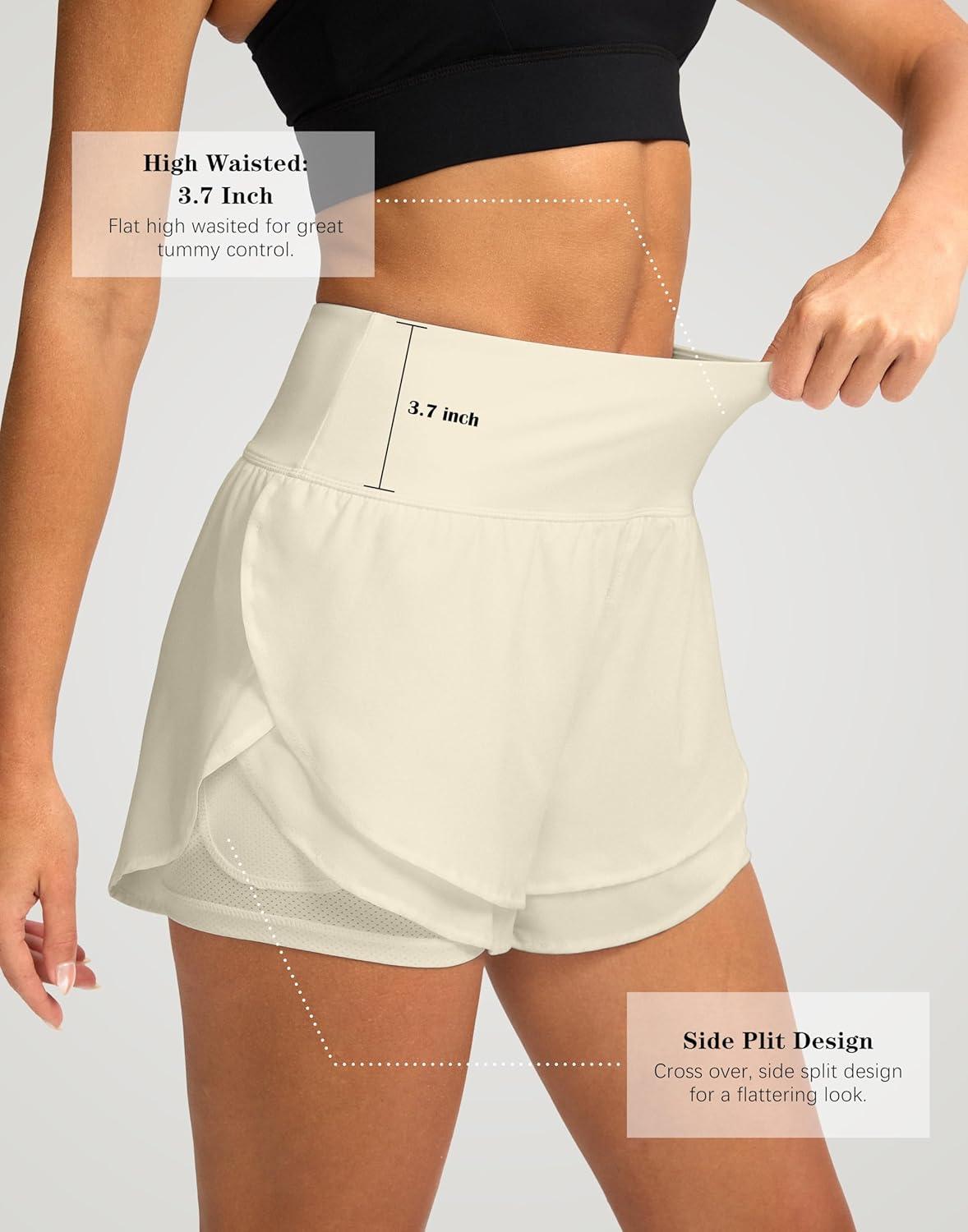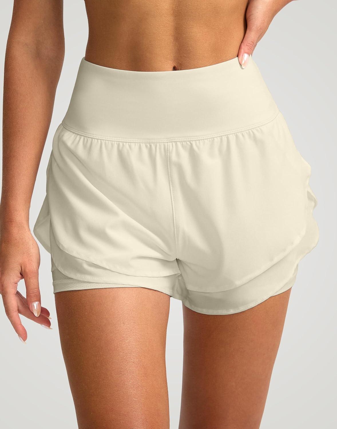 SANTINY Women’s 2 in 1 Running Shorts with Pockets 3″ High Waisted Exercise Workout Athletic Shorts for Women with Liner(Cream)