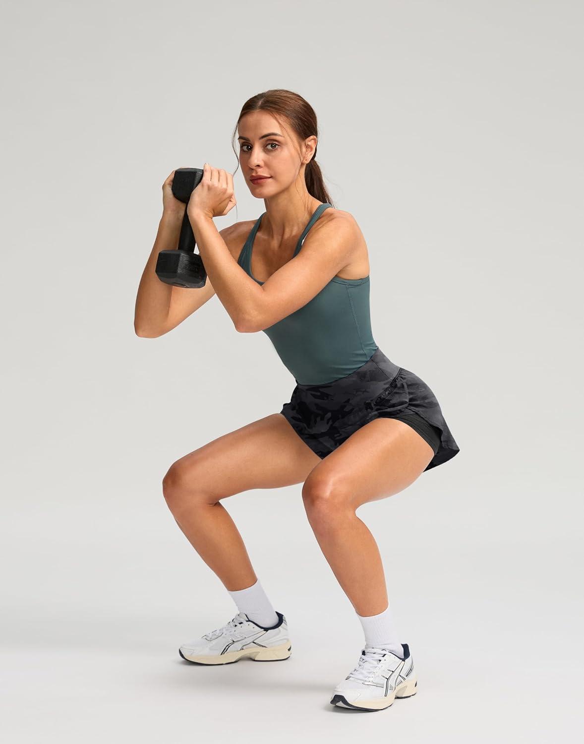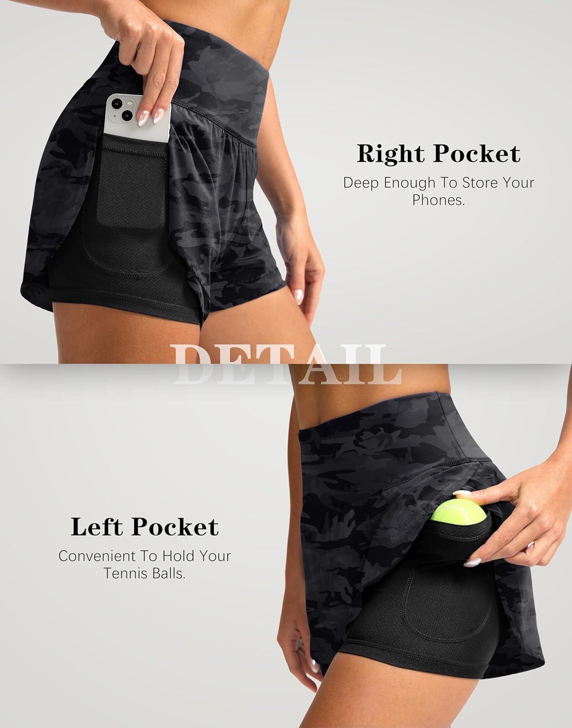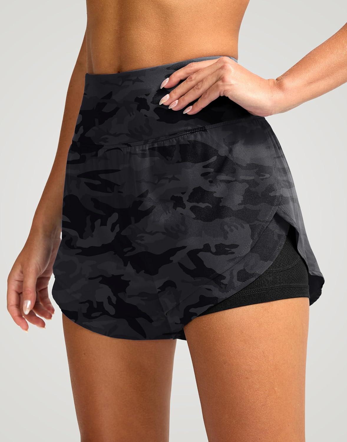 SANTINY Women’s 2 in 1 Running Shorts with Pockets 3″ High Waisted Exercise Workout Athletic Shorts for Women with Liner(Grey Camo)