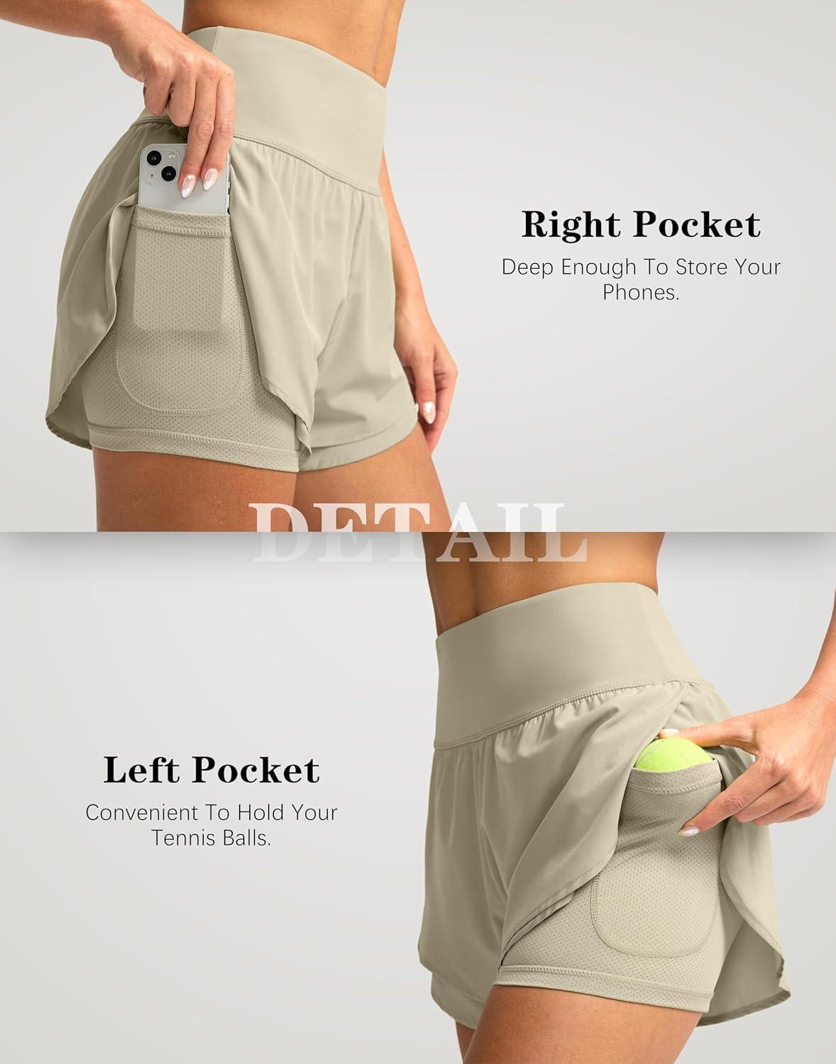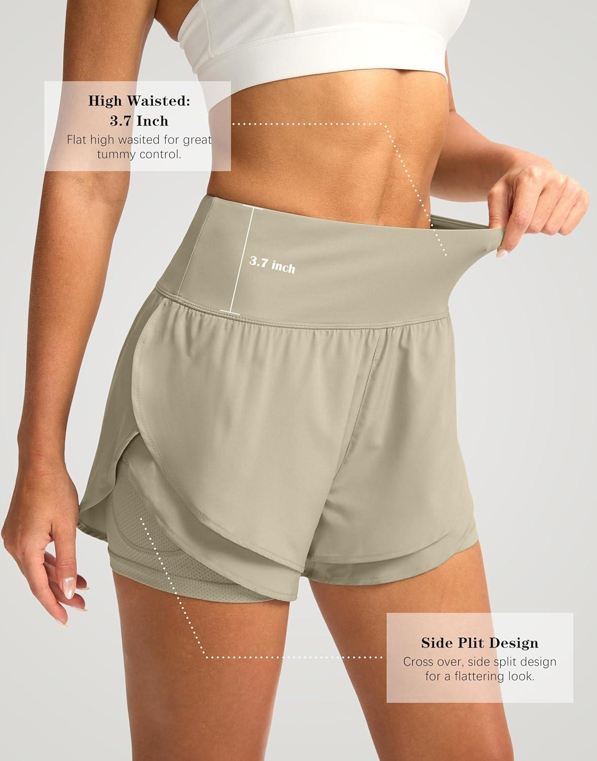 SANTINY Women’s 2 in 1 Running Shorts with Pockets 3″ High Waisted Exercise Workout Athletic Shorts for Women with Liner(Khaki)