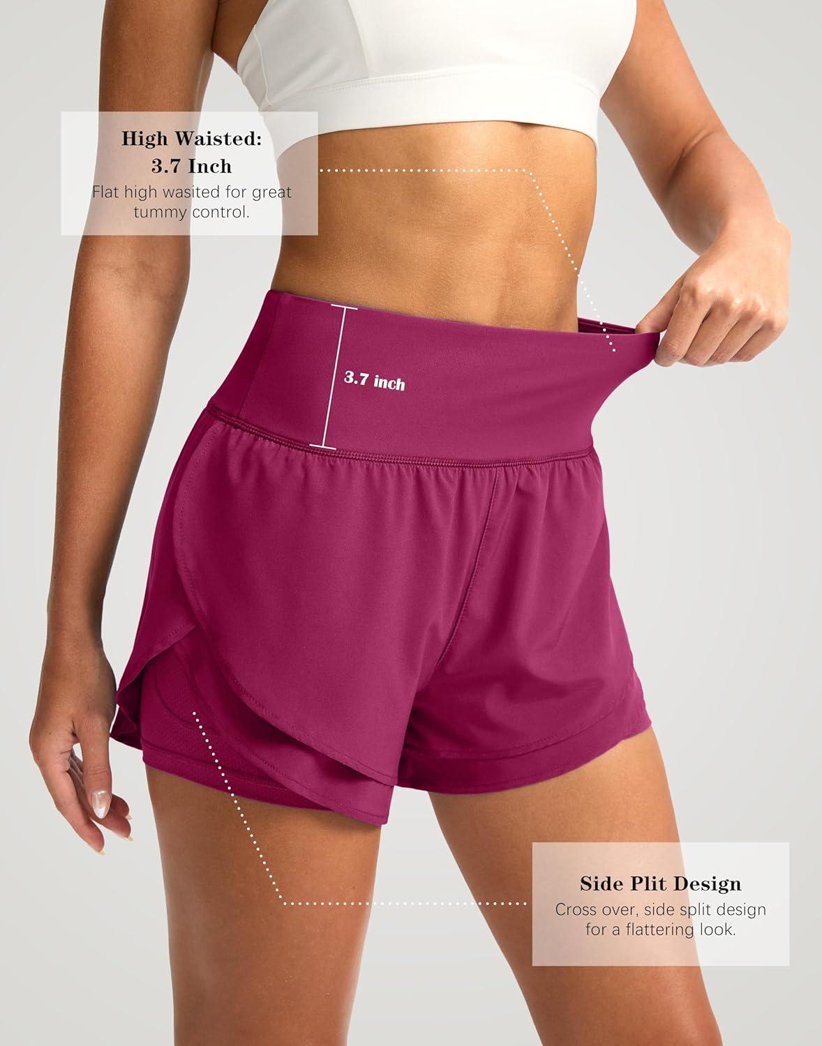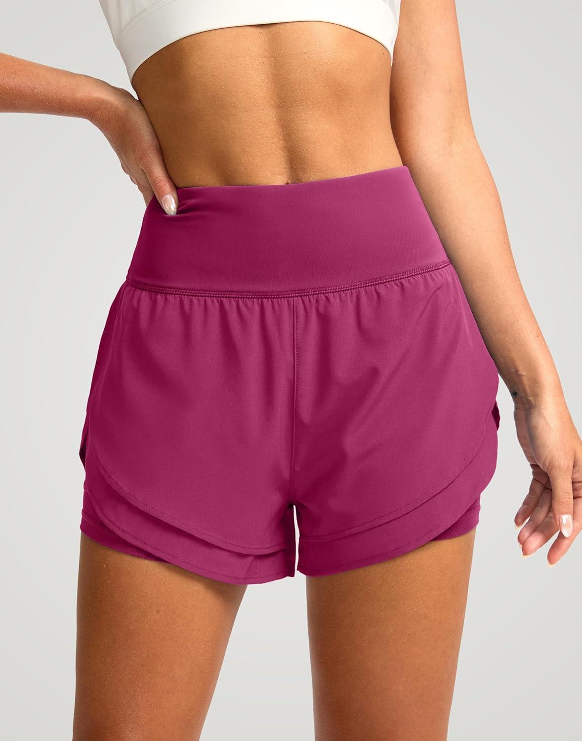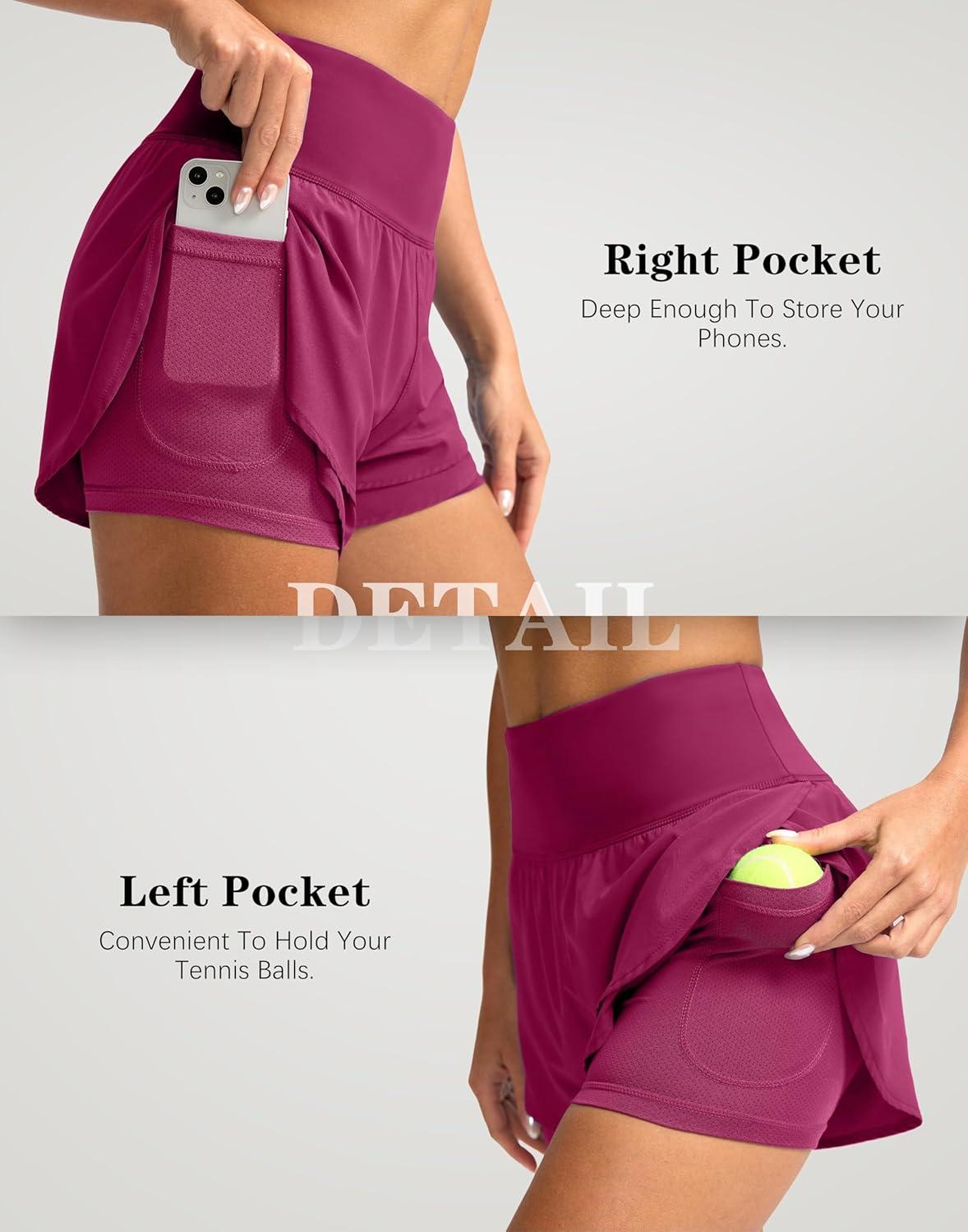 SANTINY Women’s 2 in 1 Running Shorts with Pockets 3″ High Waisted Exercise Workout Athletic Shorts for Women with Liner(Rose)