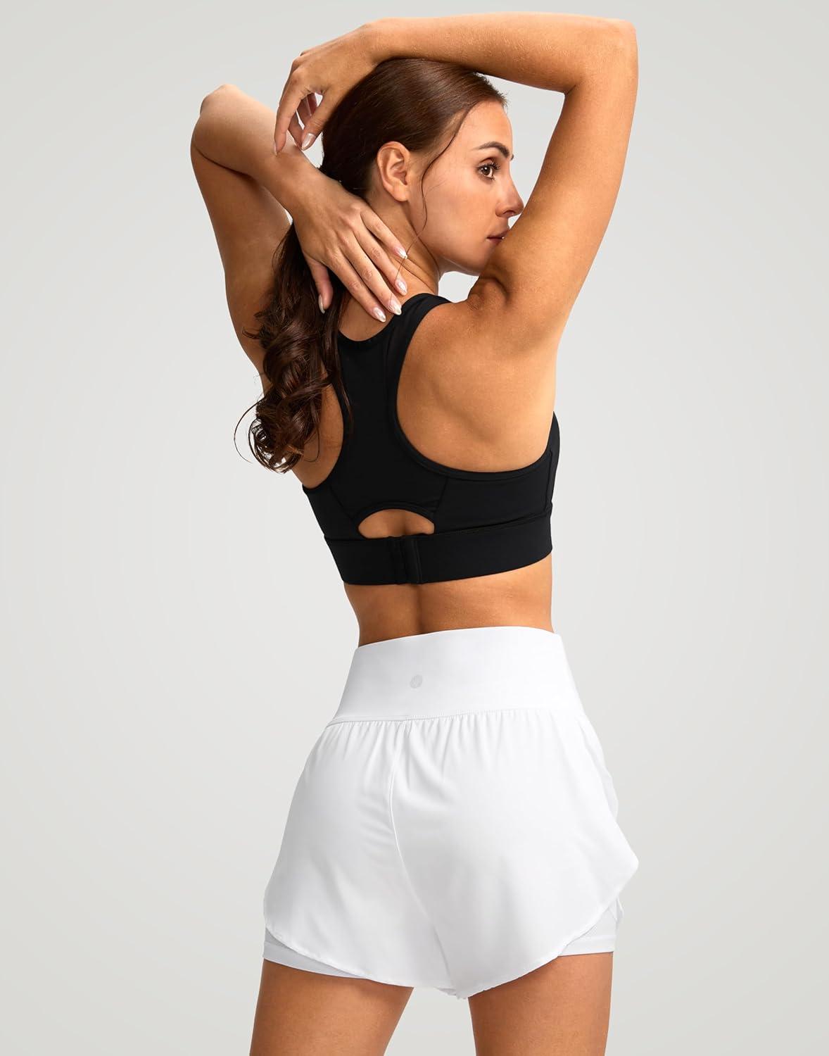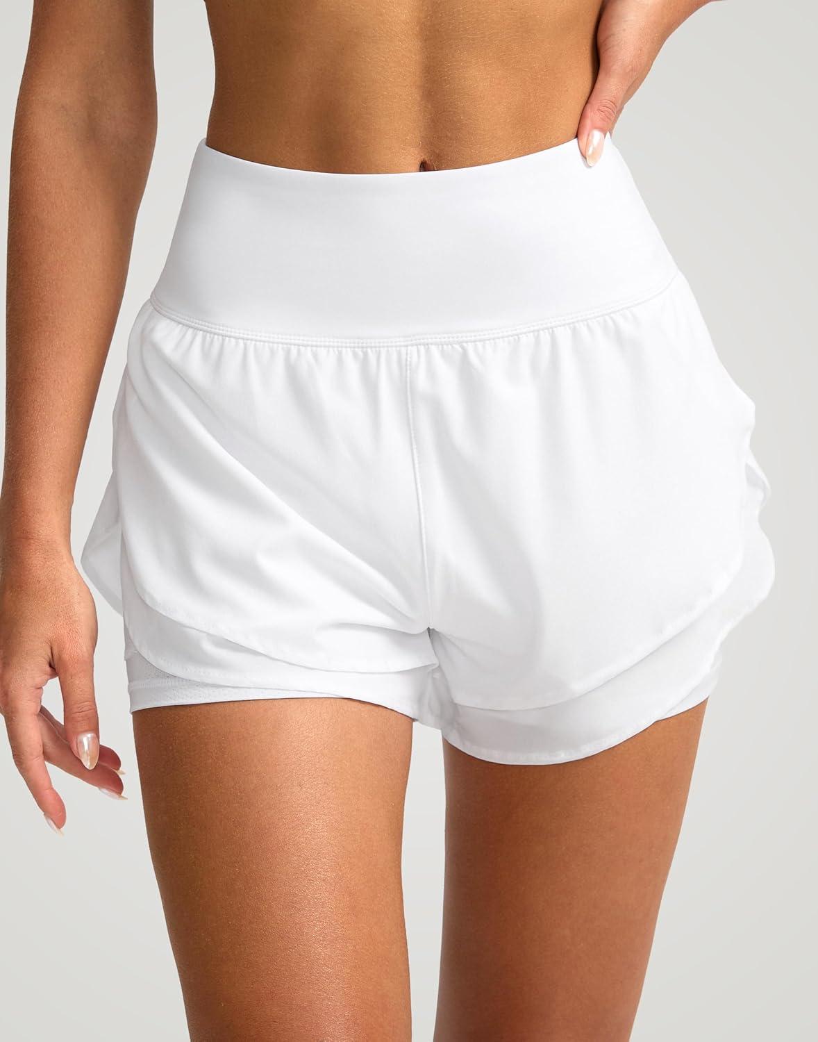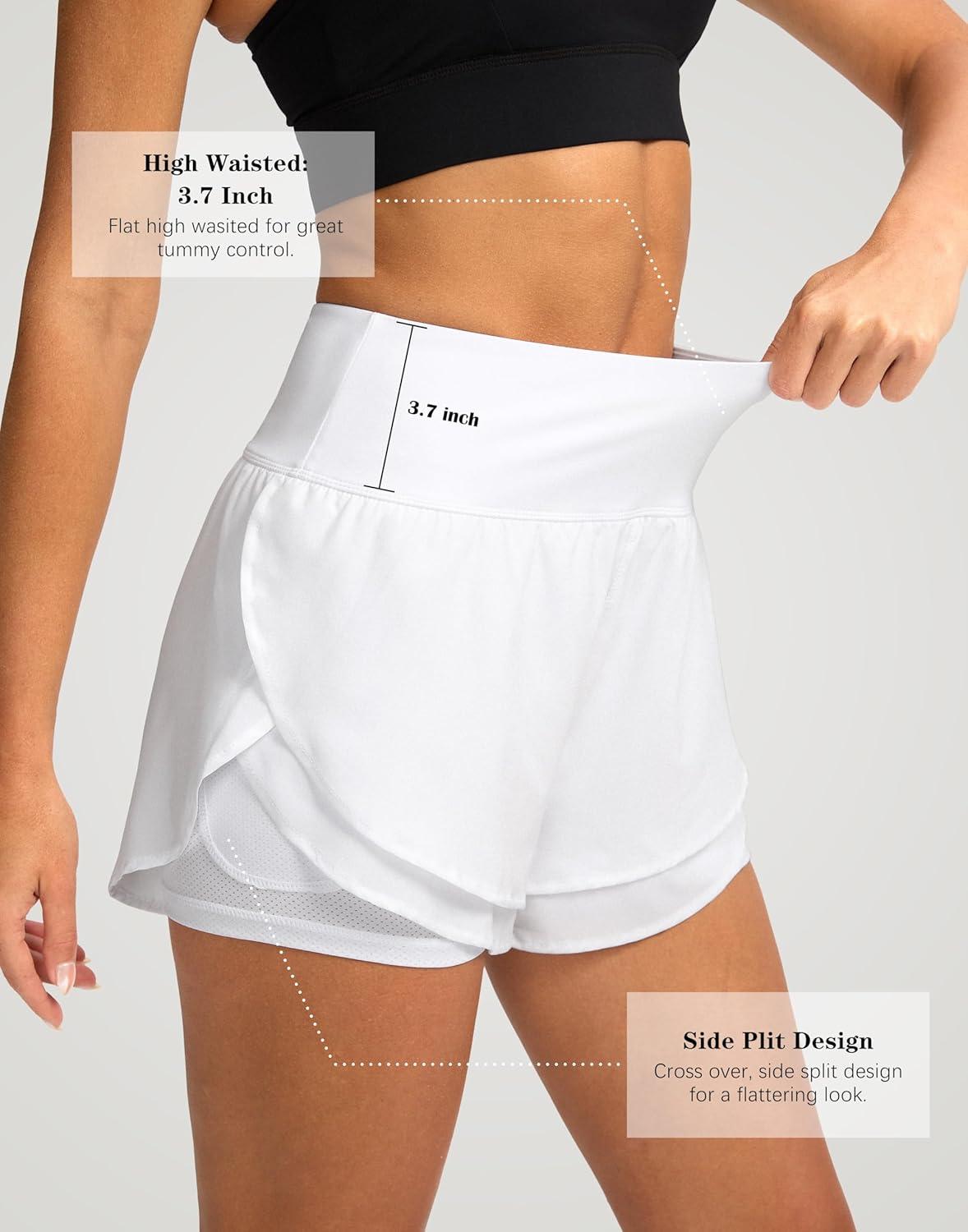 SANTINY Women’s 2 in 1 Running Shorts with Pockets 3″ High Waisted Exercise Workout Athletic Shorts for Women with Liner(White)