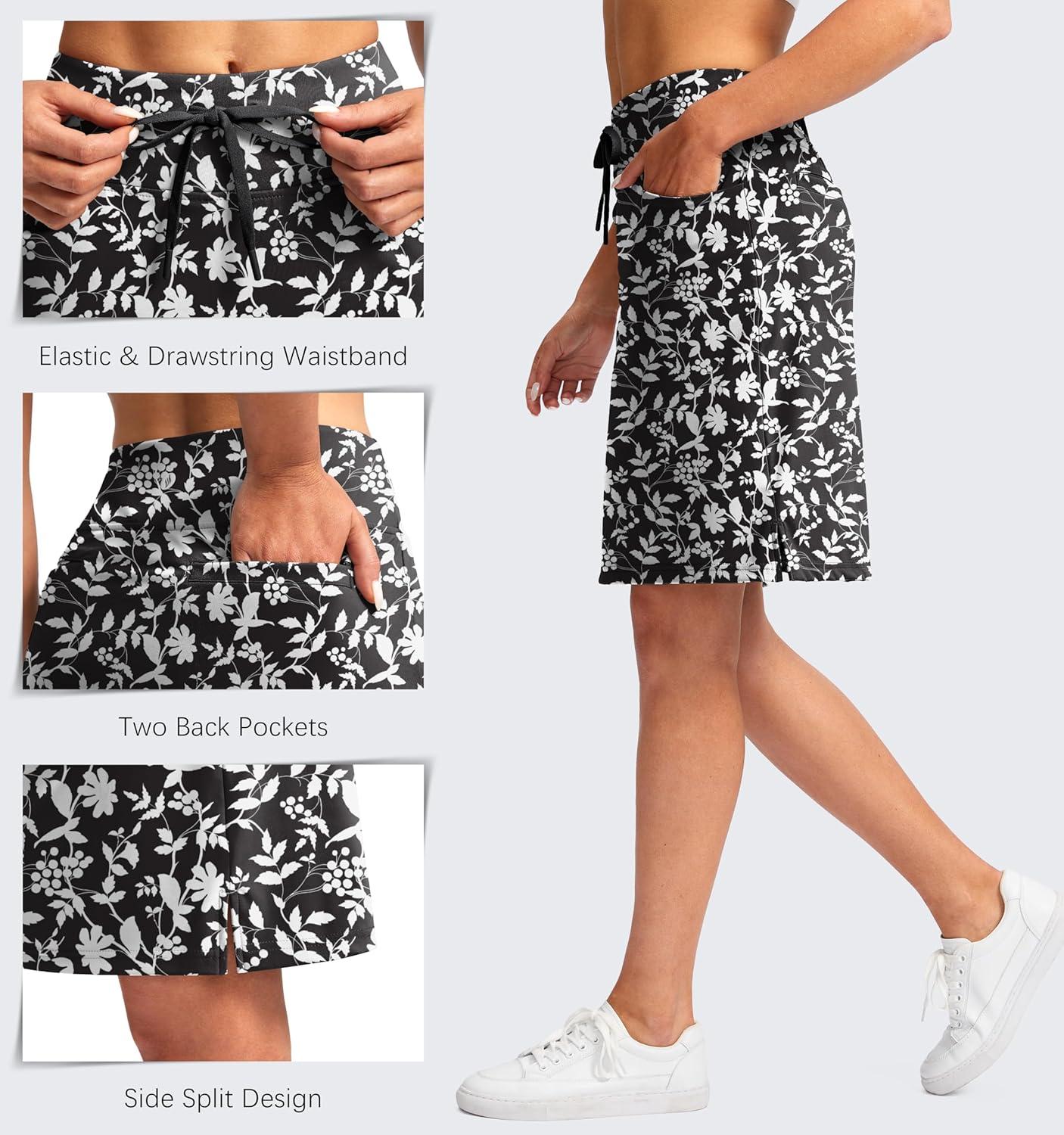 SANTINY Women’s 20” Knee Length Skorts Skirts 6 Pockets High Waisted Drawstring Long Athletic Tennis Golf Skirt Women(Black Flower)