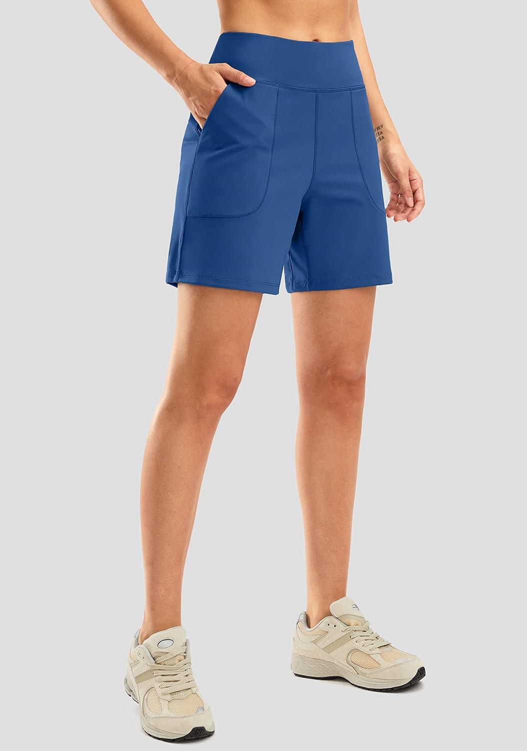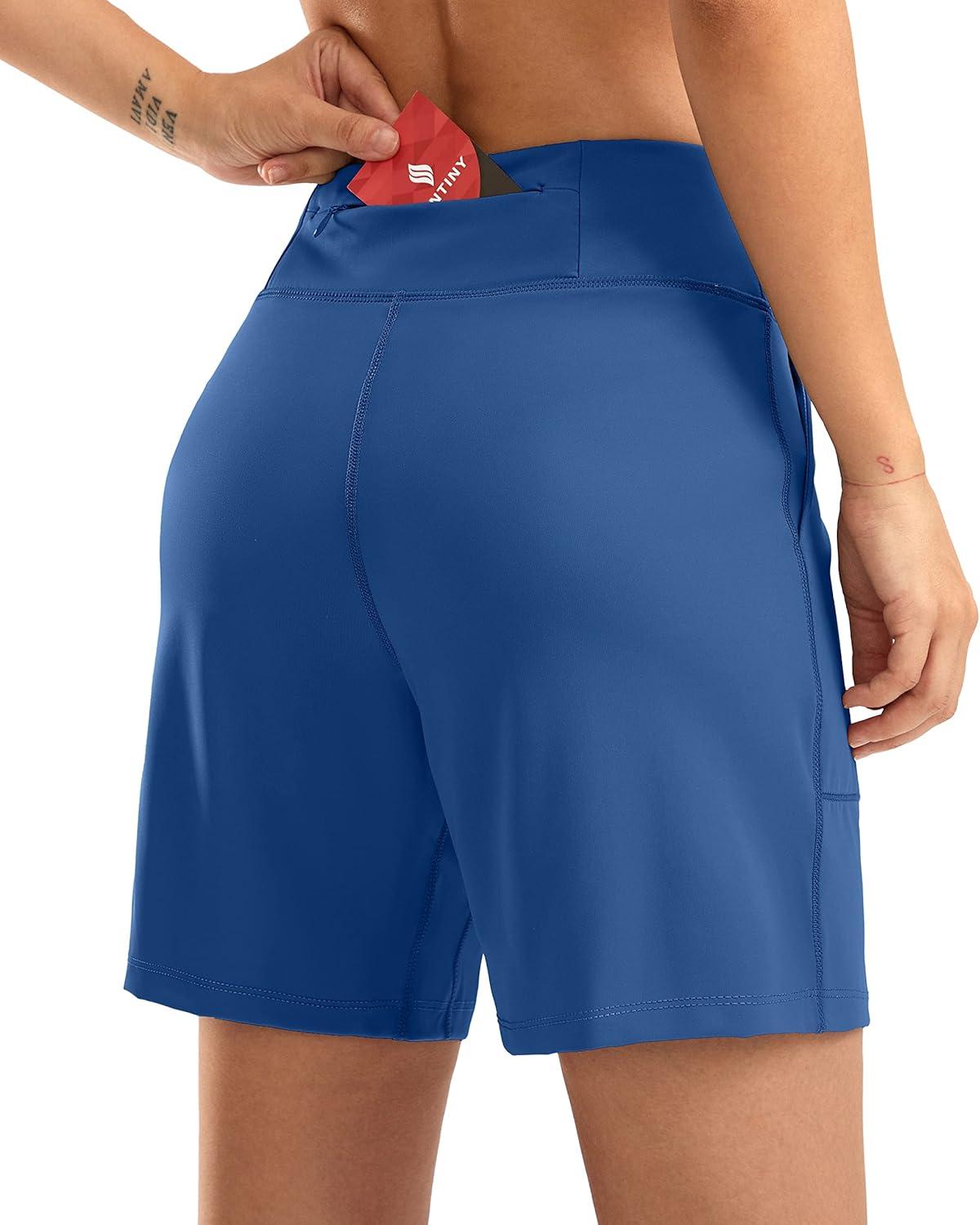 SANTINY Women’s 6” Athletic Long Shorts with 4 Pockets High Waisted Bermuda Shorts for Women Walking Running Casual(Blue)
