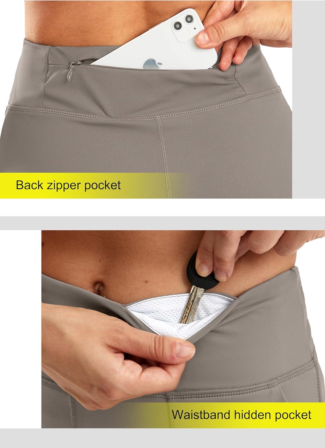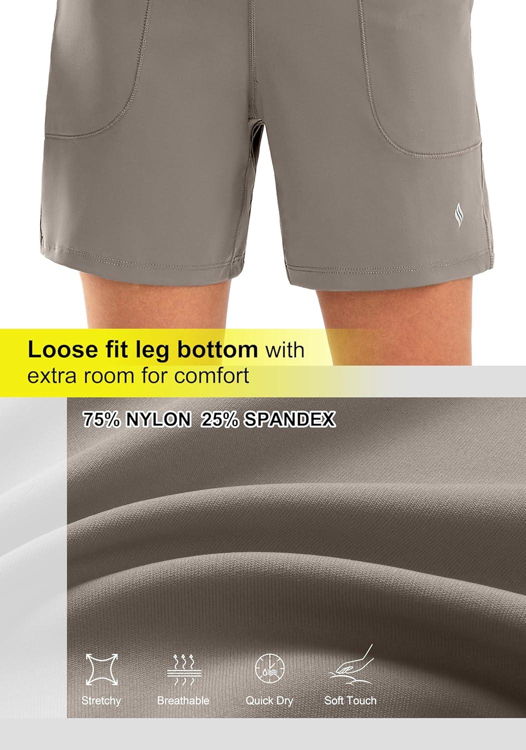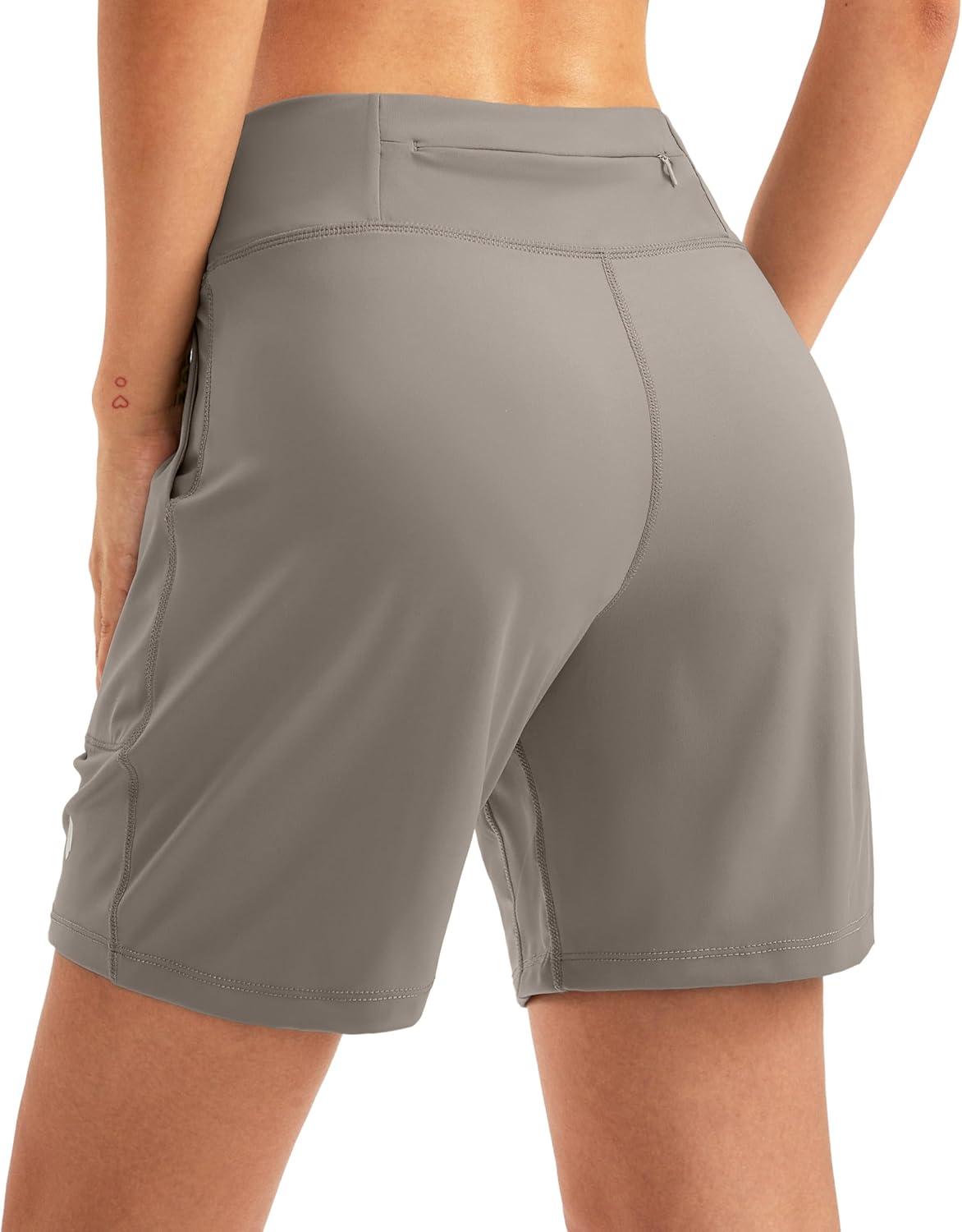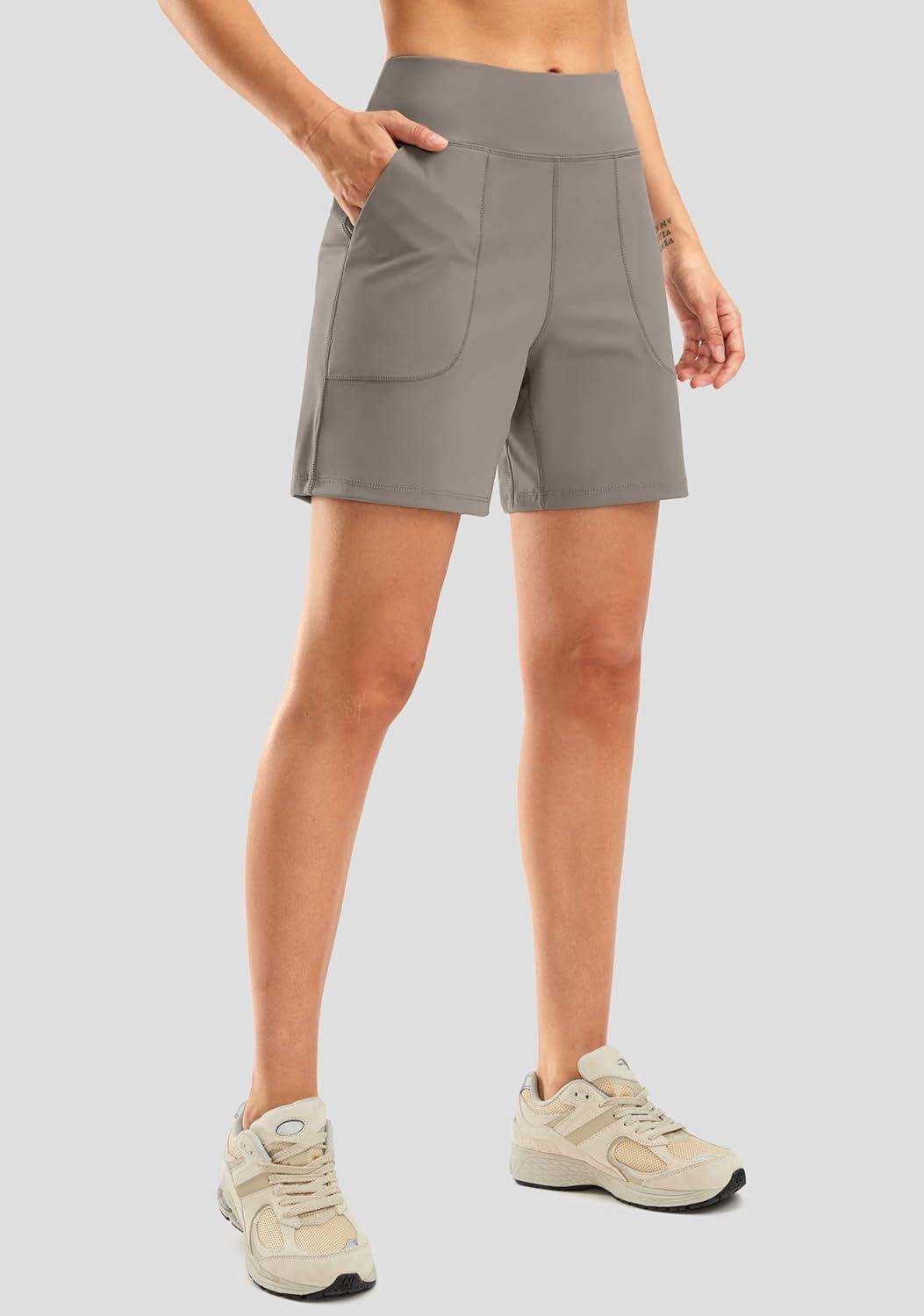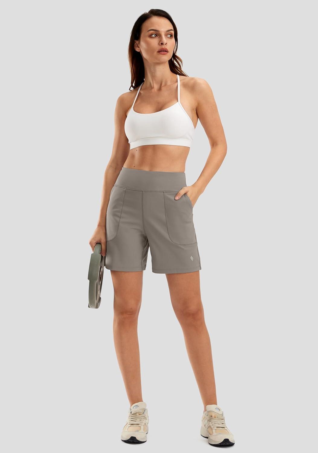 SANTINY Women’s 6” Athletic Long Shorts with 4 Pockets High Waisted Bermuda Shorts for Women Walking Running Casual(Light Khaki)