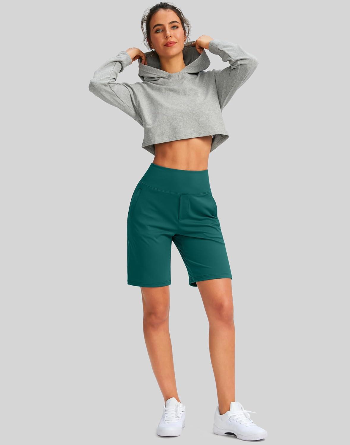 SANTINY Women’s 9″ High Waisted Bermuda Shorts with 4 Pockets Knee Length Long Shorts for Women Workout Athletic Casual(Borealis Green)