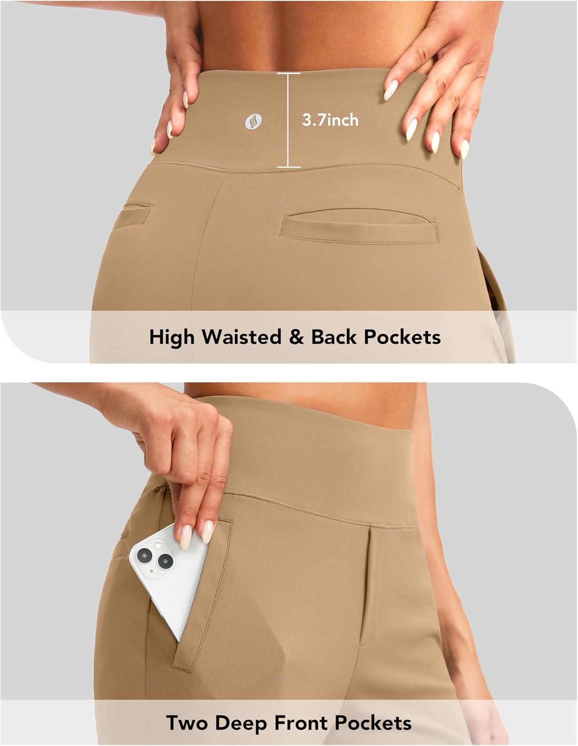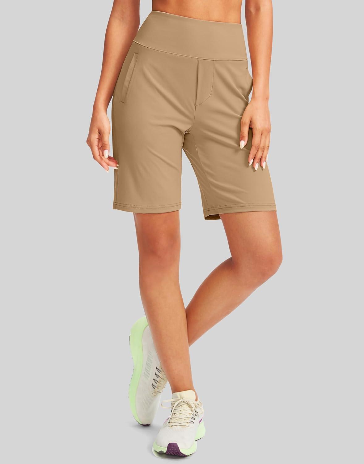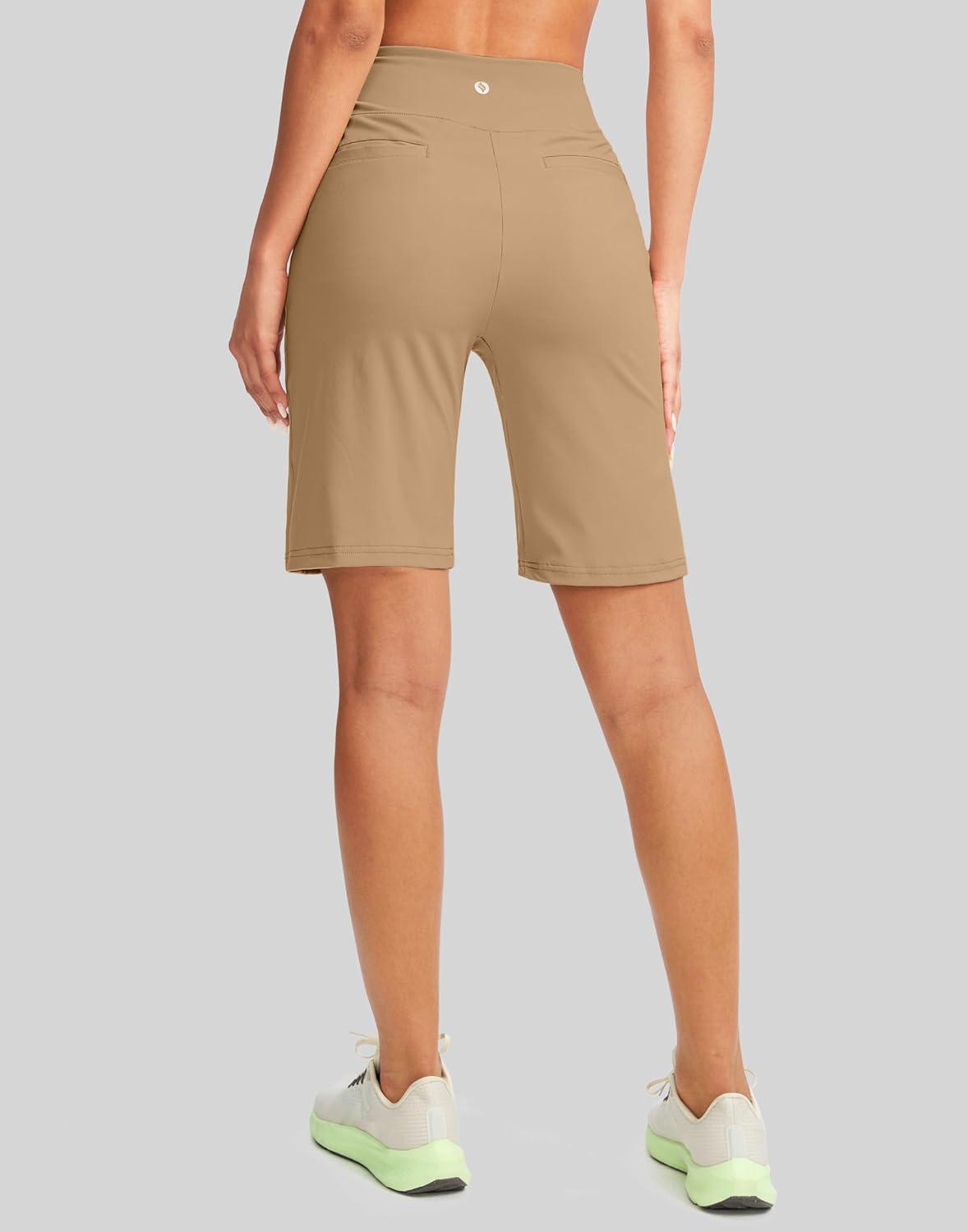 SANTINY Women’s 9″ High Waisted Bermuda Shorts with 4 Pockets Knee Length Long Shorts for Women Workout Athletic Casual(Khaki)