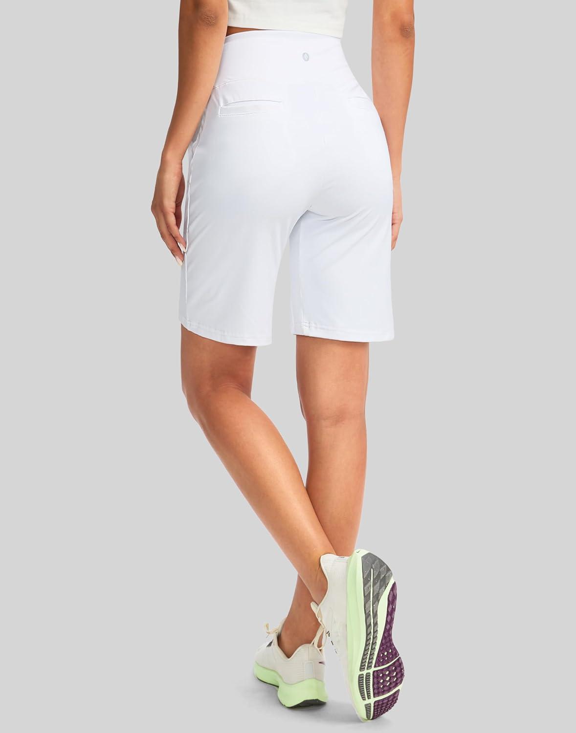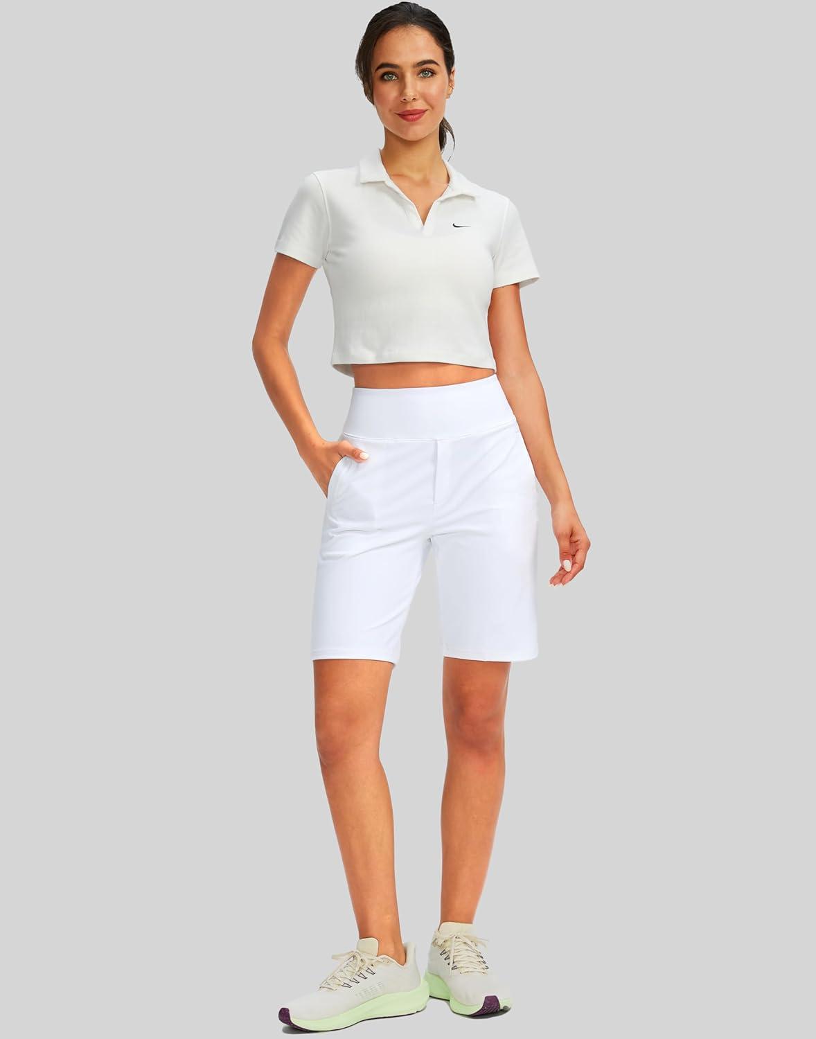 SANTINY Women’s 9″ High Waisted Bermuda Shorts with 4 Pockets Knee Length Long Shorts for Women Workout Athletic Casual(White)