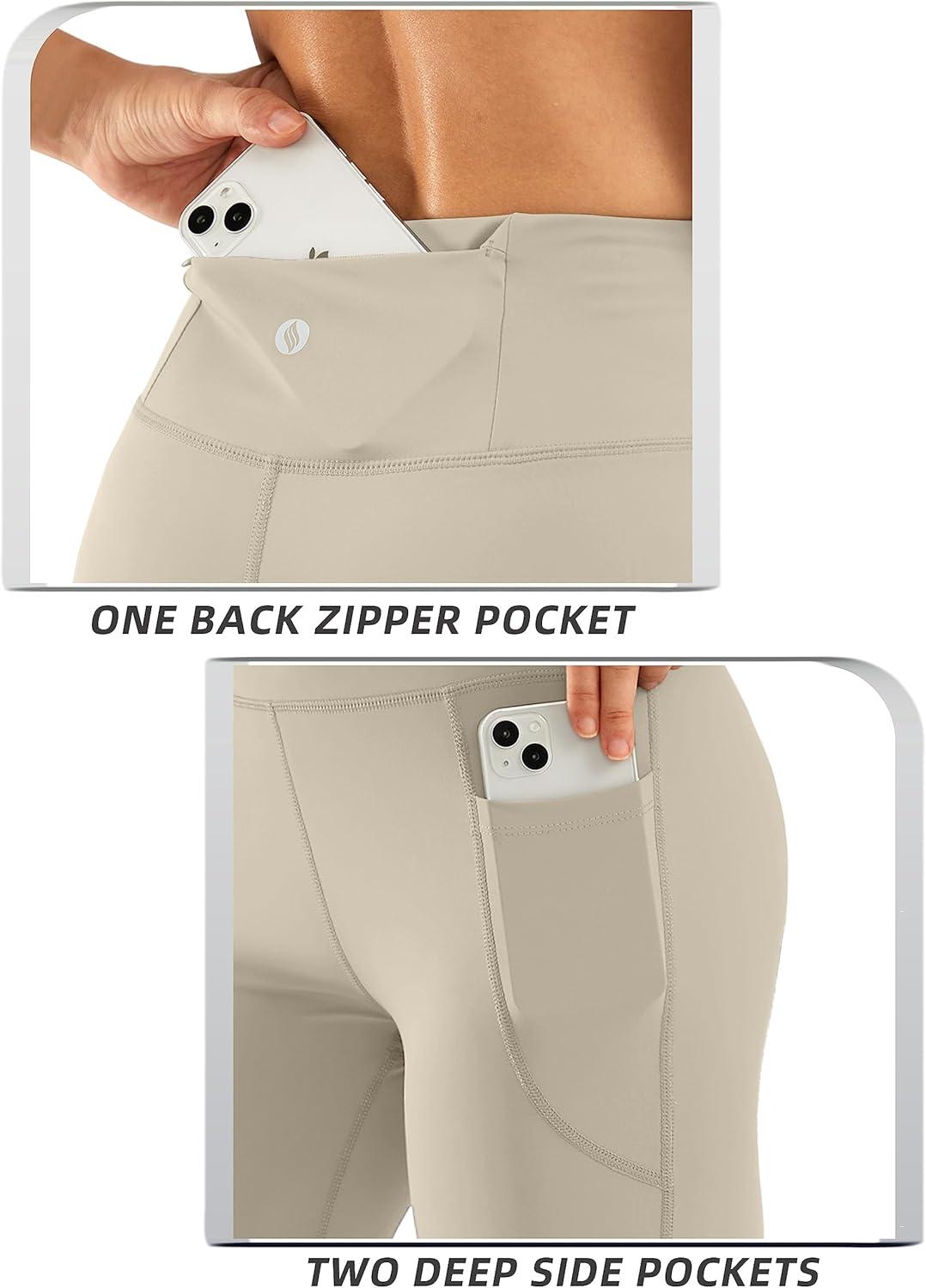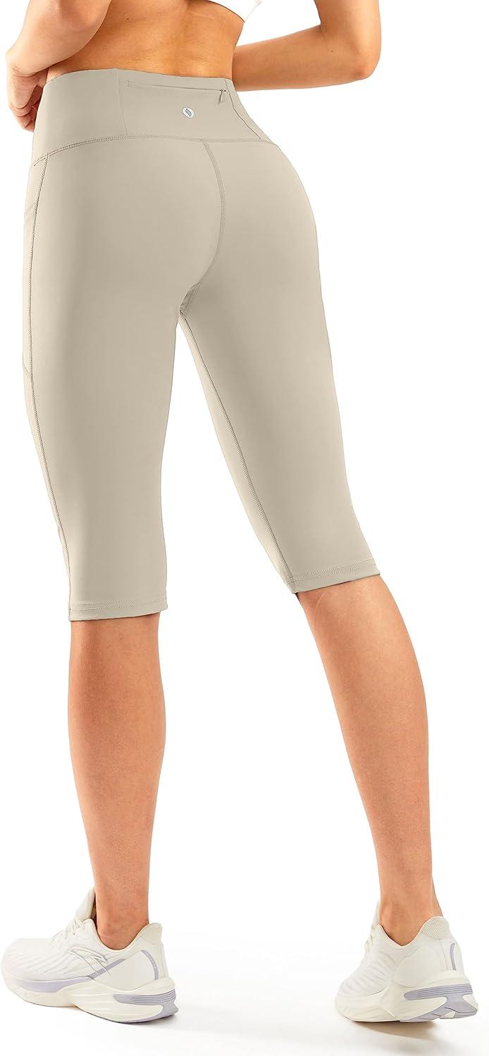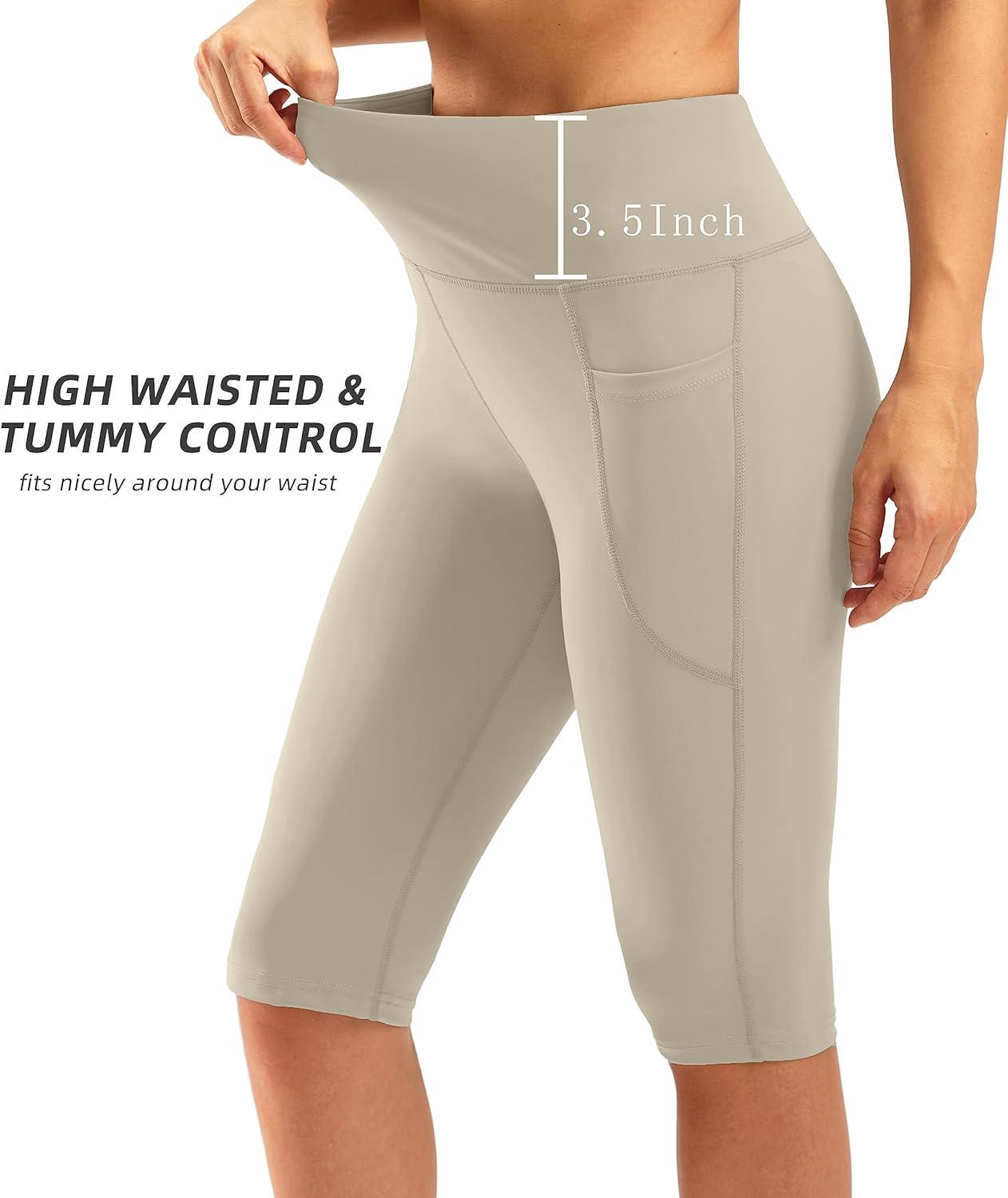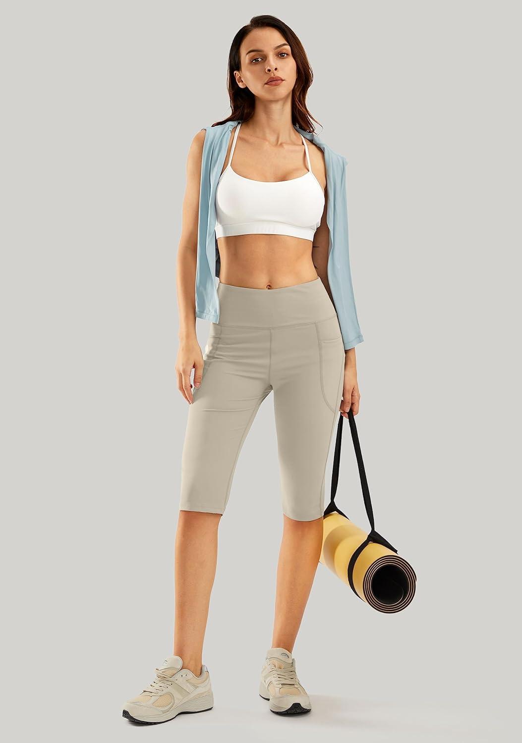 SANTINY Women’s Knee Length Capri Leggings with Pockets High Waisted Workout Exercise Yoga Capris Pants for Women(Beige)
