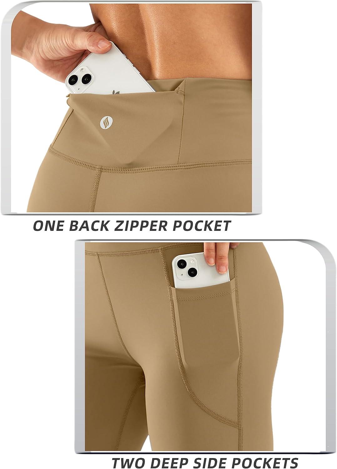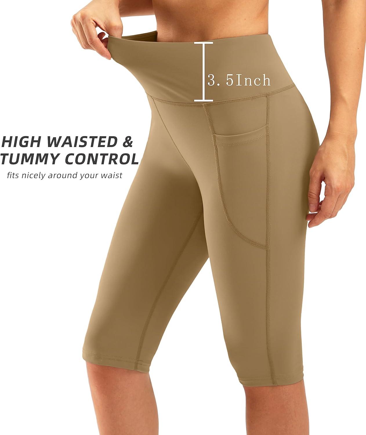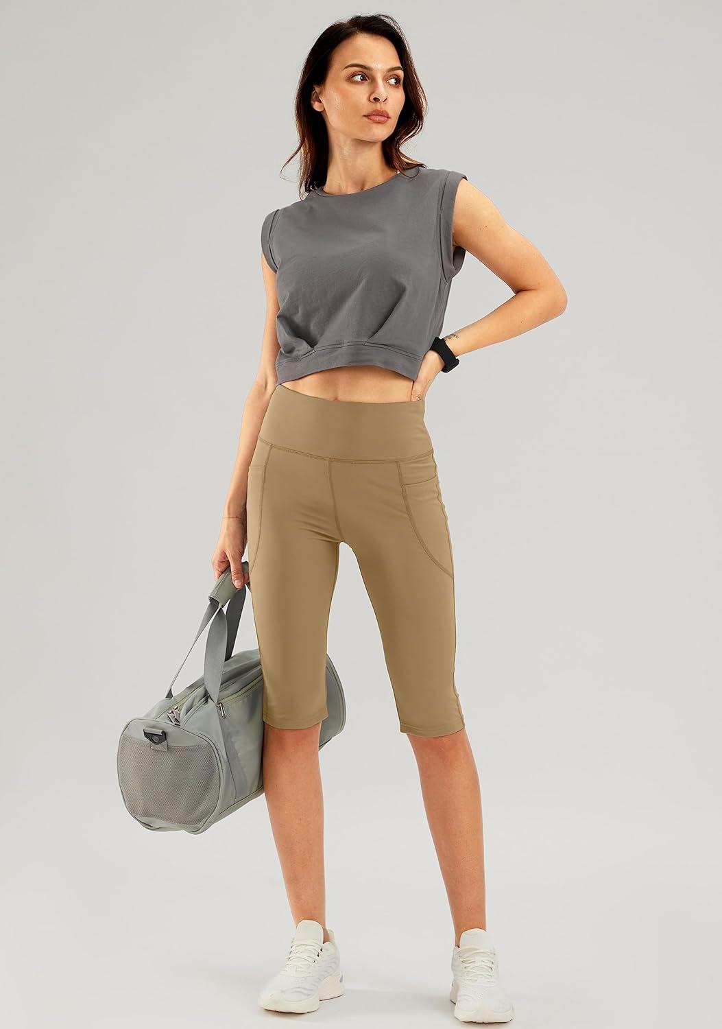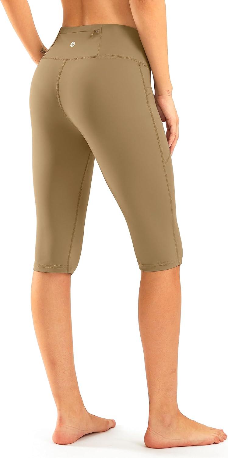 SANTINY Women’s Knee Length Capri Leggings with Pockets High Waisted Workout Exercise Yoga Capris Pants for Women(Dark Khaki)