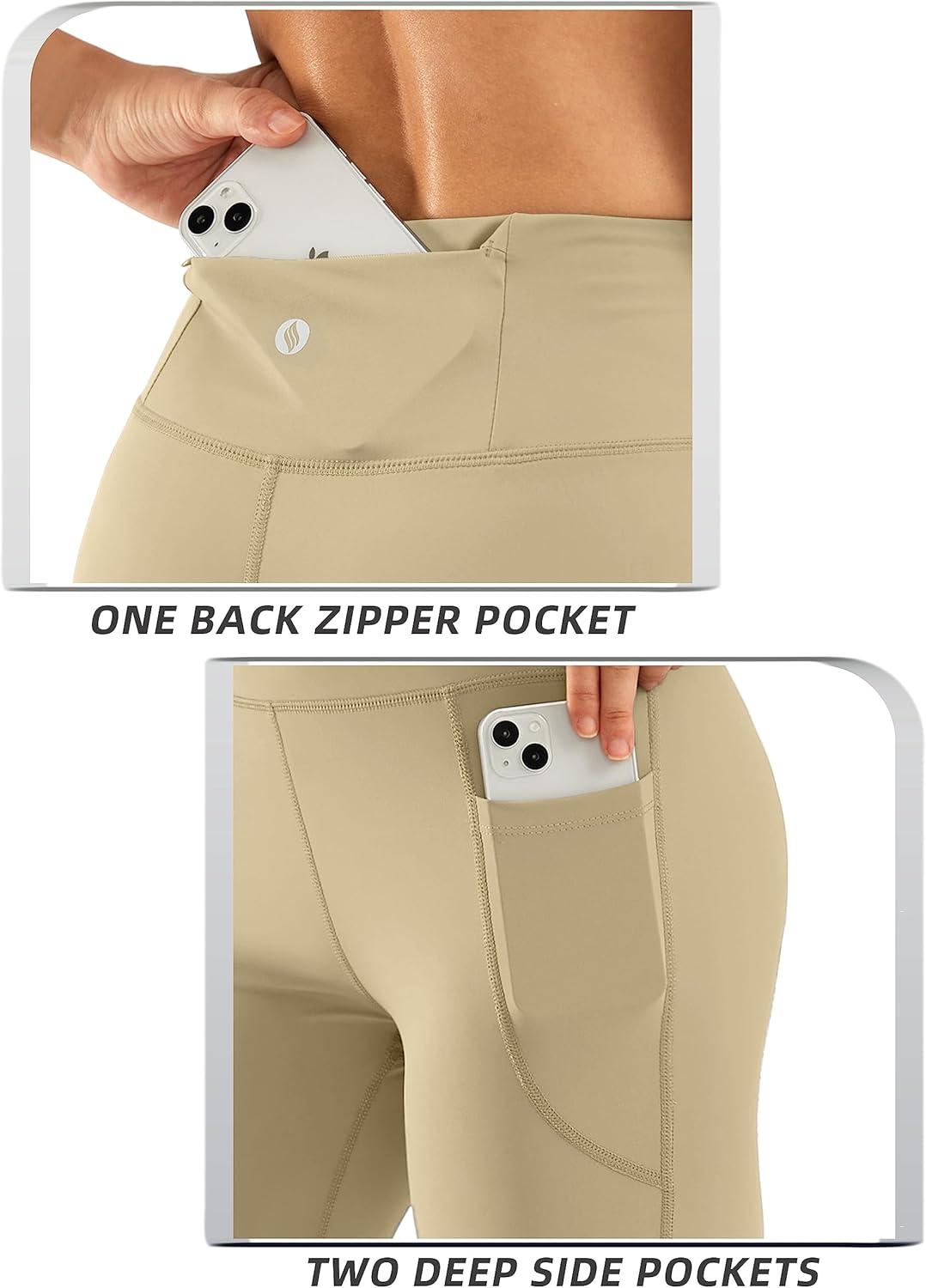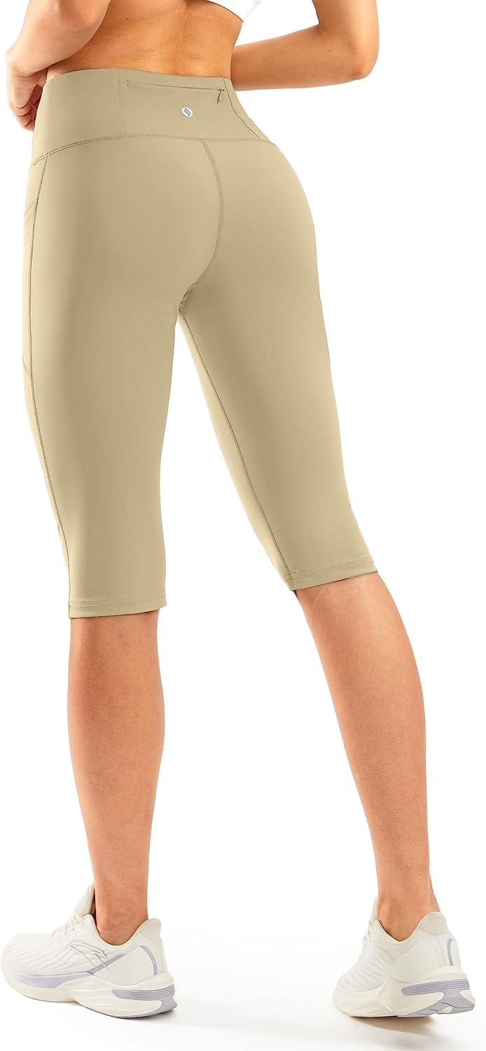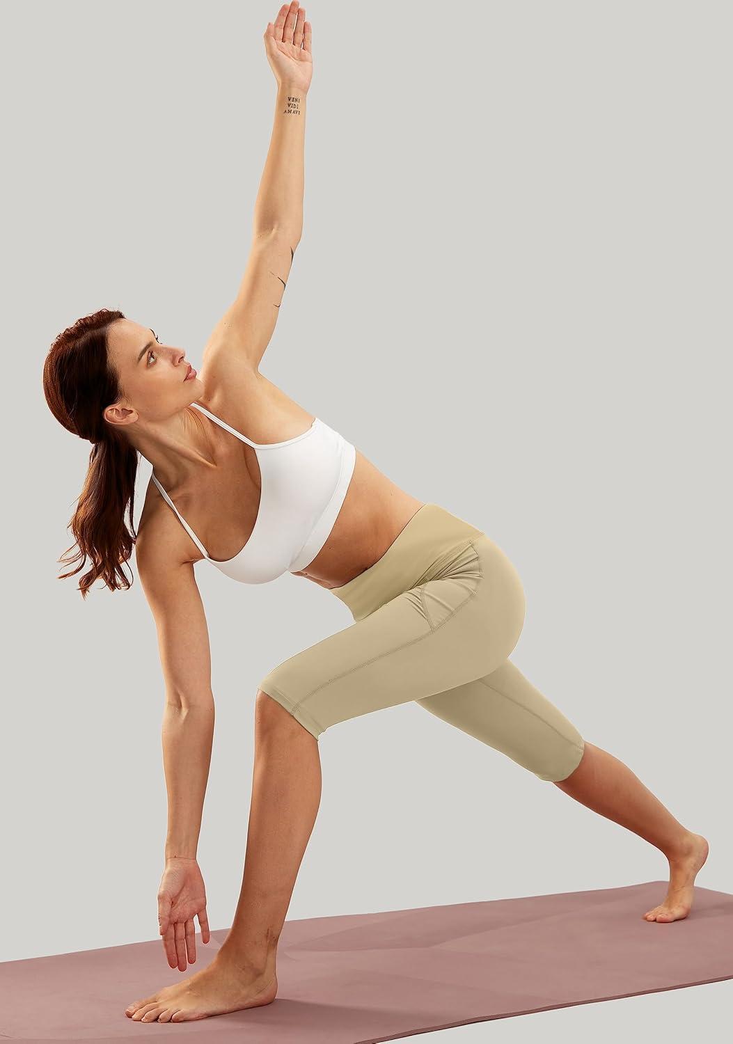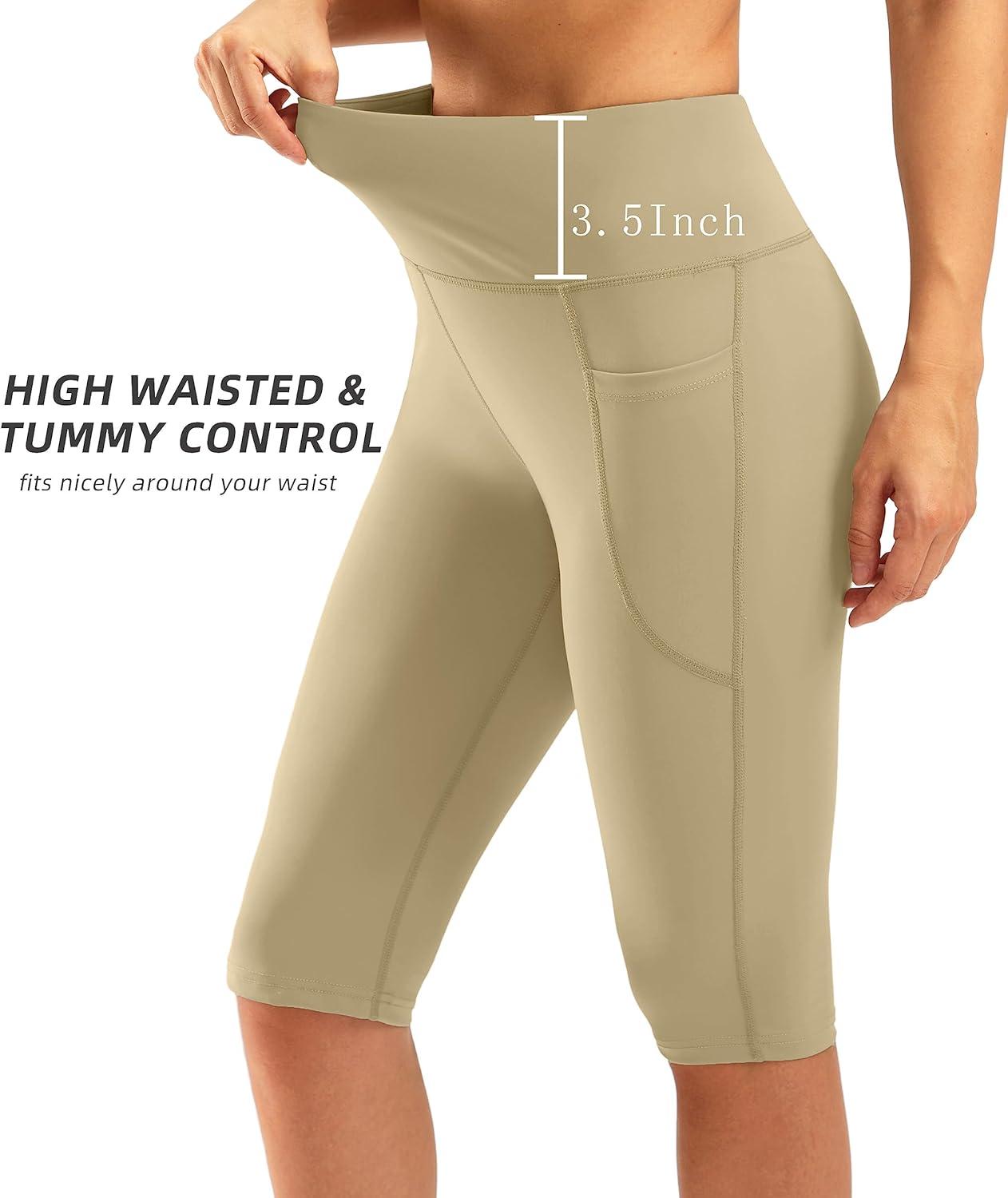 SANTINY Women’s Knee Length Capri Leggings with Pockets High Waisted Workout Exercise Yoga Capris Pants for Women(Stone)