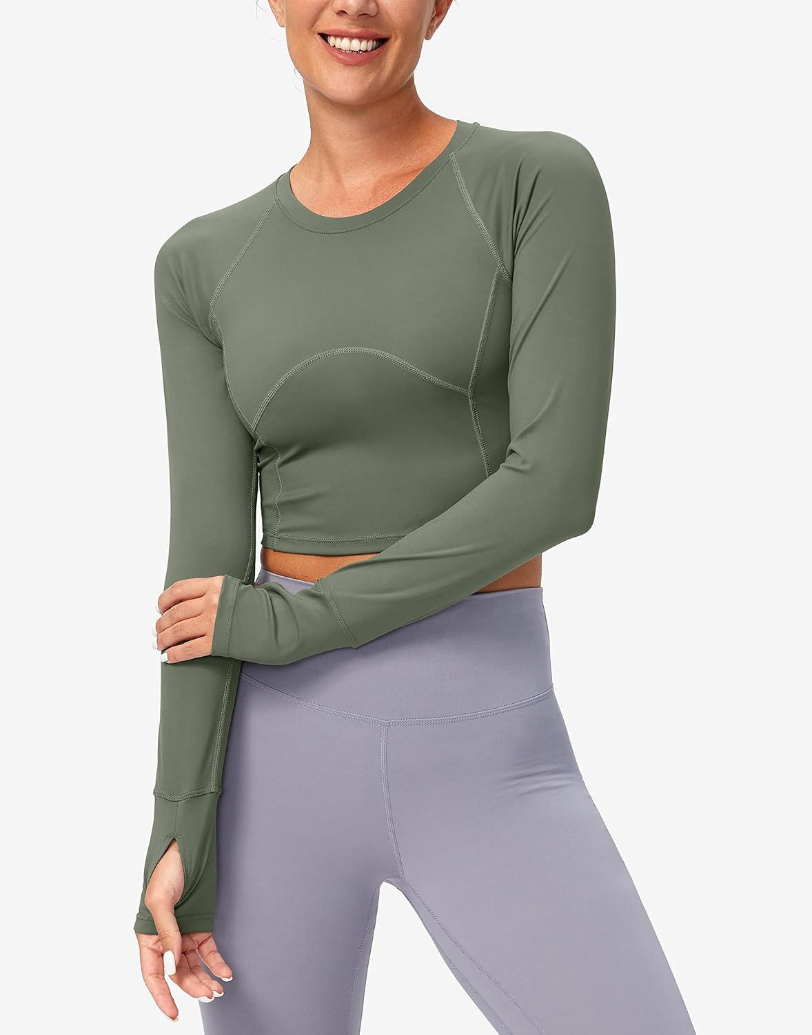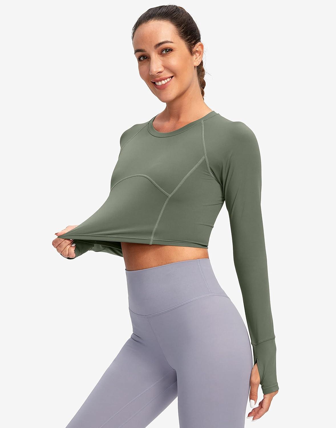 SANTINY Women’s Long Sleeve Crop Workout Tops Slim Fit Gym Yoga Running Shirts for Women(Grey Sage)