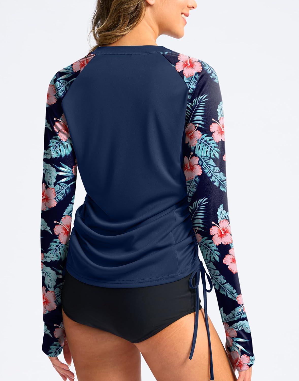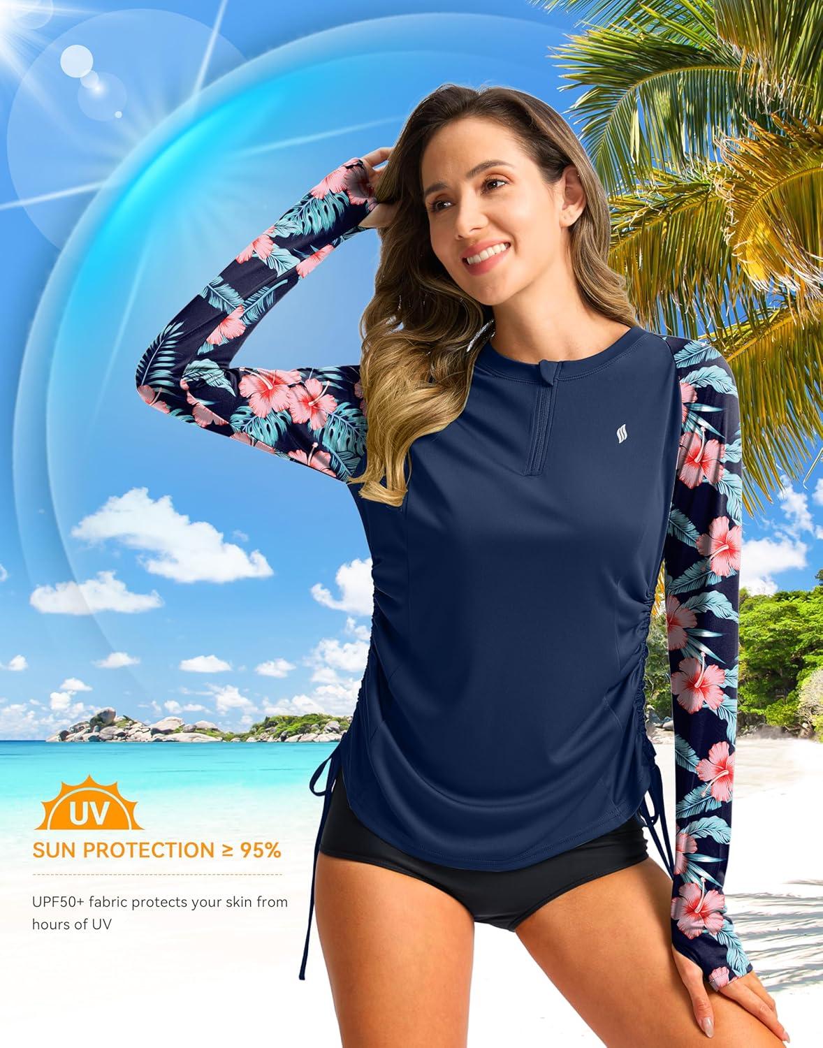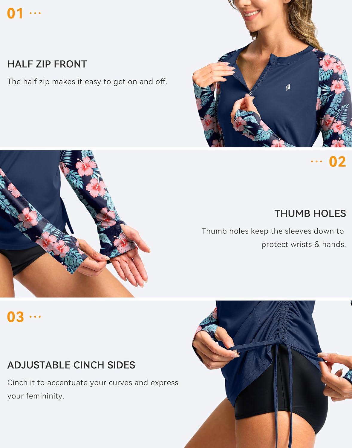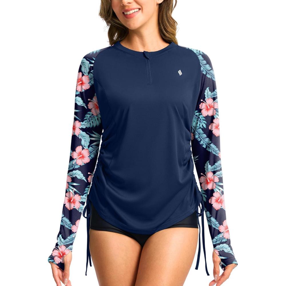 SANTINY Women’s Rash Guard UPF50+ SPF Long Sleeve Swimsuits Top UV Sun Protection Swim Shirts for Woman with Zip(Navy Flower)