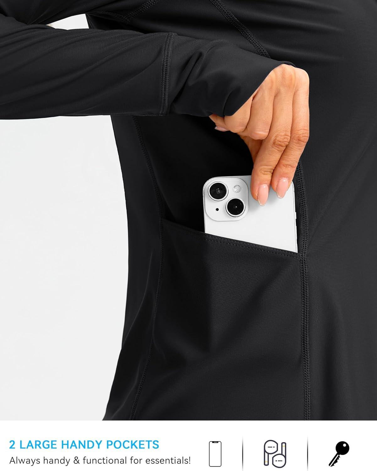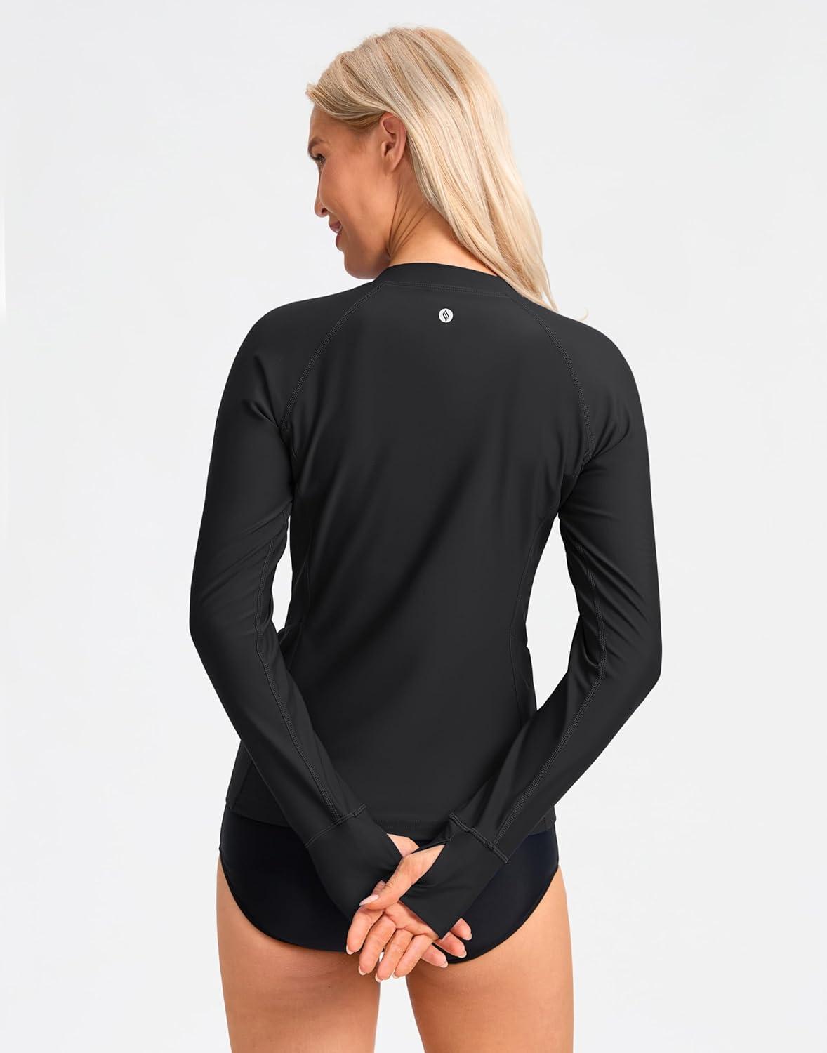 SANTINY Women’s Rash Guard UPF50+ SPF UV Protection Long Sleeve Swimsuit Top with Pockets Zip Front Swim Shirts Woman(Black)