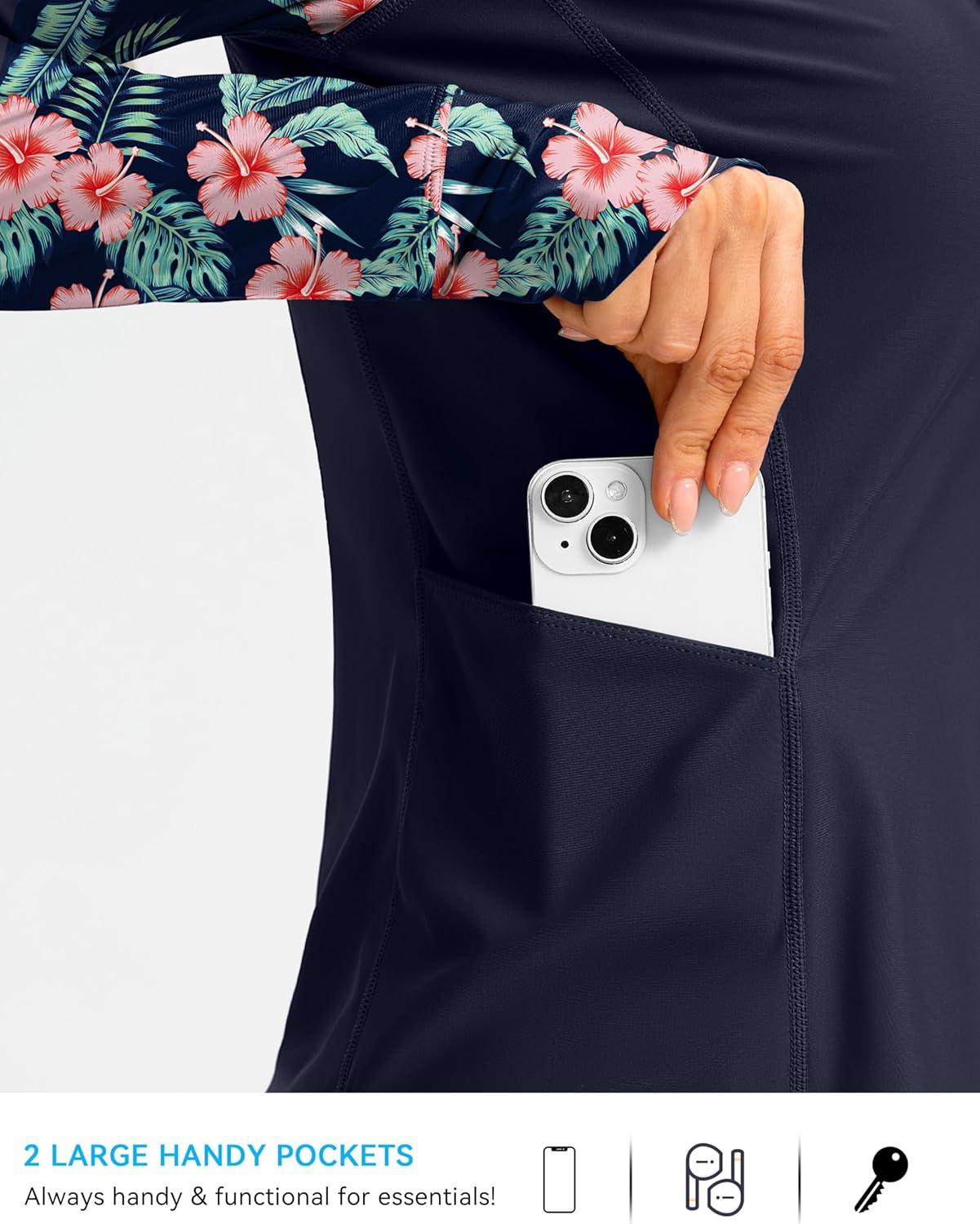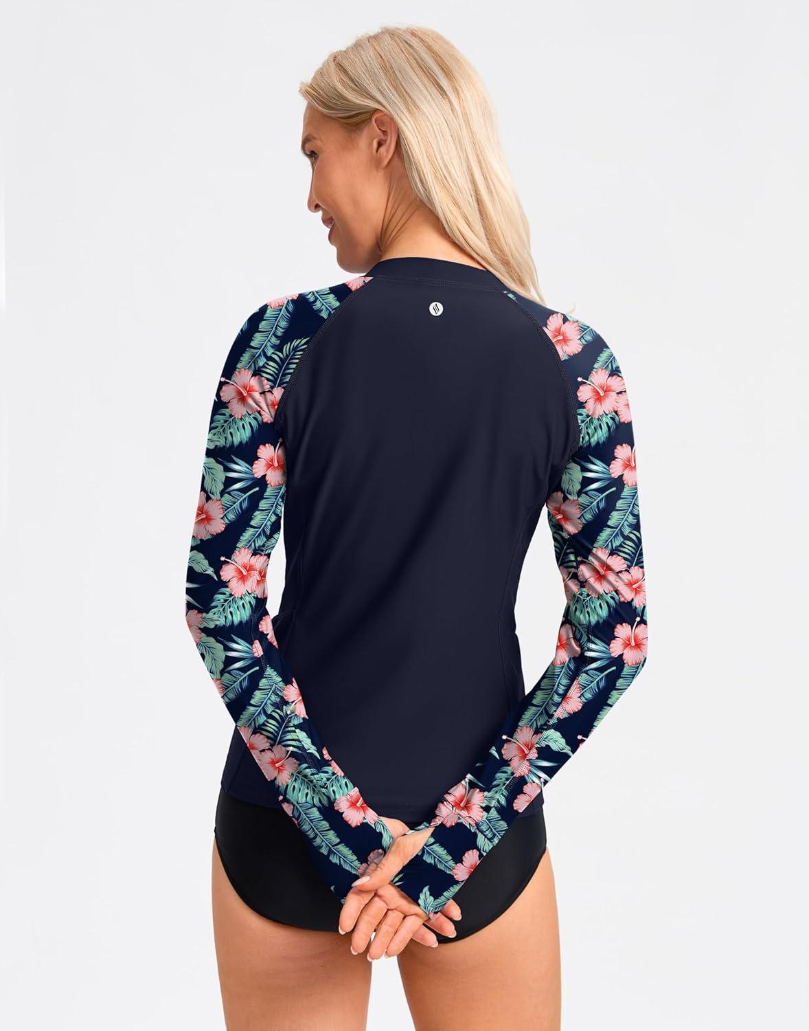 SANTINY Women’s Rash Guard UPF50+ SPF UV Protection Long Sleeve Swimsuit Top with Pockets Zip Front Swim Shirts Woman(Navy # Floral)