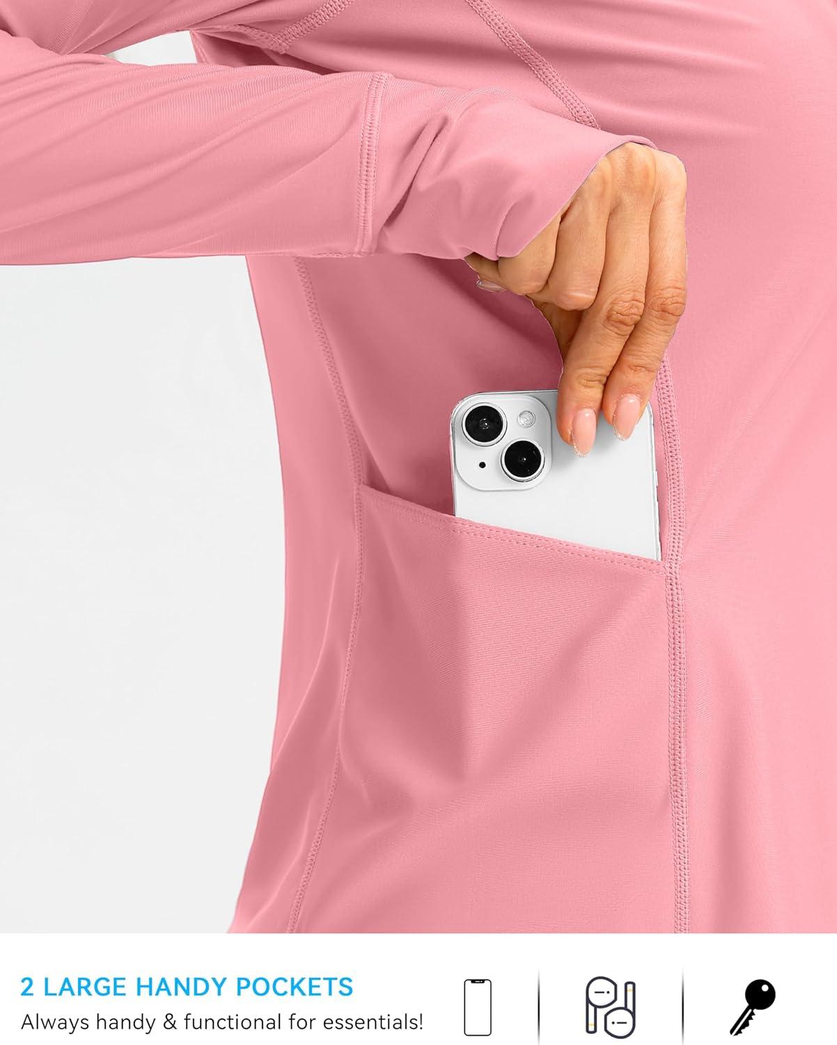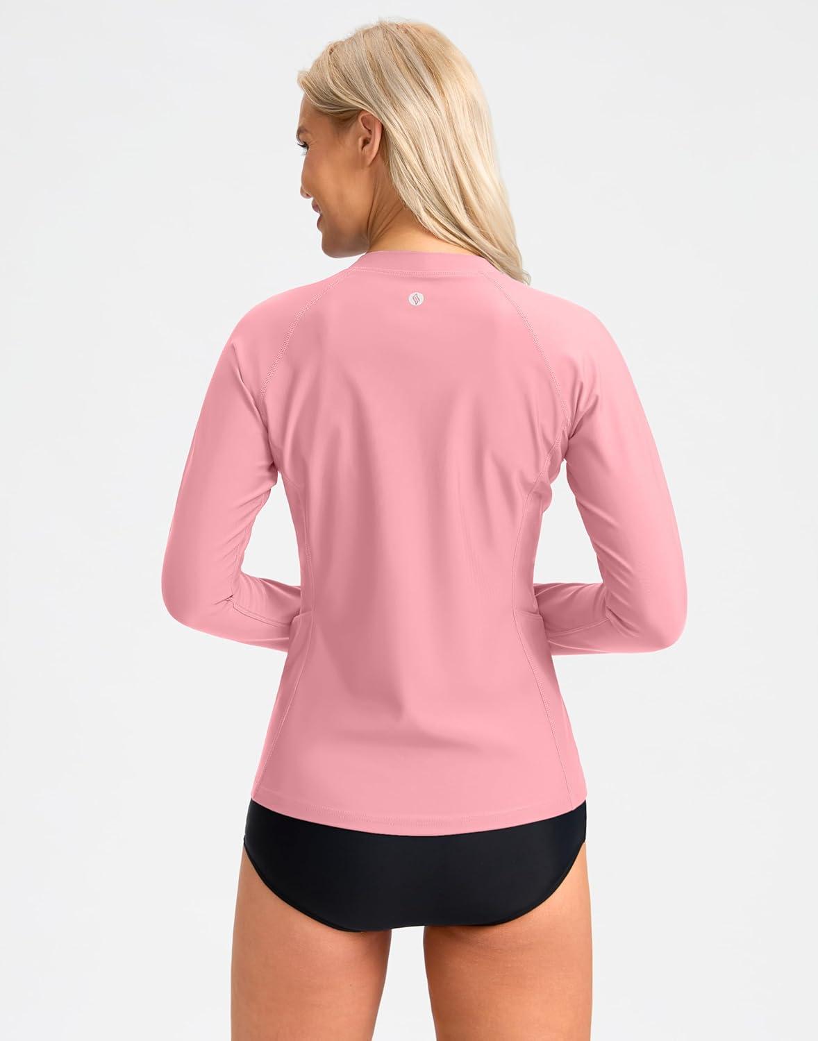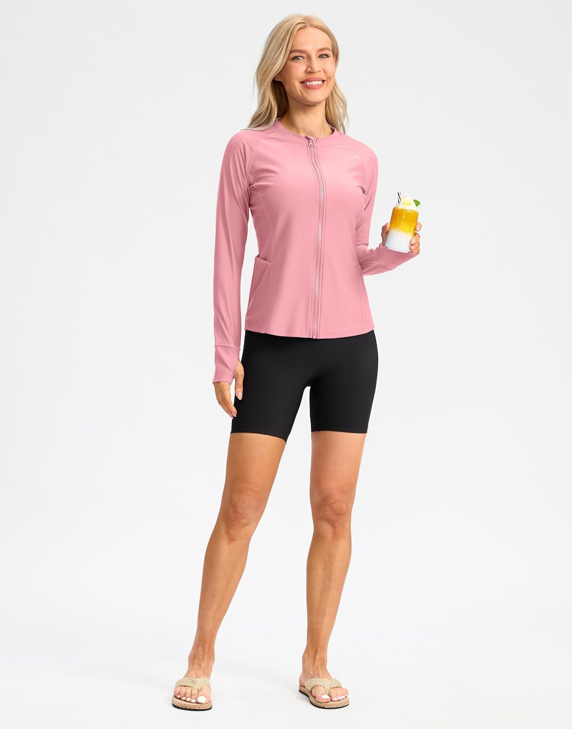 SANTINY Women’s Rash Guard UPF50+ SPF UV Protection Long Sleeve Swimsuit Top with Pockets Zip Front Swim Shirts Woman(Pink)