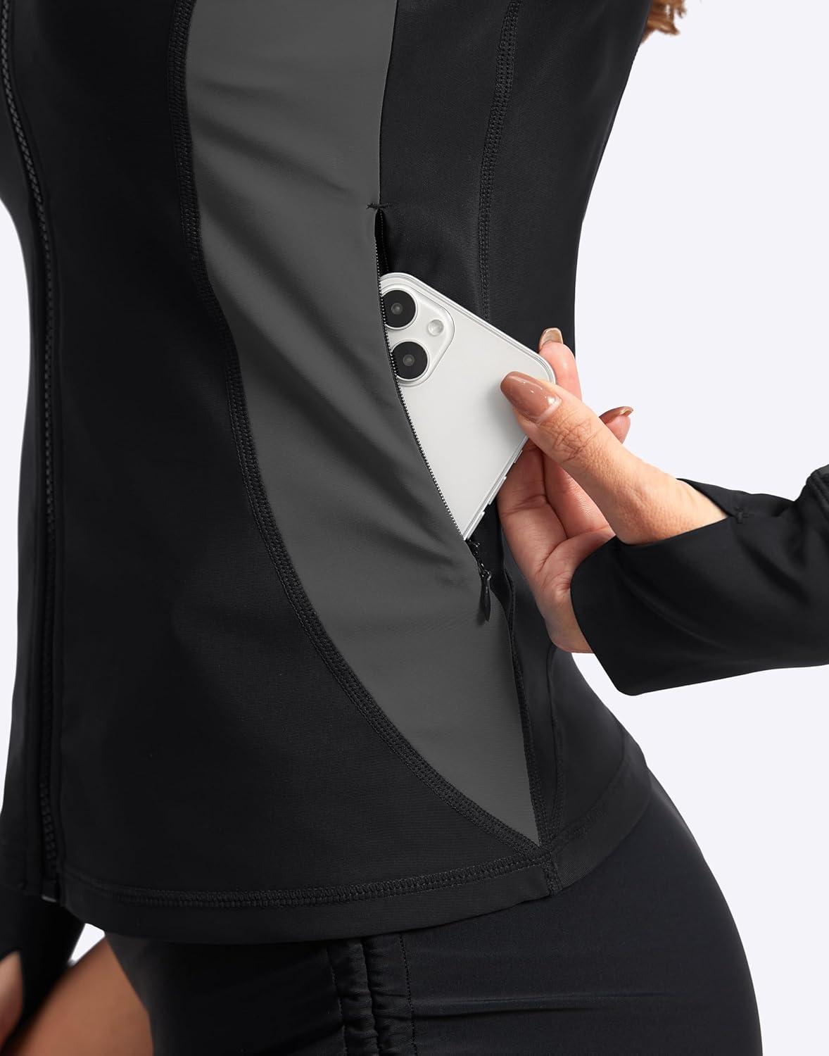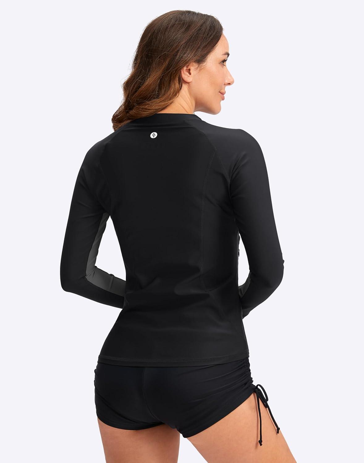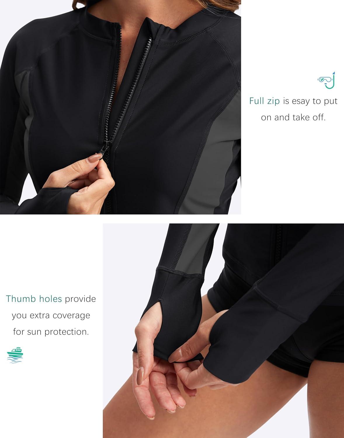SANTINY Women’s Rash Guard Zipper Pockets UPF50+ Sun Protection Long Sleeve Swimsuit Top Zip Front Swim Shirt for Women(Black # Dark Grey)