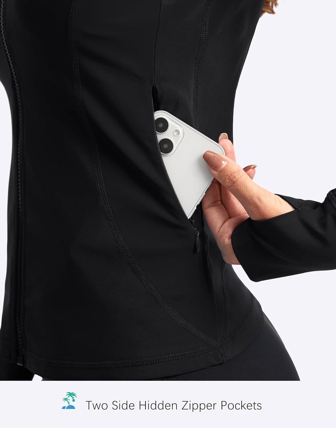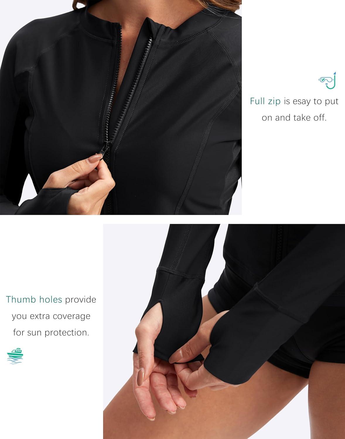 SANTINY Women’s Rash Guard Zipper Pockets UPF50+ Sun Protection Long Sleeve Swimsuit Top Zip Front Swim Shirt for Women(Black)