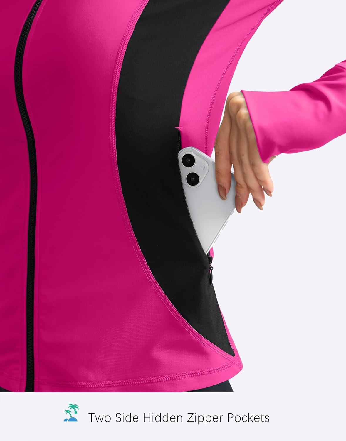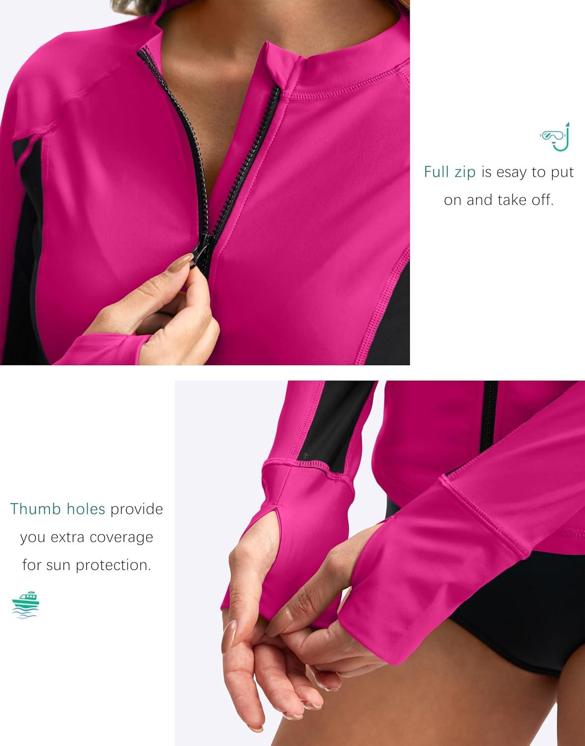 SANTINY Women’s Rash Guard Zipper Pockets UPF50+ Sun Protection Long Sleeve Swimsuit Top Zip Front Swim Shirt for Women(Rose)