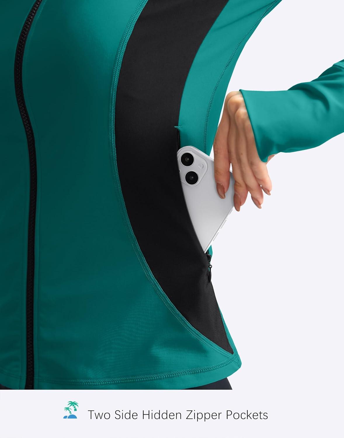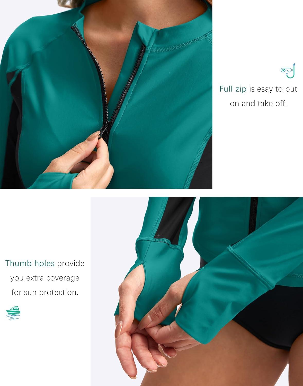 SANTINY Women’s Rash Guard Zipper Pockets UPF50+ Sun Protection Long Sleeve Swimsuit Top Zip Front Swim Shirt for Women(Teal Blue)