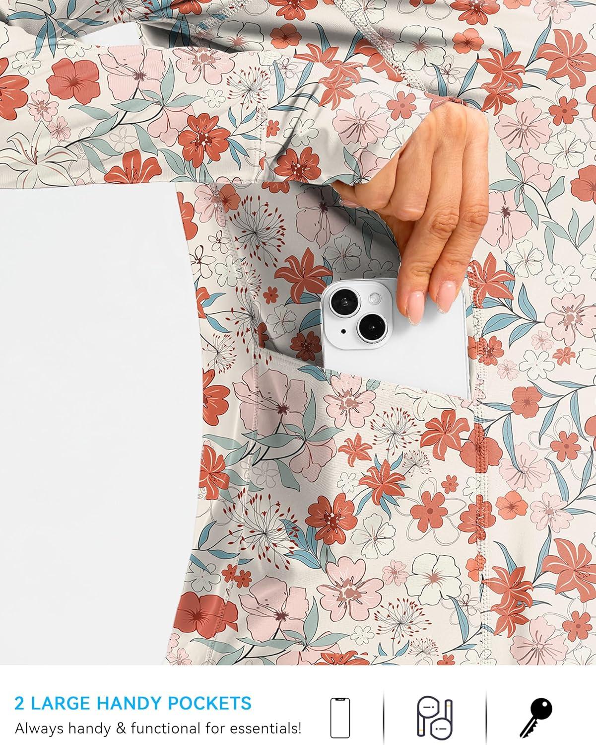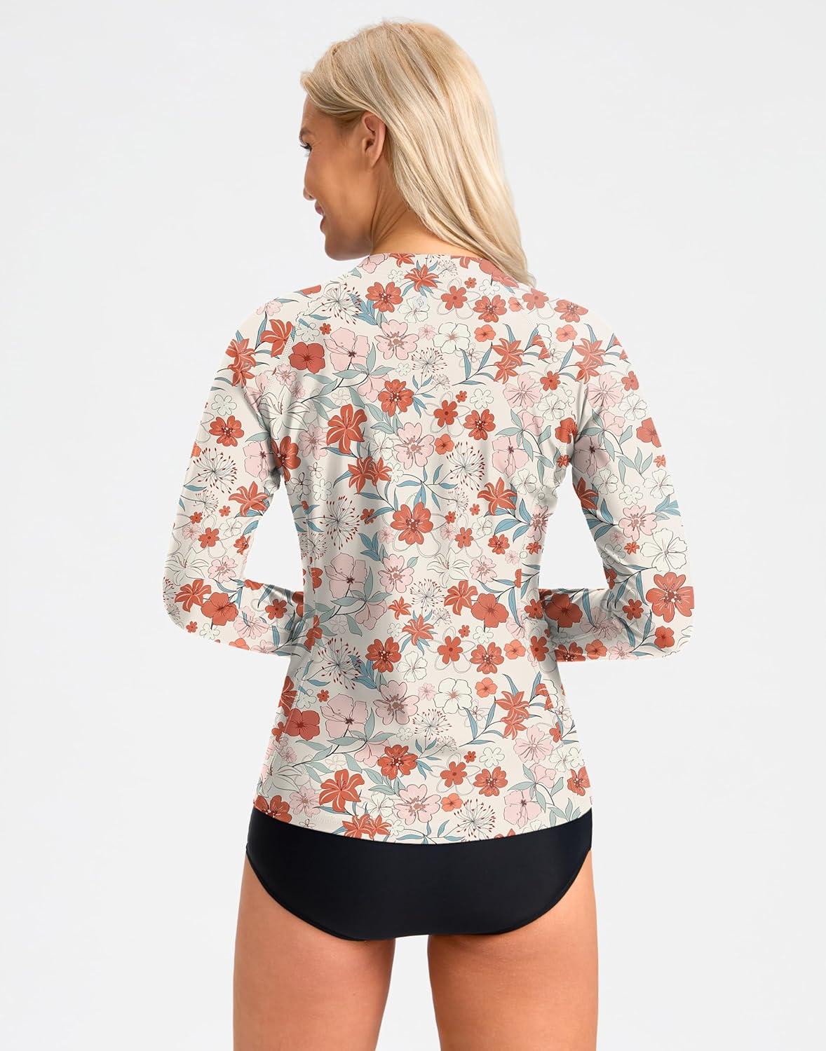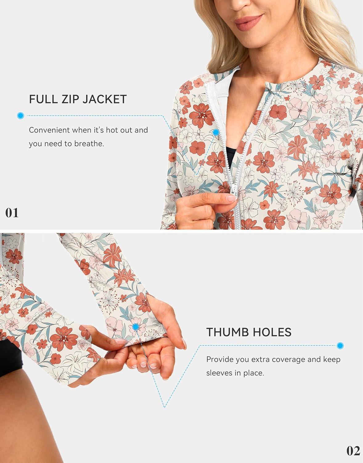 SANTINY Women’s Rash Guard Zipper Pockets UPF50+ Sun Protection Long Sleeve Swimsuit Top Zip Front Swim Shirt for Women(White Floral)