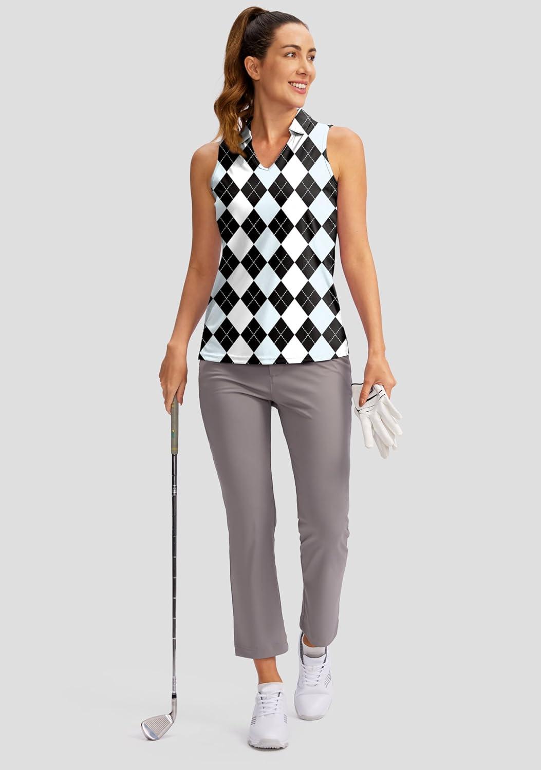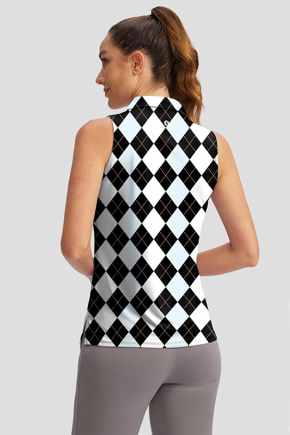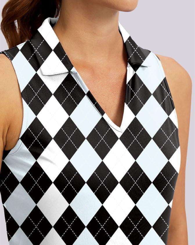 SANTINY Women’s Sleeveless Golf Shirt V-Neck Tennis Tank Tops Collared Golf Polo Shirts for Women(Blak Blue Argyle)