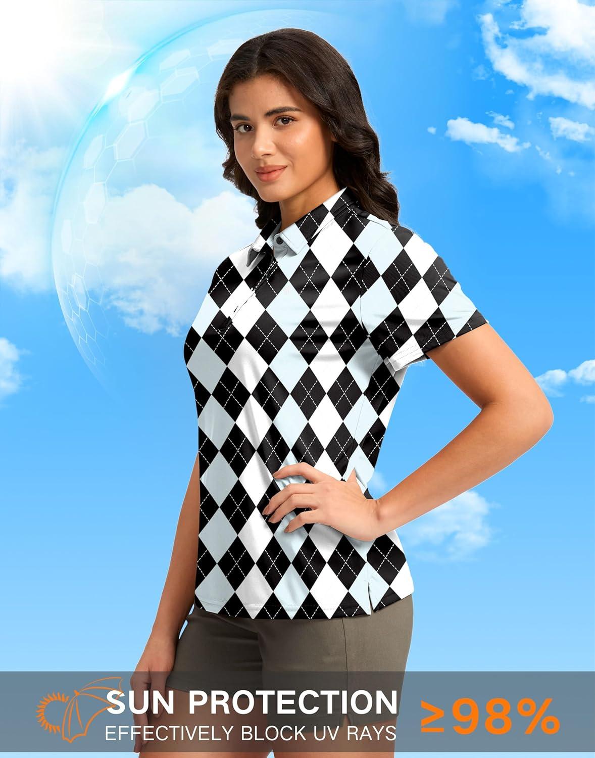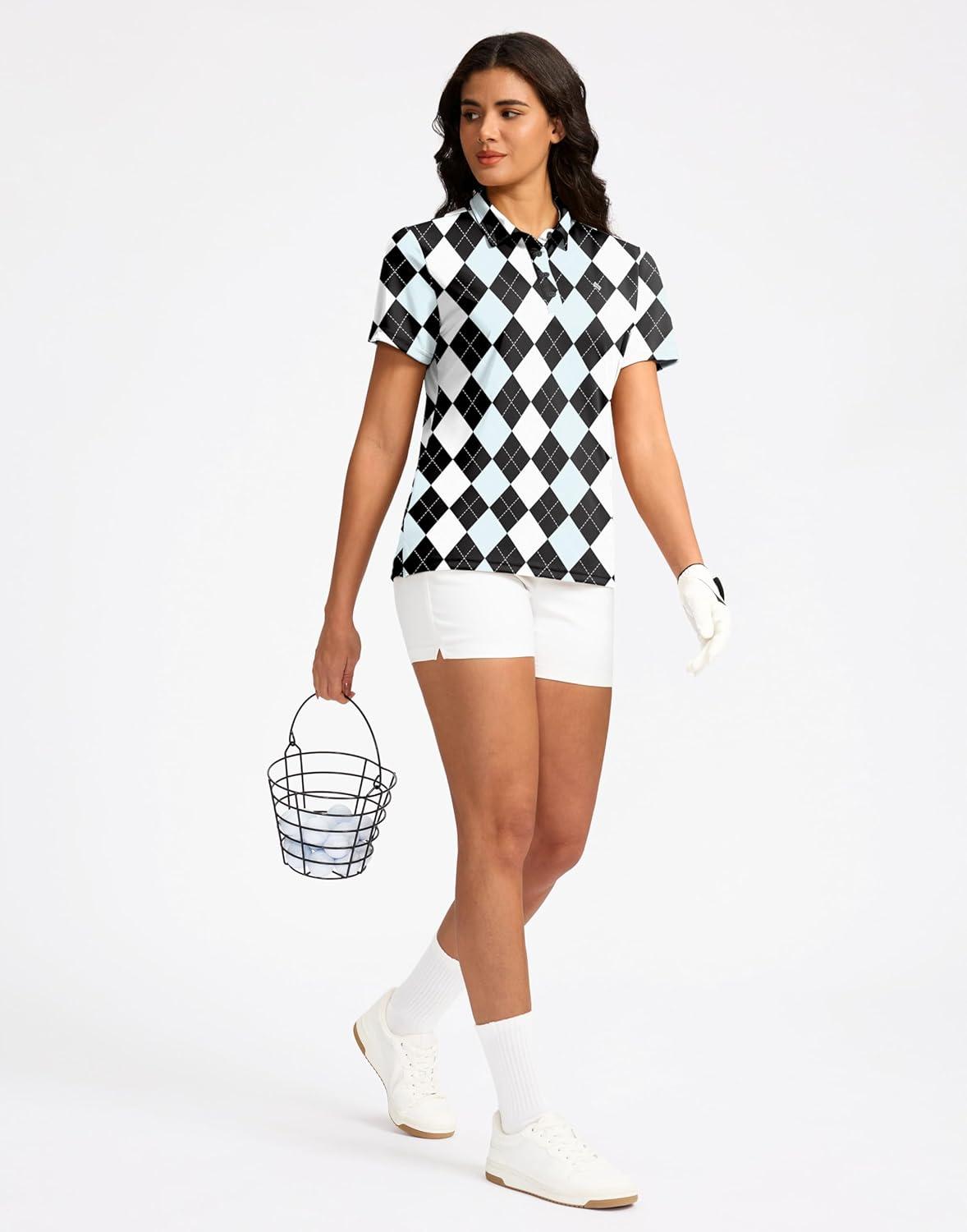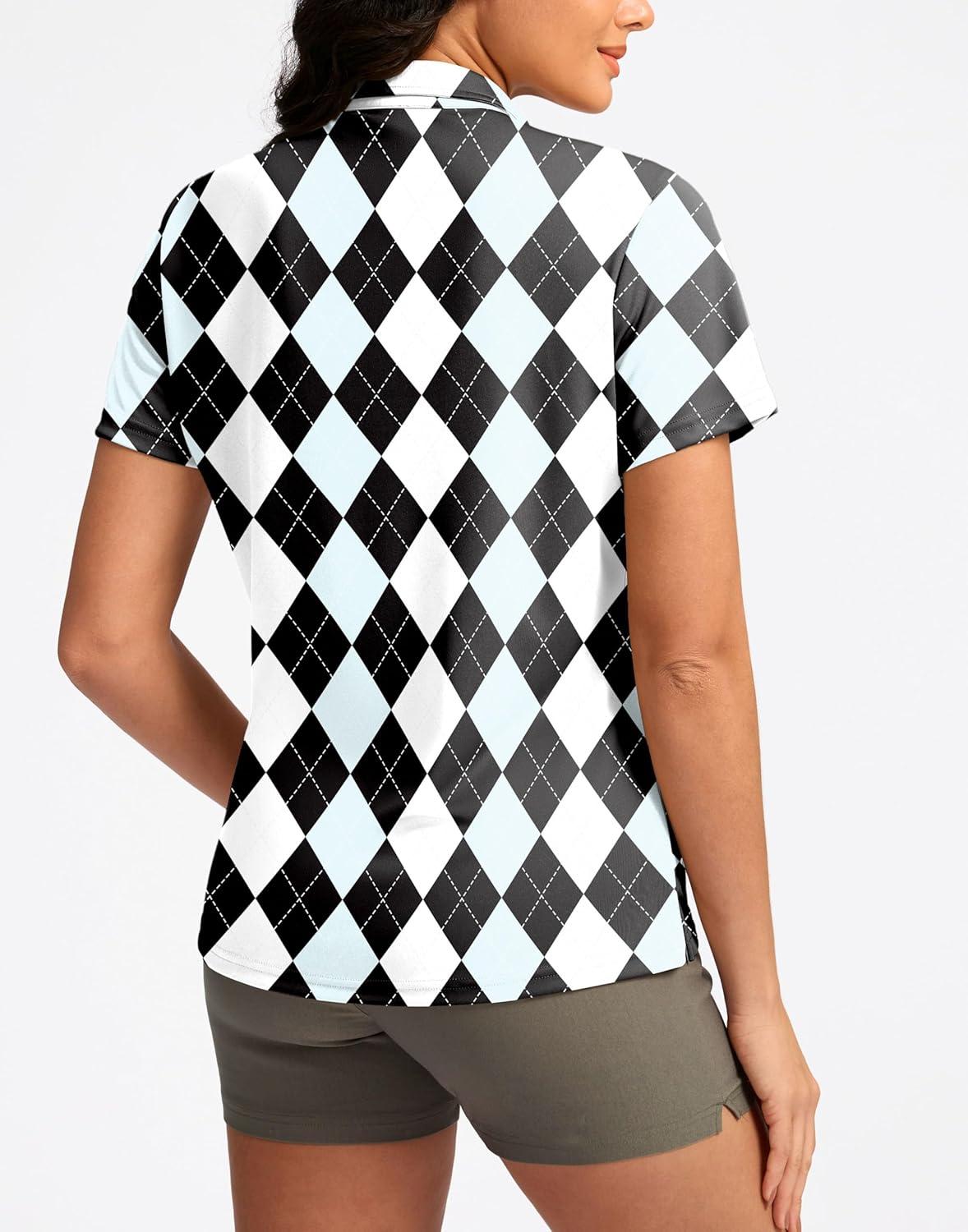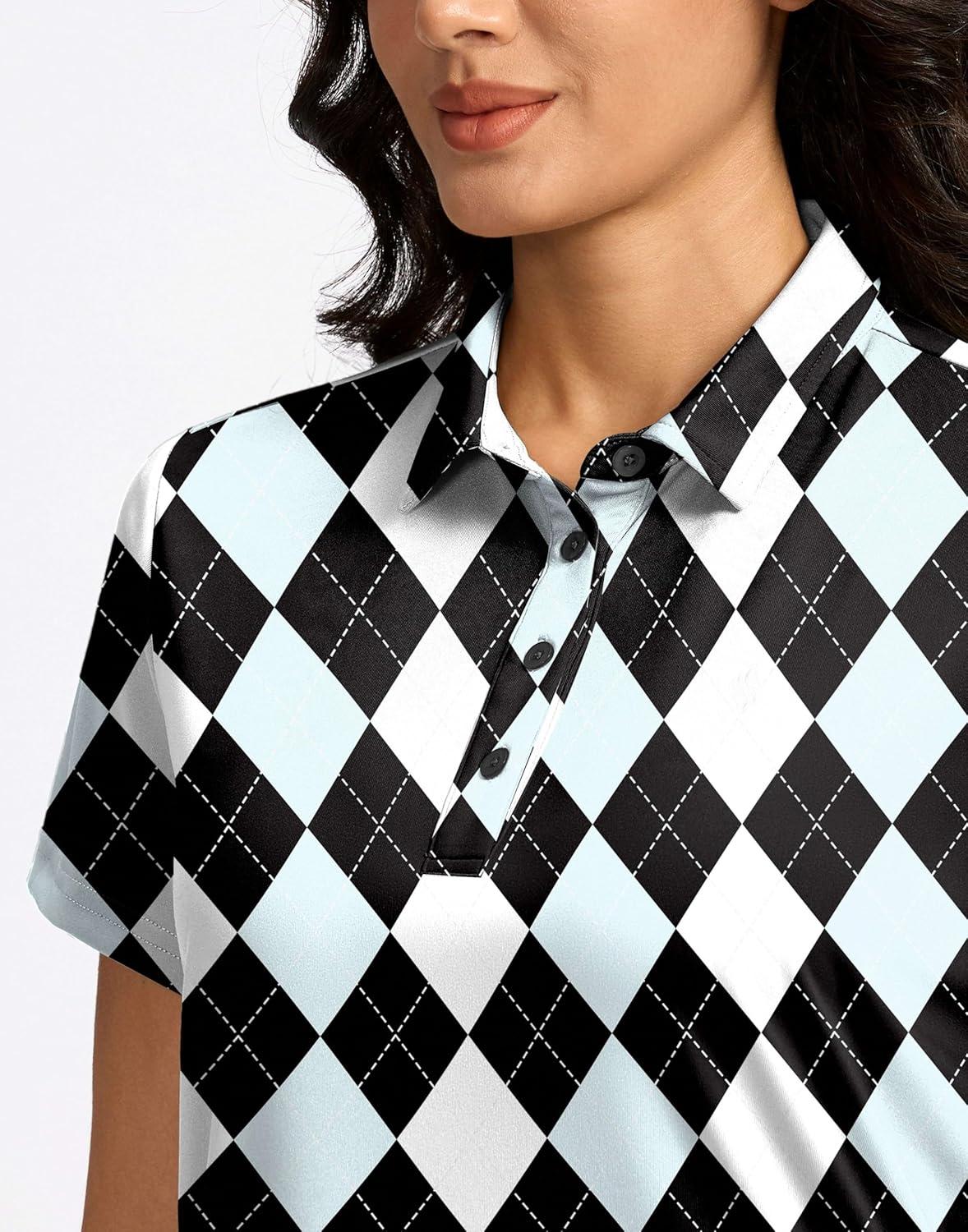 Women’s Golf Shirt Short Sleeve Lightweight Moisture Wicking Work Tennis Tops Collared Polo Shirts for Women with 4-Button(Black Blue Argyle)